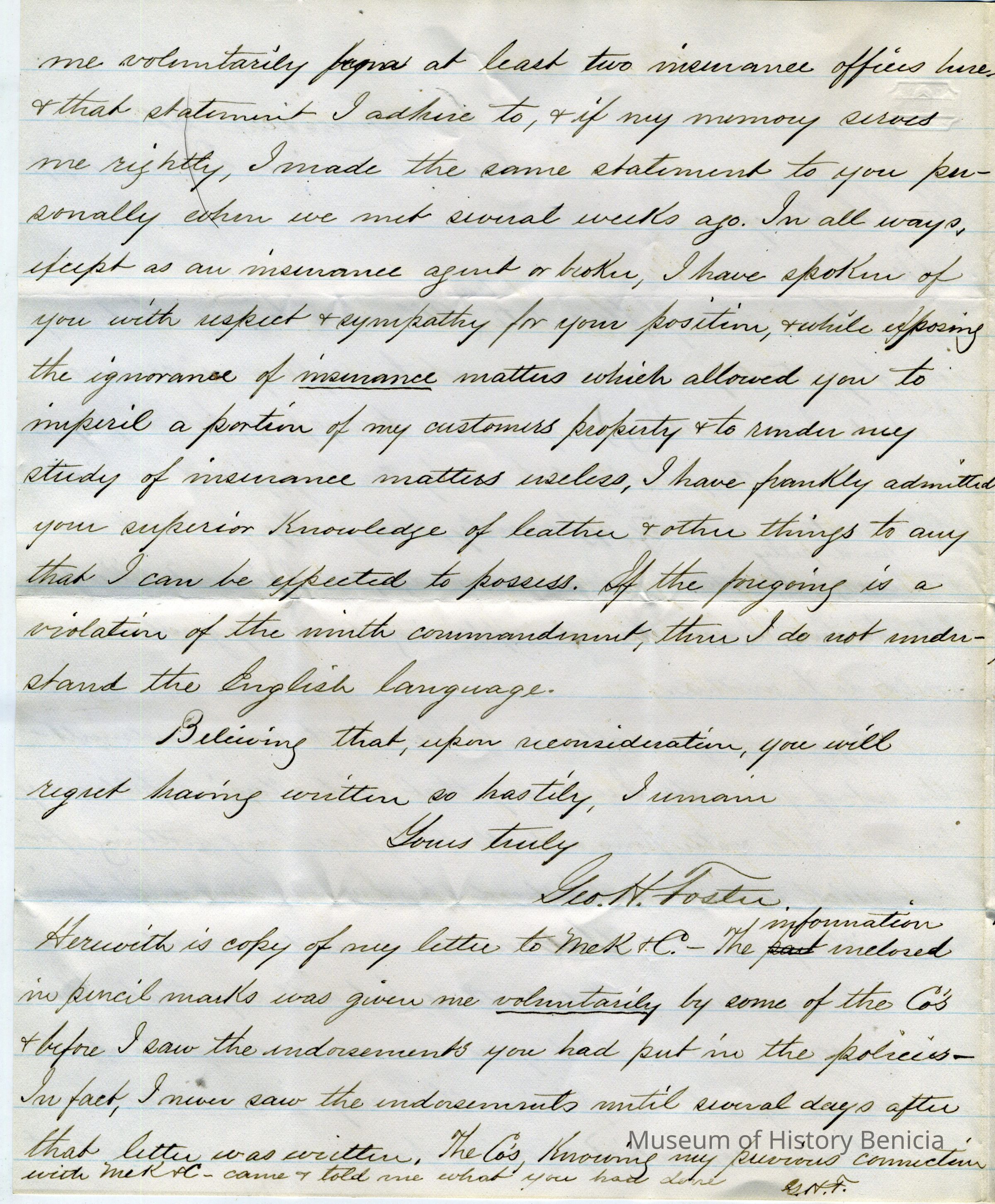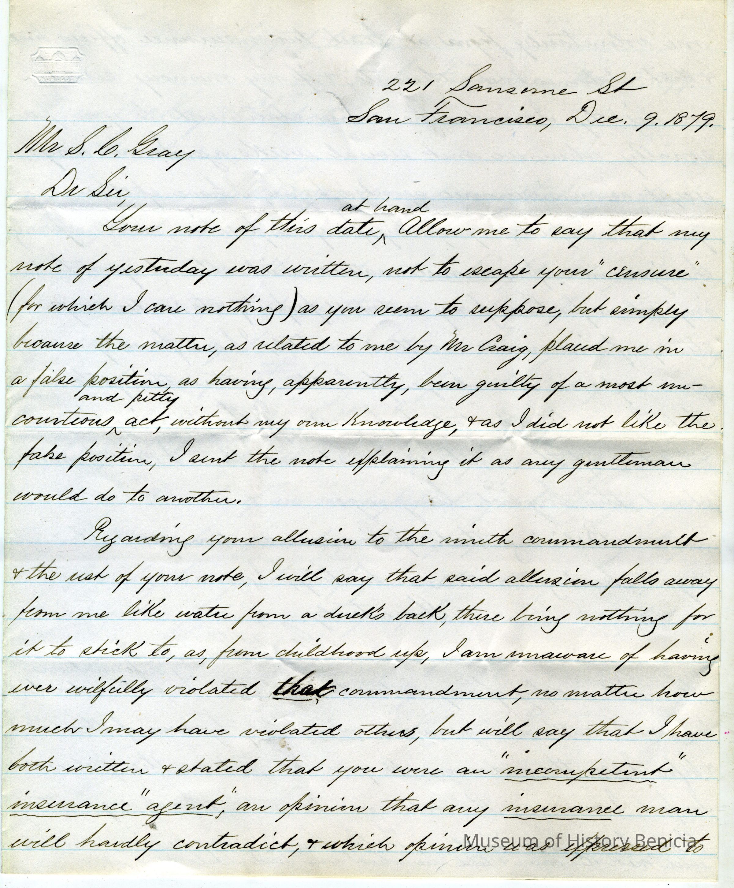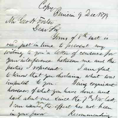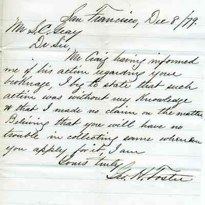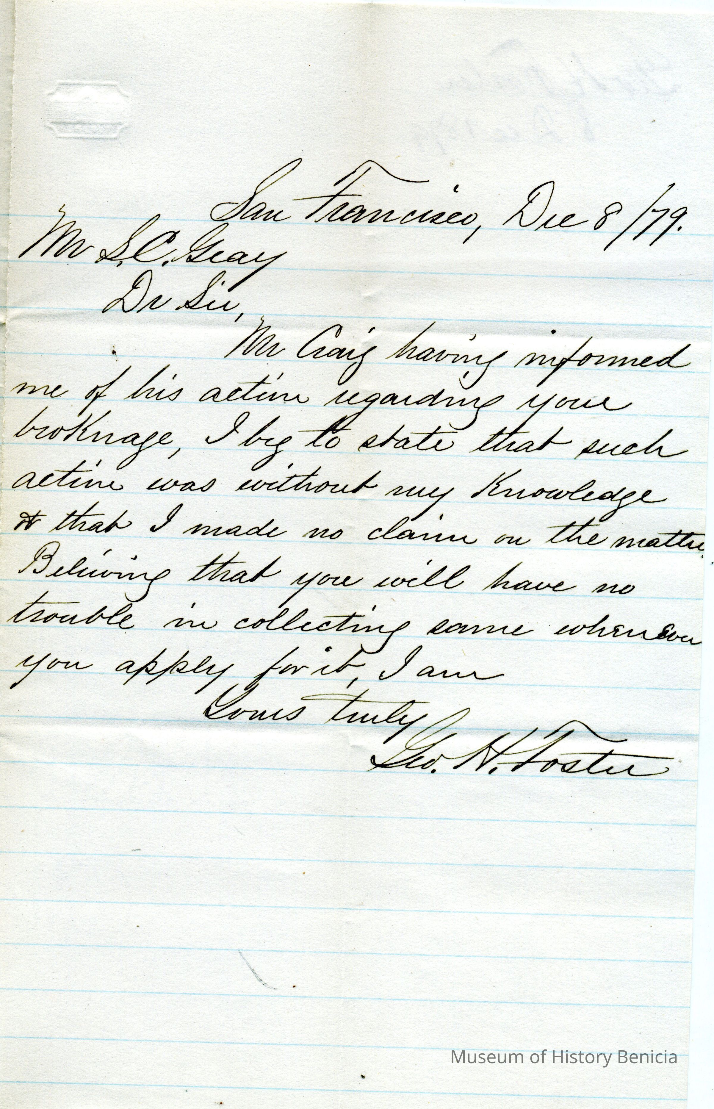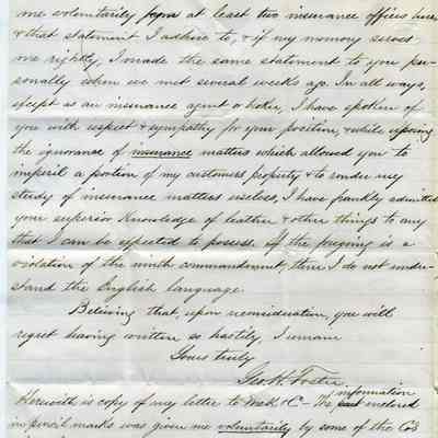 There are two letters in this record. One is from Samuel C Gray to George H Foster dated 12/08/1879. The other is the note sent by Mr. Foster dated 12/08/1879. They involve a dispute between the two Insurance Representatives regarding Mr. Gray being accused of poaching clients from Mr. Foster.Collection