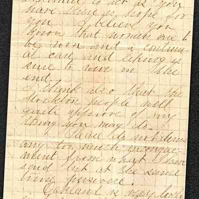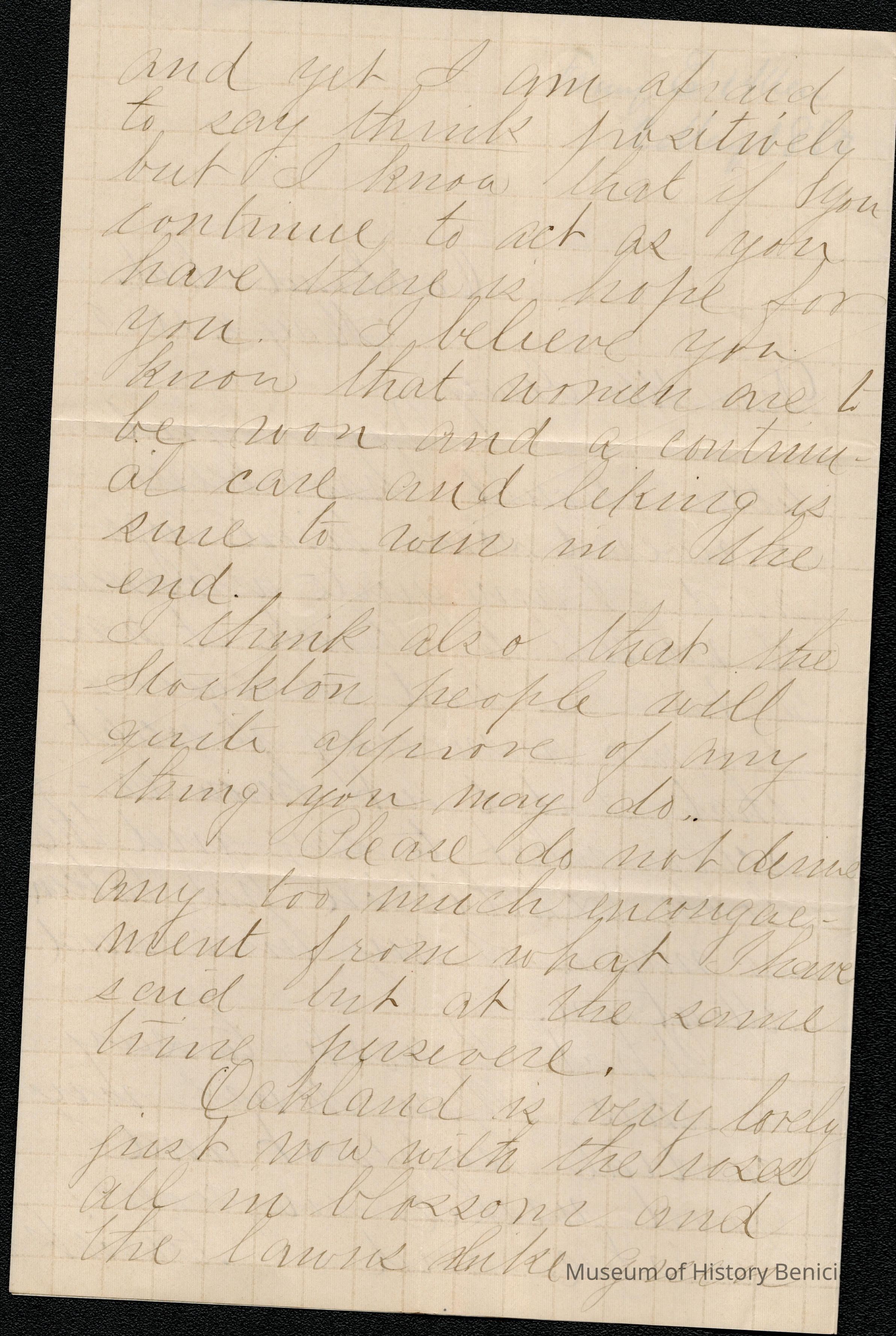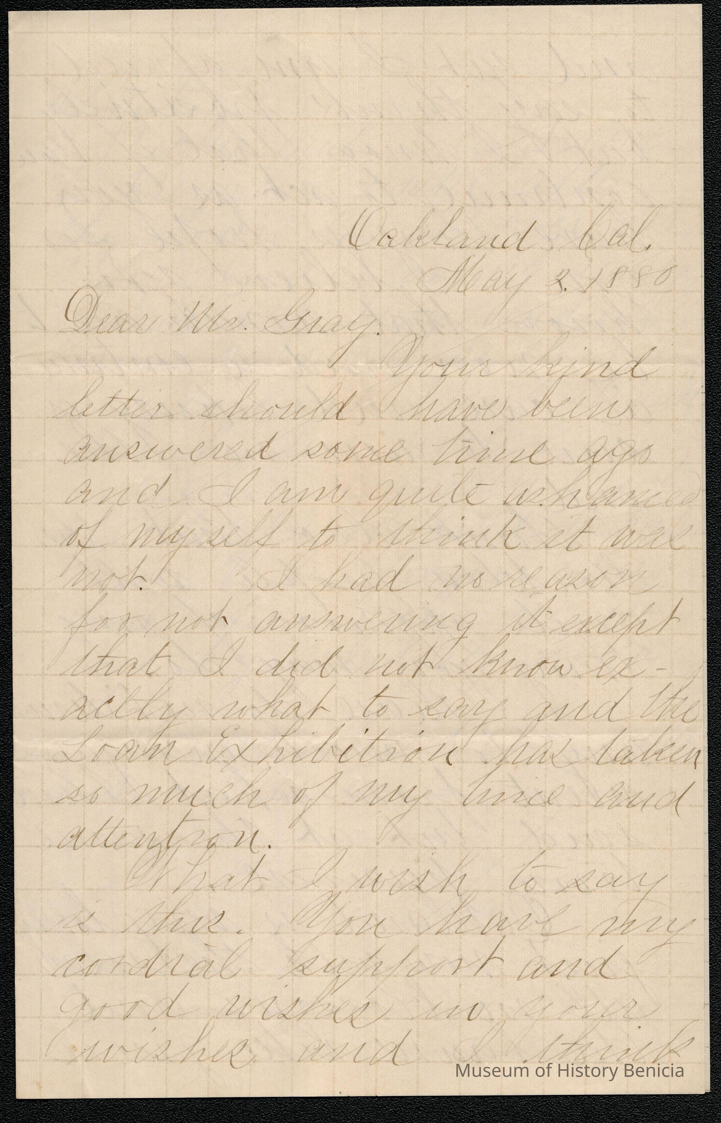 This is a letter dated 05/02/1880 from Fanny Allen to Mr. Gray. Ms. Allen is in Oakland but also writes about something in Stockton. She gives advice about how to "win" a woman and at the end asks to be remembered to all the family.