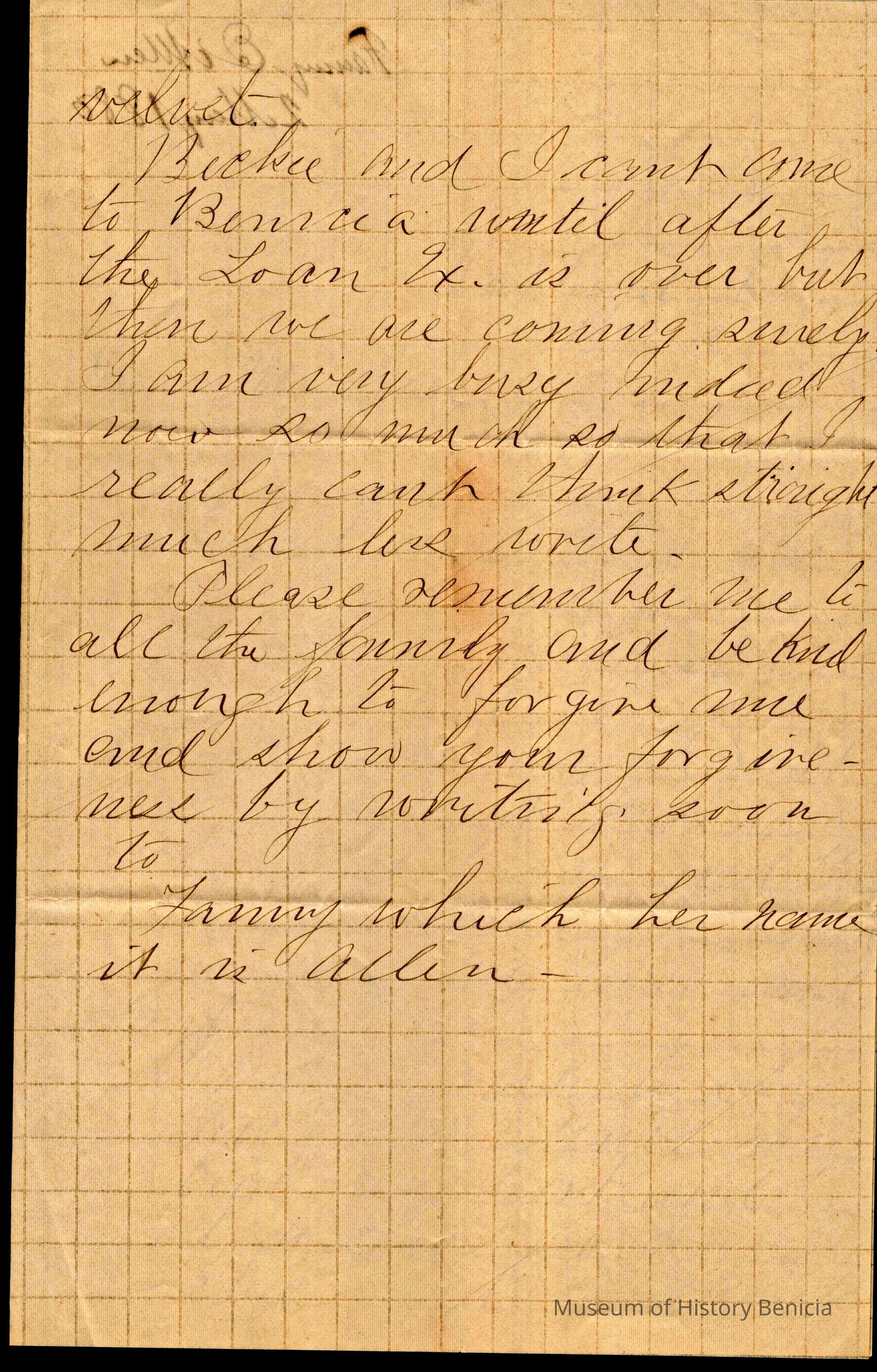 She is busy with a "Loan Exhibition" which is an exhibition of items loaned to be displayed in this case at the Walker Mansion in Oakland. Miss Allen is working in the "library" section of the exhibit as is Theodore Gray (1855 - 1941). This letter may have been sent to Theo rather than Samuel C Gray.