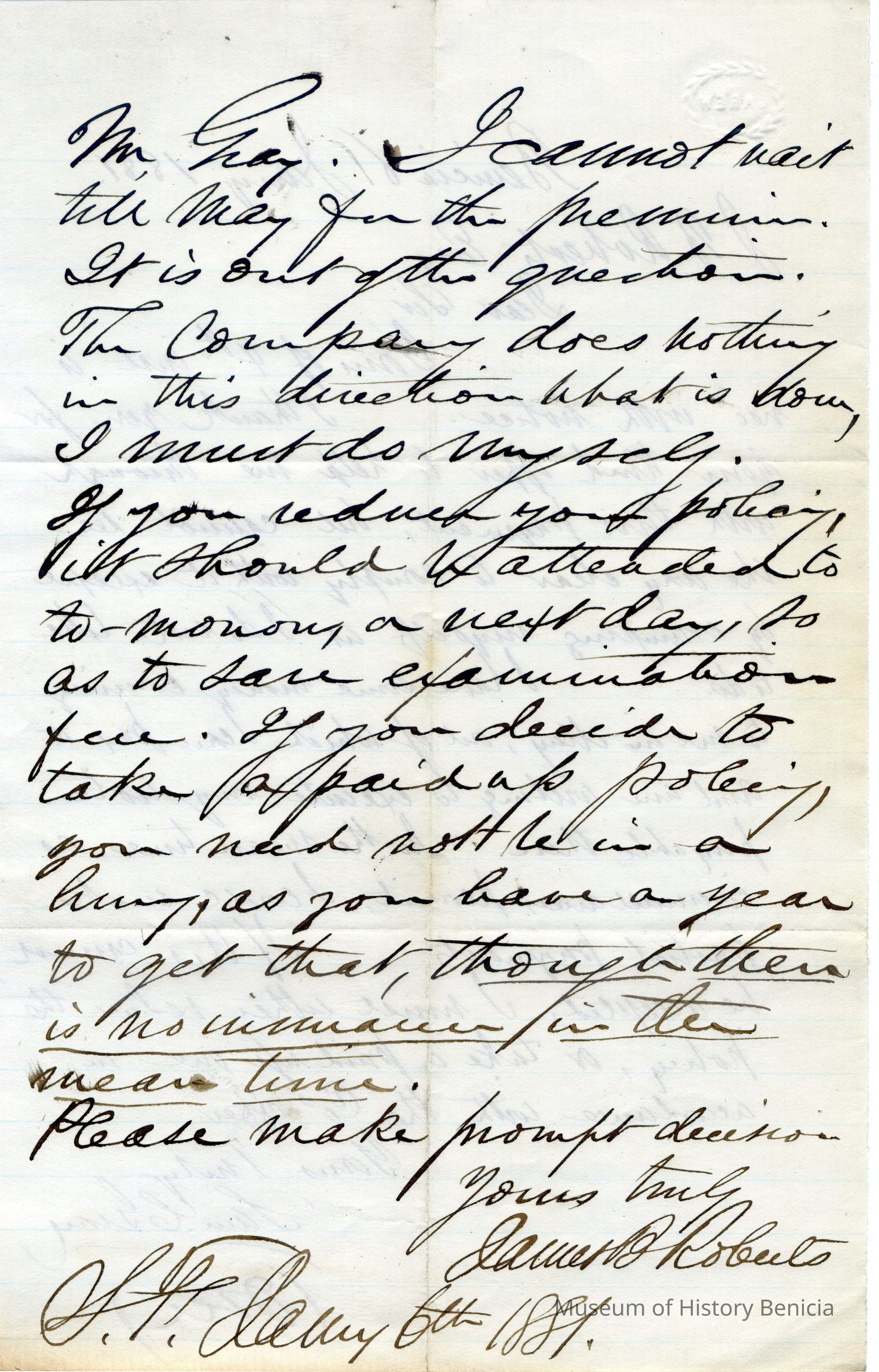 The image depicts a handwritten letter from Mr. Gray in Benicia dated January 6, 1881, addressed to J.B. Roberts, Esq. He mentions having money due in May and is willing to execute a note payable then. Meanwhile, he proposes making partial payments as circumstances allow. Mr. Gray adds that if this proposition is not acceptable, he must either relinquish the policy or accept a paid up one as per the company's terms. The letter is signed by Sam'l Gray