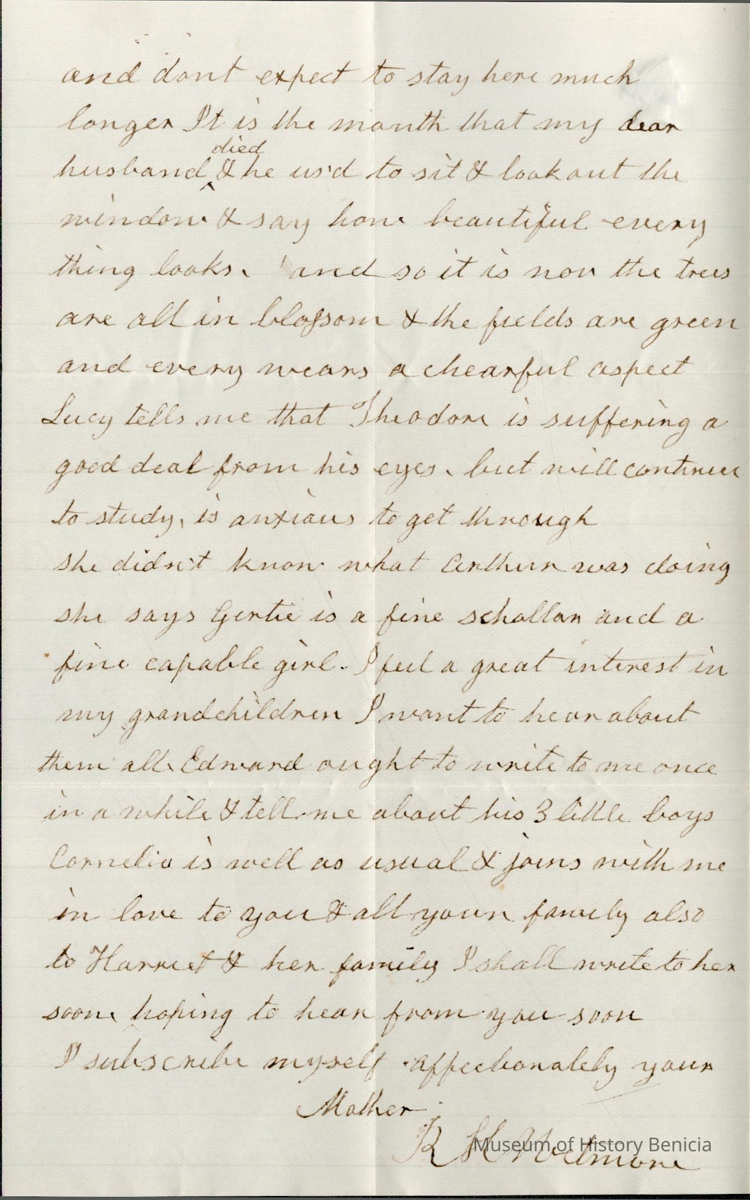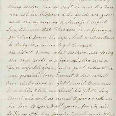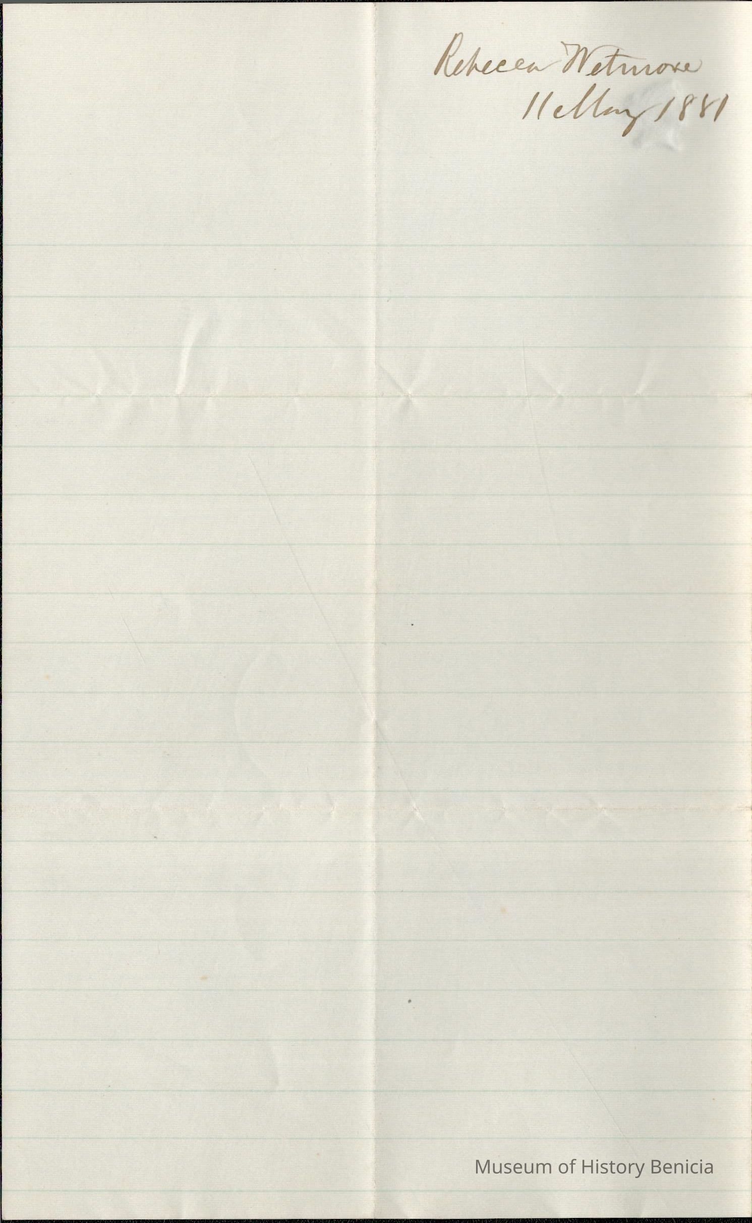 She says she is glad that Lucy came back to them and wishes she could have poor "Chan" too. (Not certain but this could refer to Lucy Wetmore (1859 - 1918) the daughter of Henry Wetmore who lived in Fairfield, CA. "Chan" could be Chauncey Wetmore who Rebecca worries about in multiple letters.)