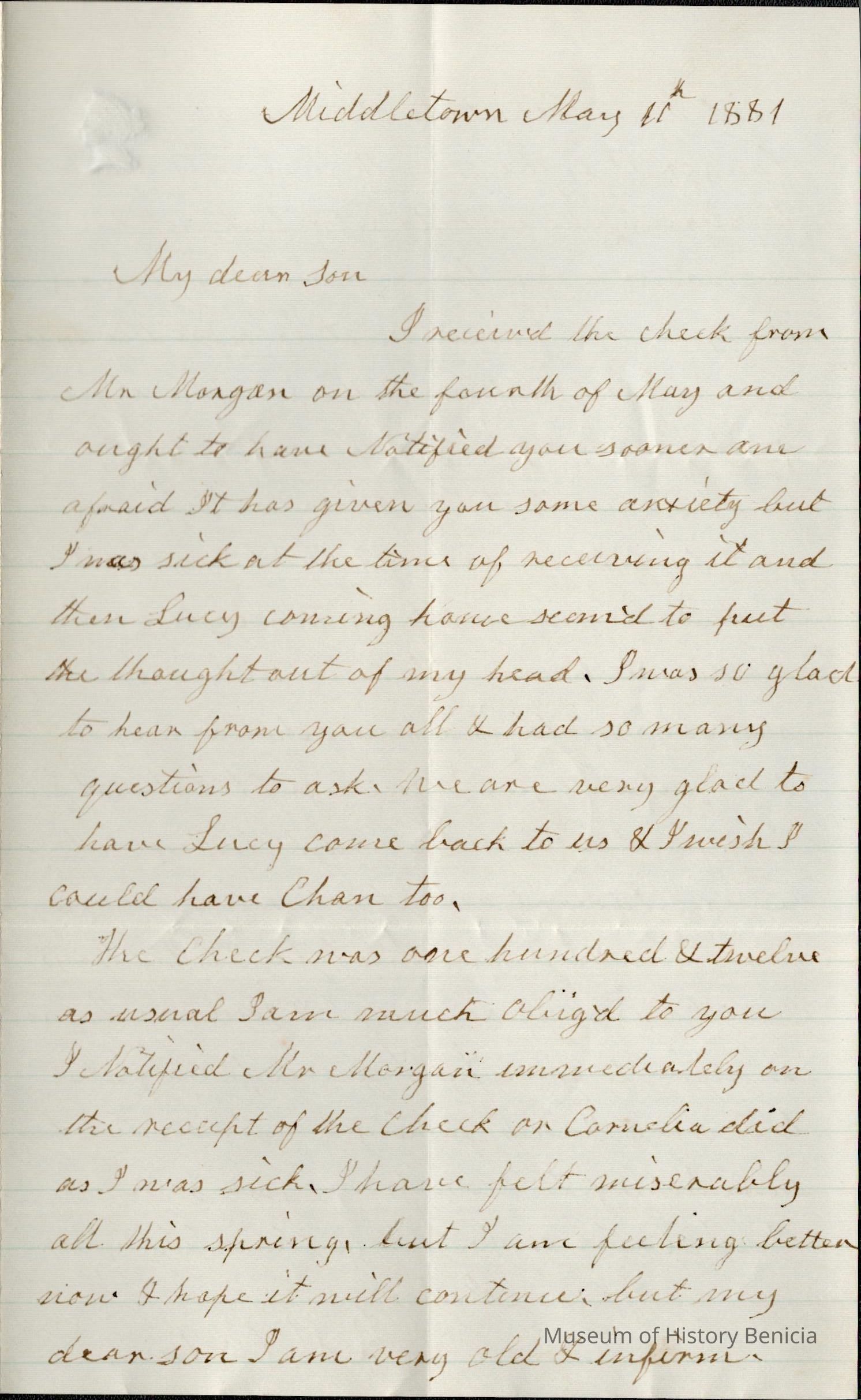 This is a letter dated 05/11/1881 from Mother Rebecca Hubbard Wetmore to Samuel C Gray in Benicia. She is writing to tell Samuel that she received the May check but was sick at the time and is sorry she didn't write to him about it.