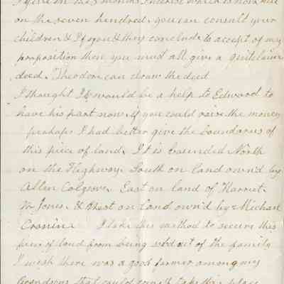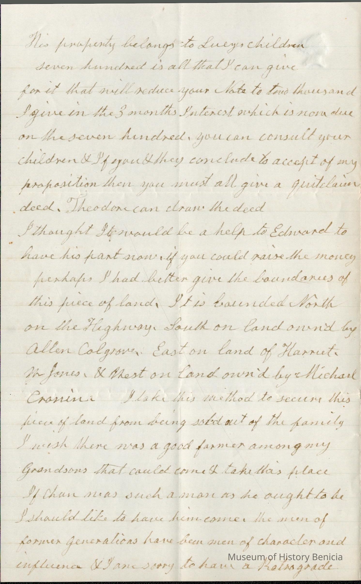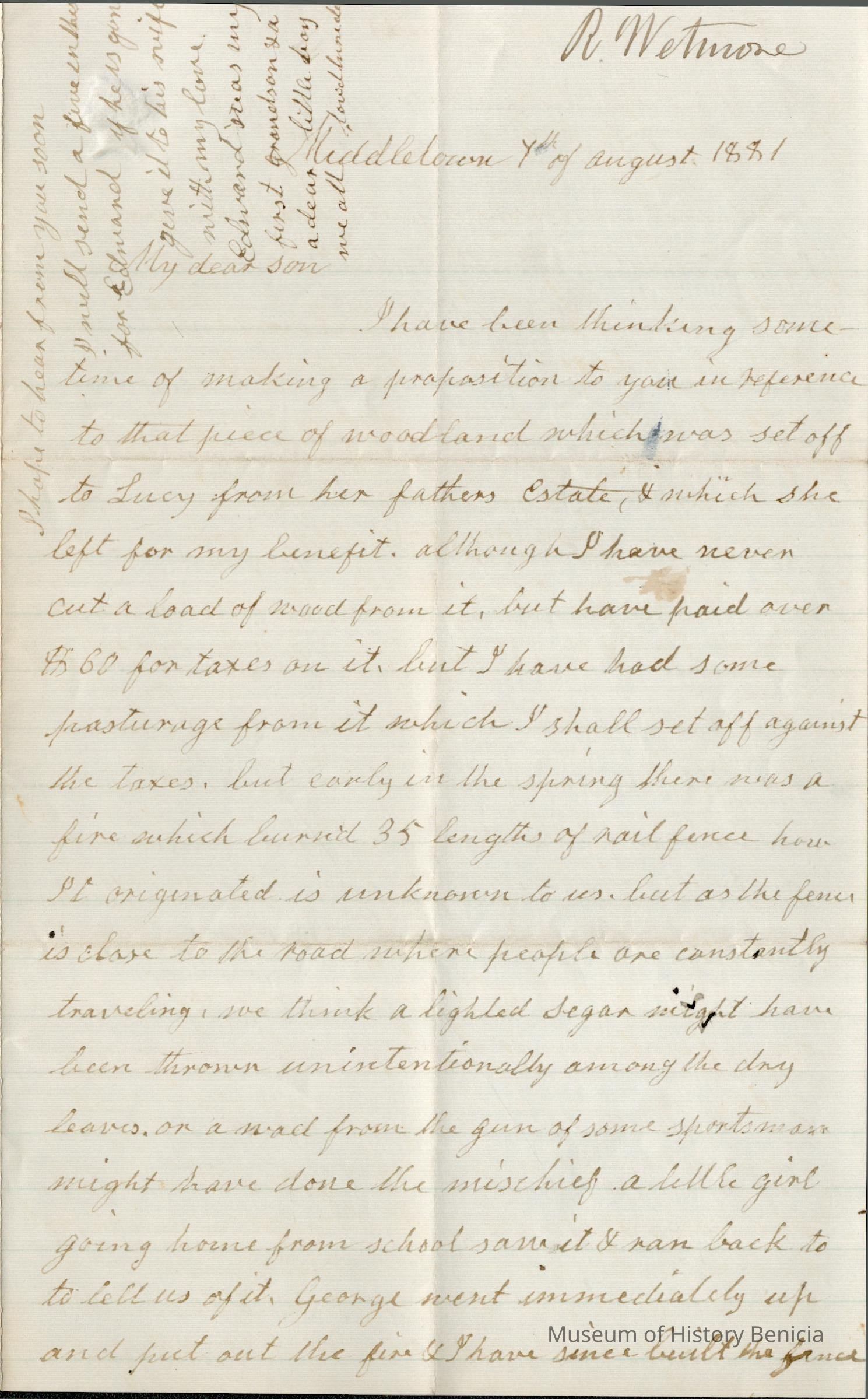This is a letter dated 08/07/1881 from Mother Rebecca Hubbard Wetmore to Samuel C Gray in Benicia. She starts out by offering to buy the wooded land that was left to Lucy Wetmore Gray (Samuel's wife) by Lucy's father. She offers to pay $700 plus to forgive three months interest on the note she holds against Samuel Gray. (That note would then be $2,000.)