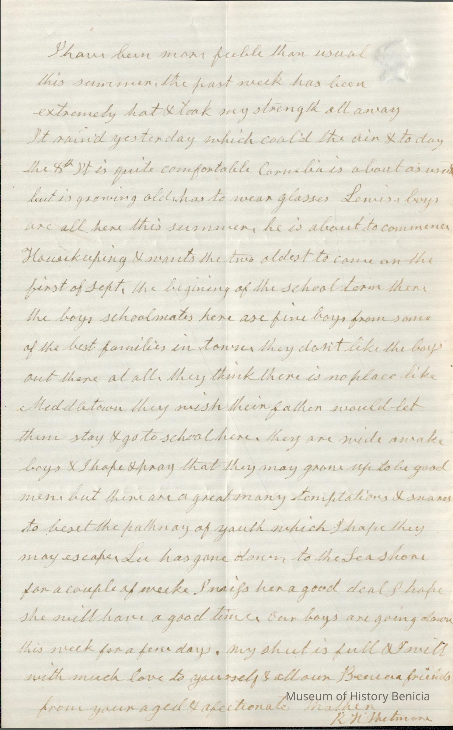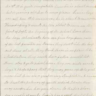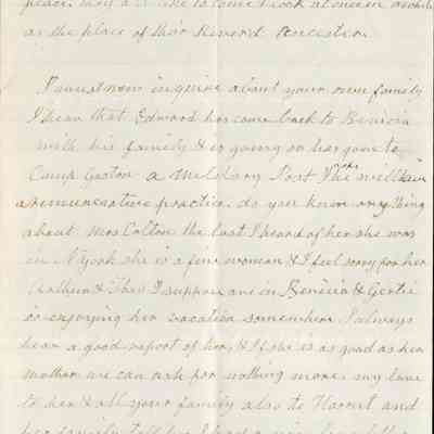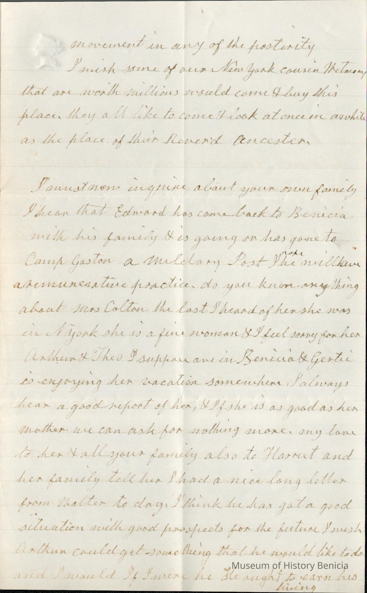 She then talks of family matters. She says she has heard that Dr. Edward Gray and his family are back in Benicia and are headed to Camp Gaston, a military installation to practice medicine. She asks about Mrs. Colton, Harriet (Wetmore Jones) and says she had a letter from Walter. She wishes that Arthur would find something he likes to do and earn his living. She mentions Lewis and his sons.