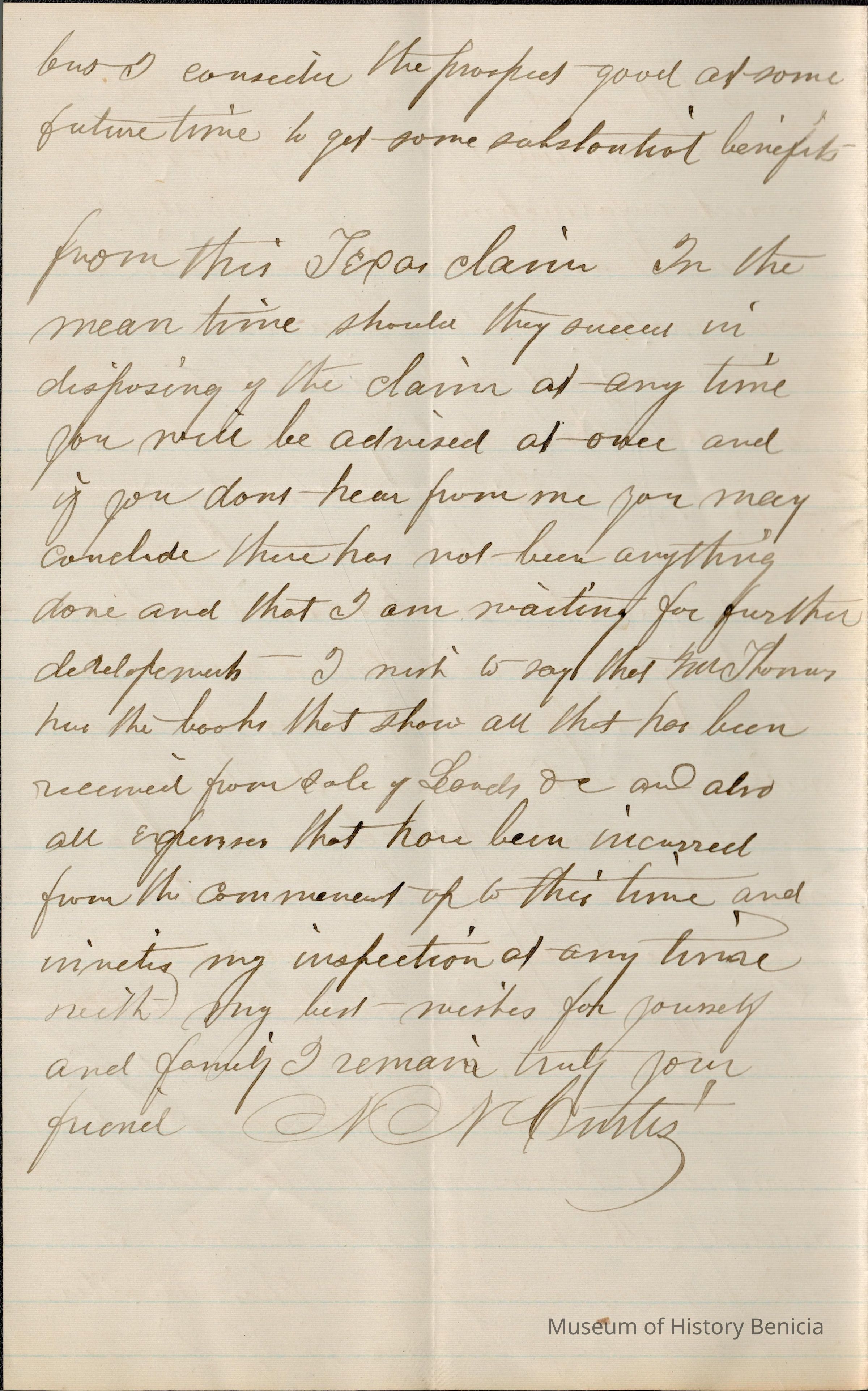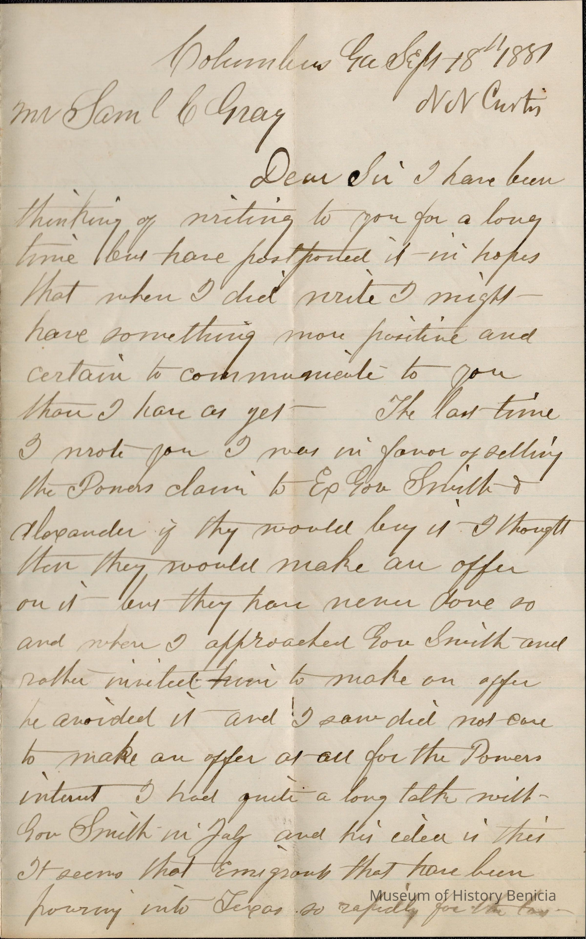 This is a letter to Samuel C Gray from N. N. Curtis dated 09/18/1881 regarding property of Samuel's Uncle in Texas. The letter talks about possibly selling 400 acres of land in Kinney County Texas (Central Texas West of San Antonio.). In a future letter Mr. Curtis does propse selling the 400 acres (2024.10.1.217) for about $1 per acre. That letter has more details about the Texas land.