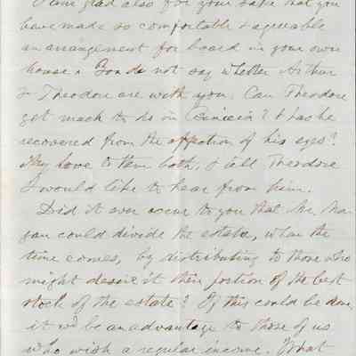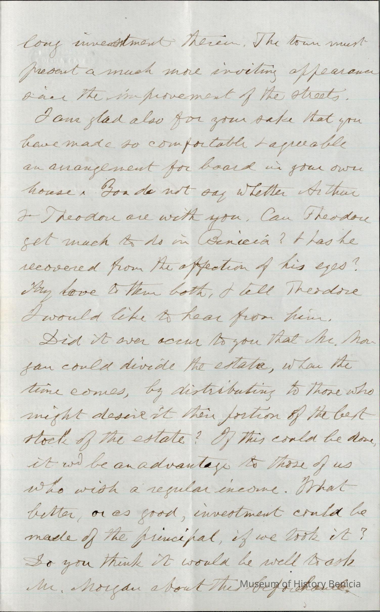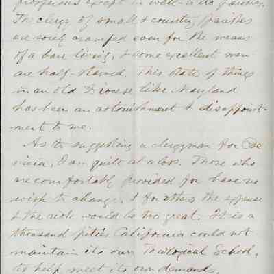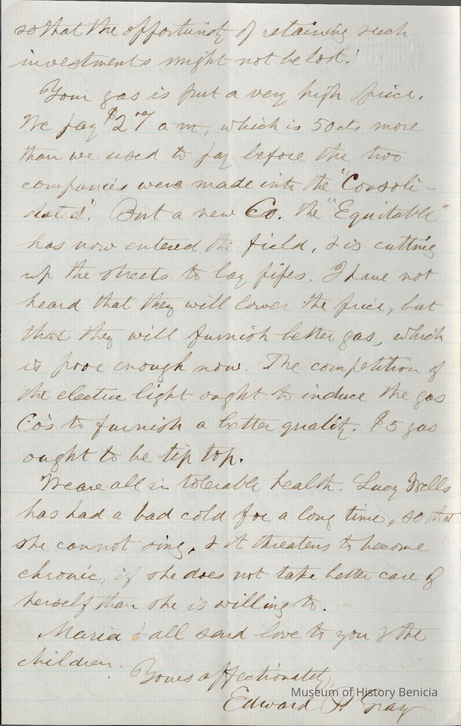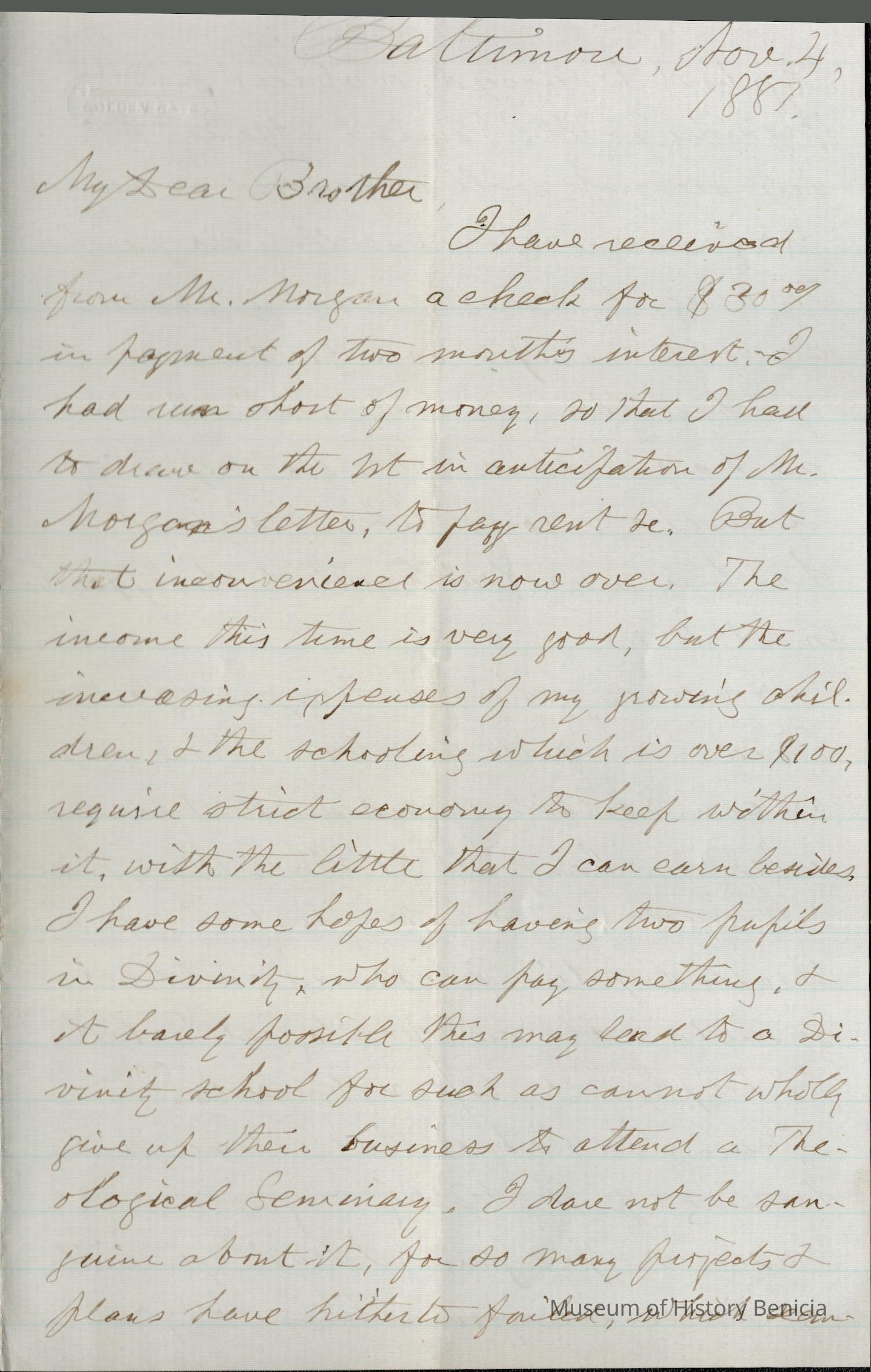 This is a letter dated 11/04/1881 from Mr. Edward Powers Gray to Mr. Samuel C. Gray regarding mainly financial matters. Edward talks of his strained finances and the prospect of opening a Divinity School. Samuel has evidently asked Edward for a recommendation of a Rector for St. Paul's church in Benicia. Edward can't think of someone who would like to relocate and says it is too bad California doesn't have its own Theological school. He does comment on the improvement in Benicia's business environment and the improvement in their streets.