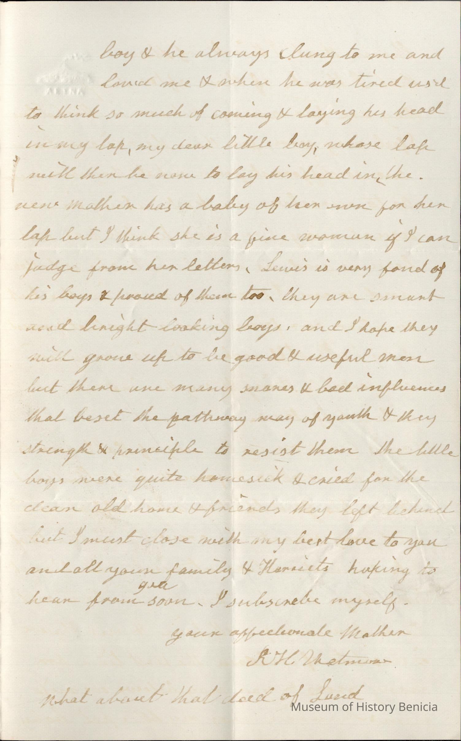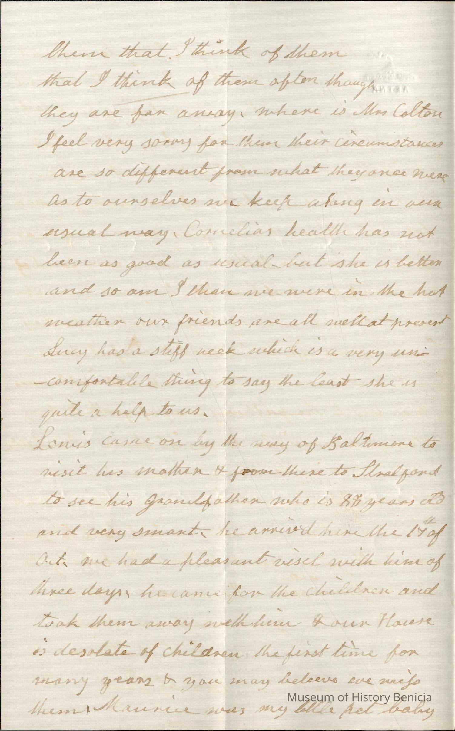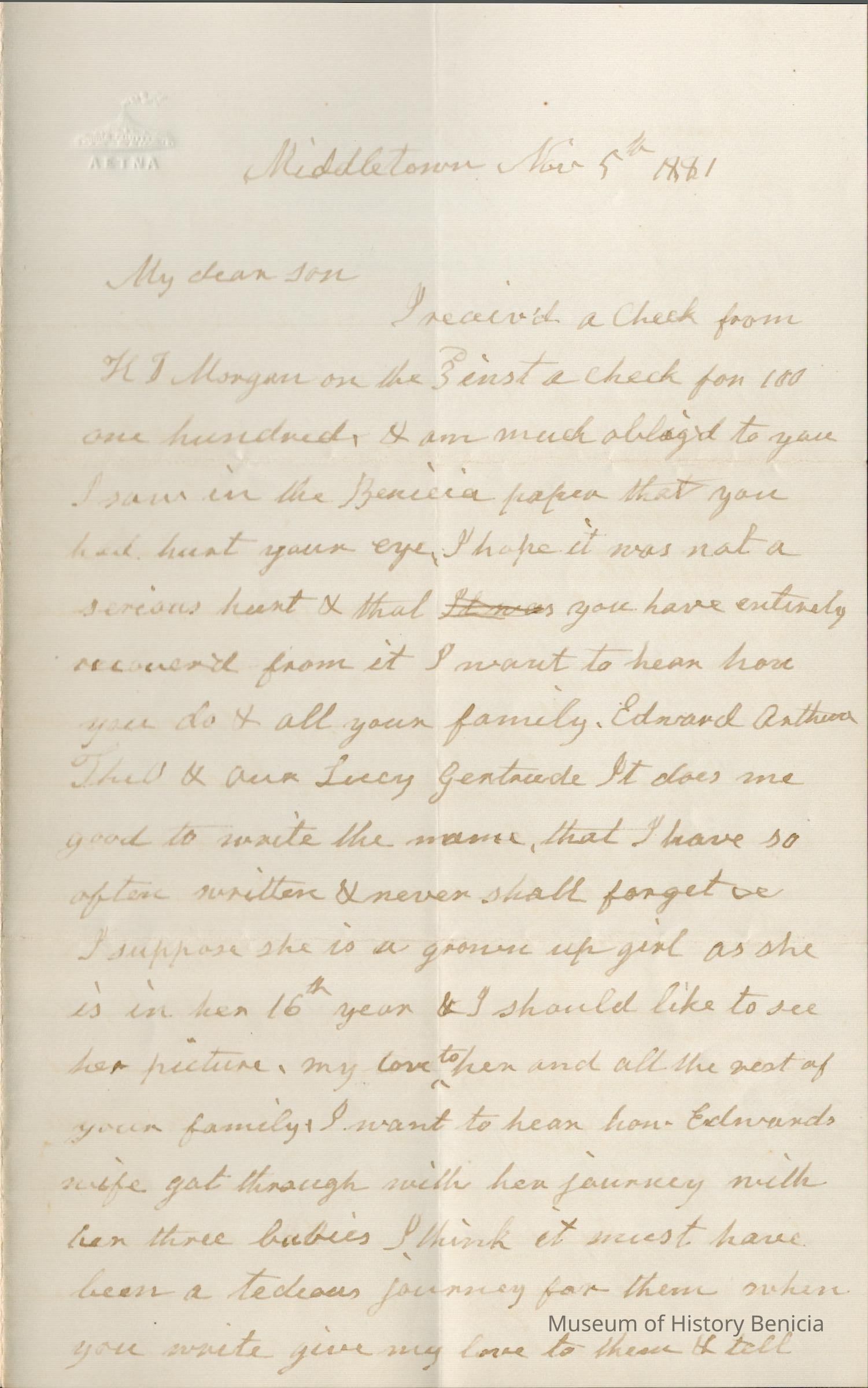 This is a letter dated 11/05/1881 from Mother Rebecca Hubbard Wetmore to Samuel C Gray in Benicia. She starts by thanking Samuel for the check for $100. She then talks mainly of various family members and how they are doing.