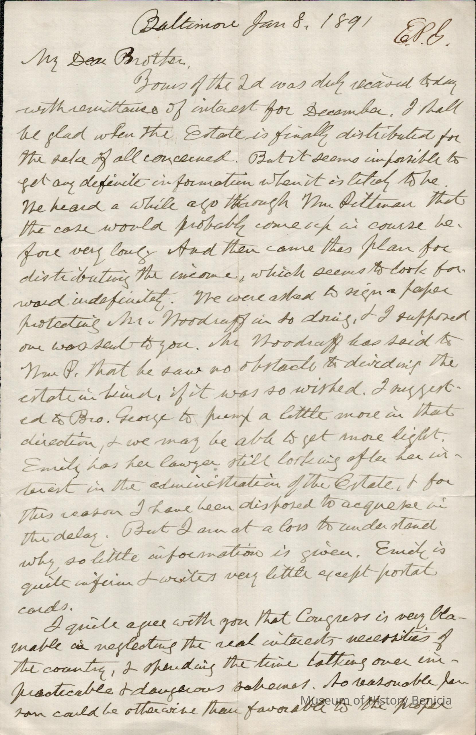 This is a letter dated 01/08/1891 from Mr. Edward Powers Gray to Mr. Samuel C. Gray regarding mainly estate matters. He also blames the US Congress for neglecting the real interests to the country. Lastly, he mentions that his daughters are beck to teaching.