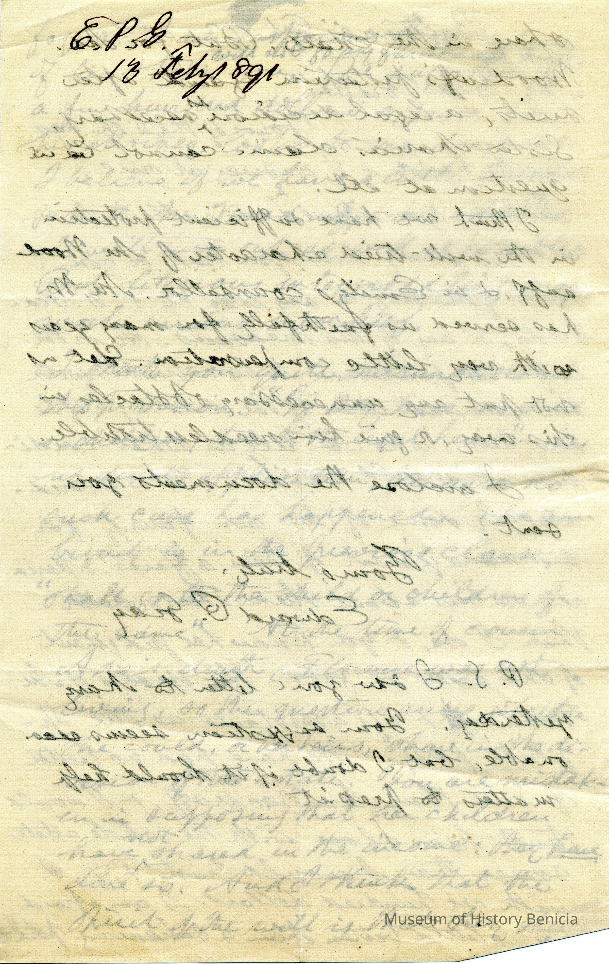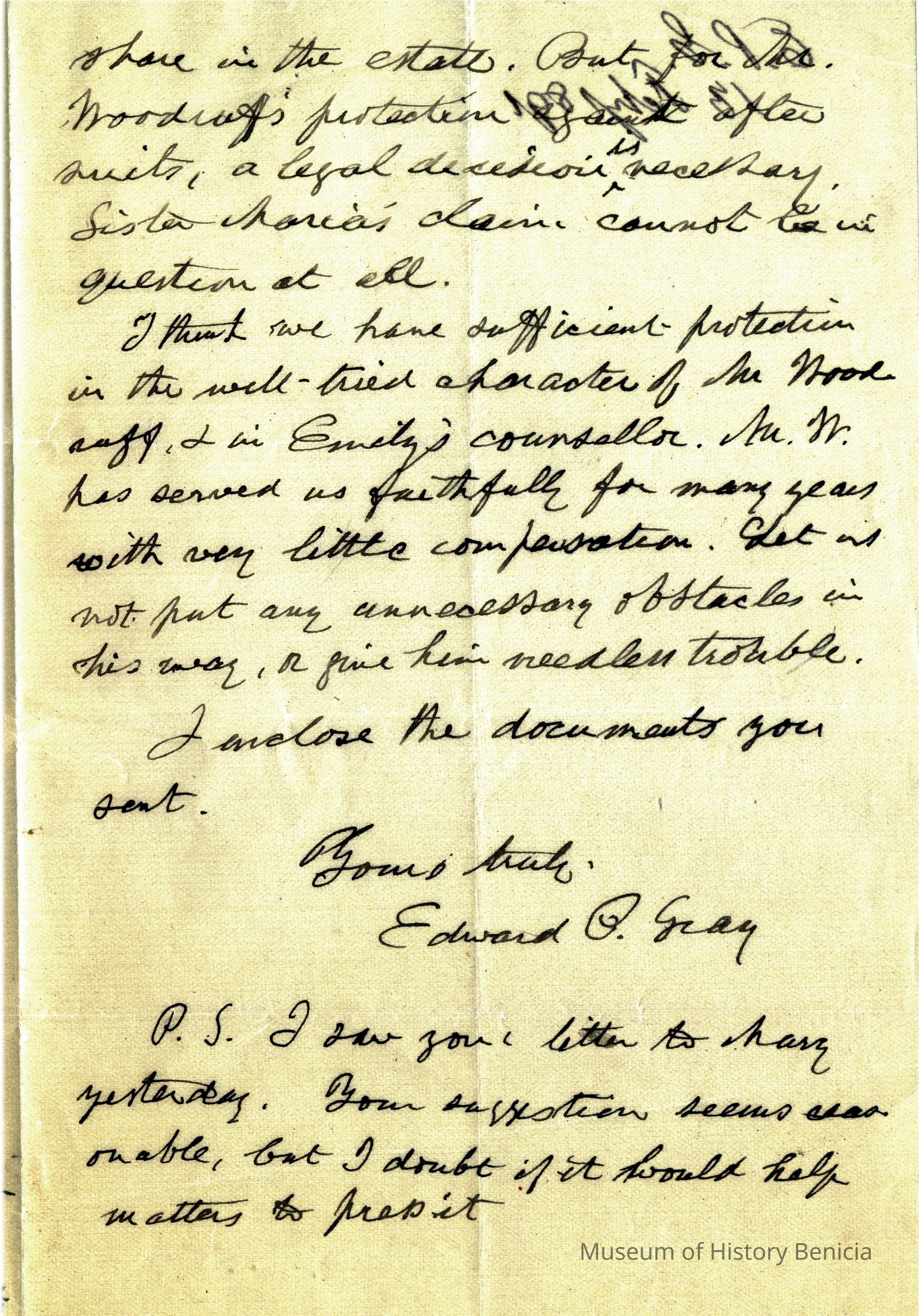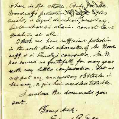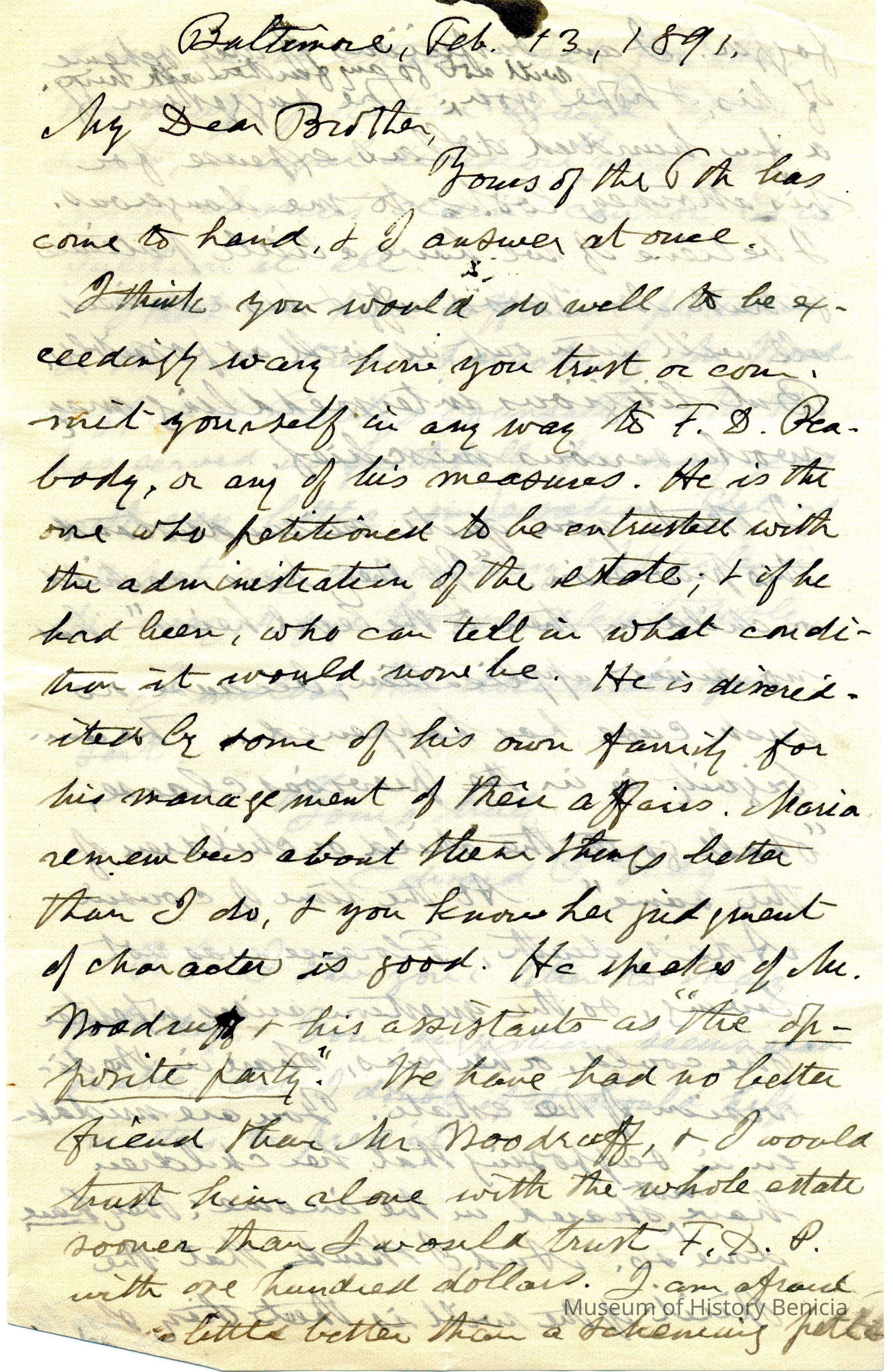 This is a letter to Samuel C Gray from his brother Edward P. Gray (1822 - 1902) dated 02/13/1891. The letter warns Samuel to not trust F.D. Peabody. He says that their sister, Mary, remembers him and also doesn't trust Mr. Peabody. Edward says he trusts Mr. Woodruff much more than Peabody with the estate. Not sure who's estate is in question.Collection