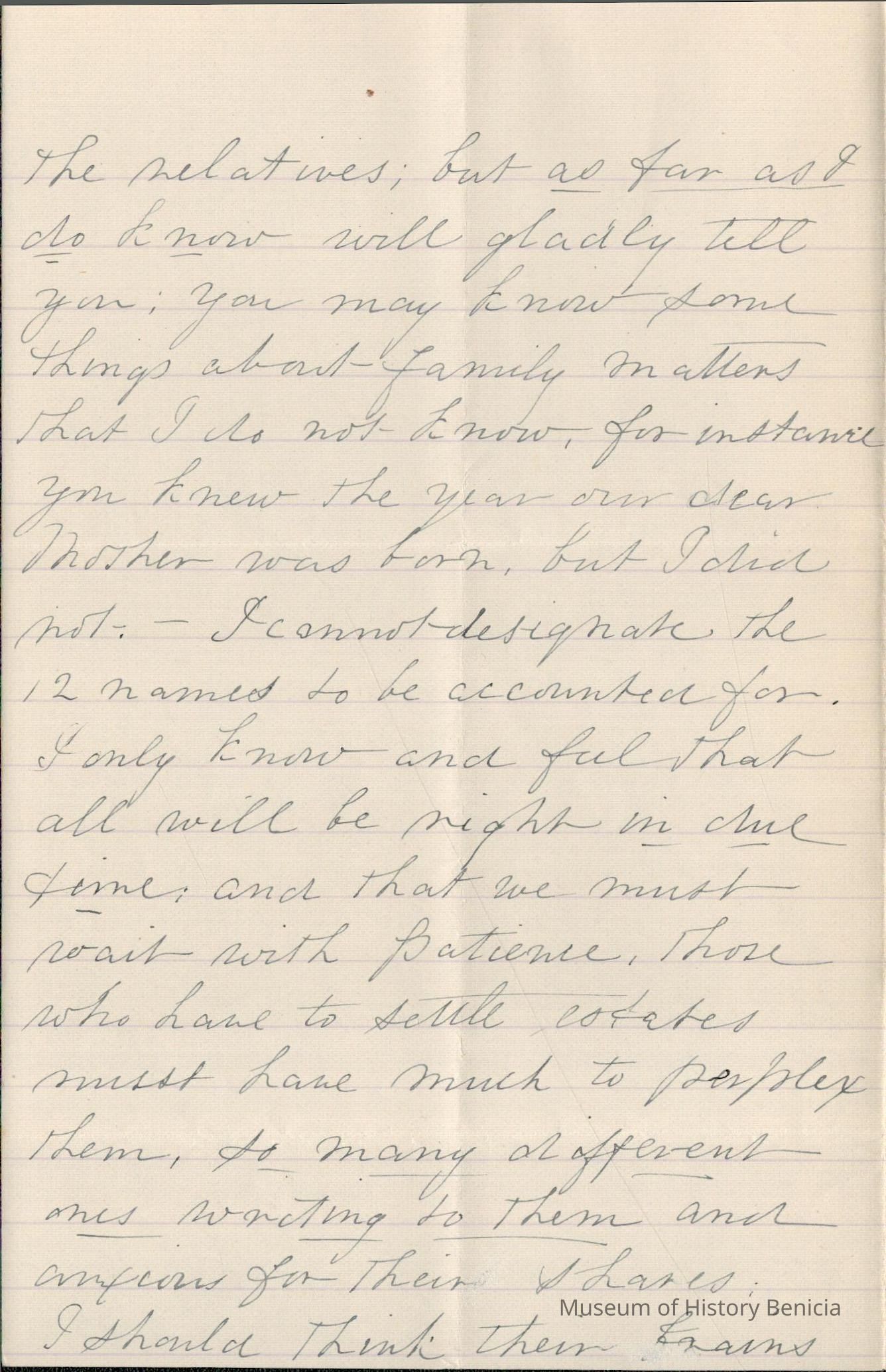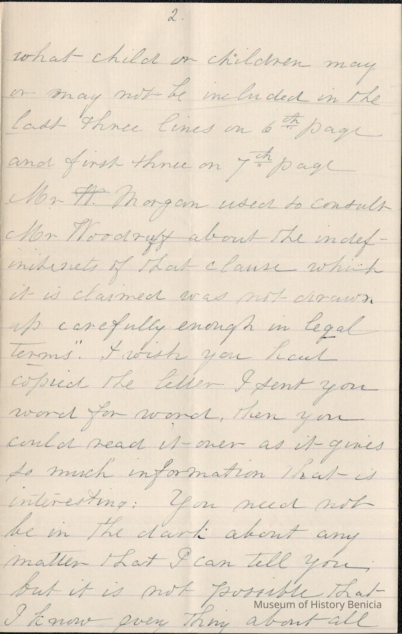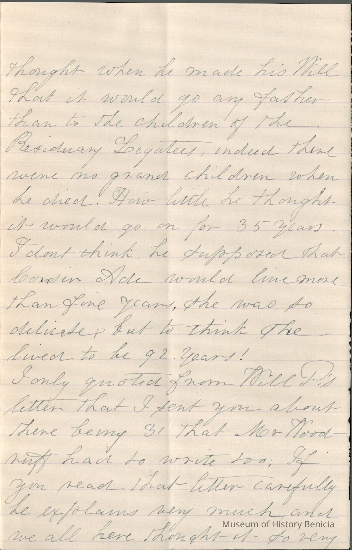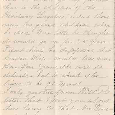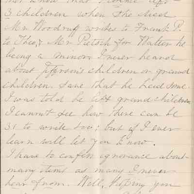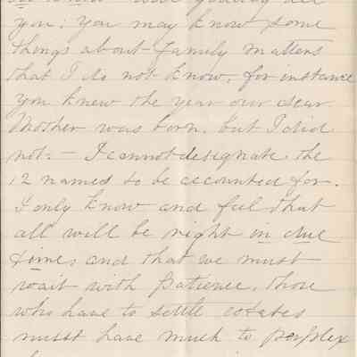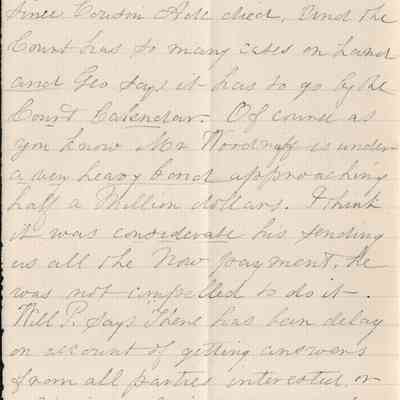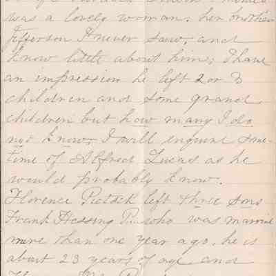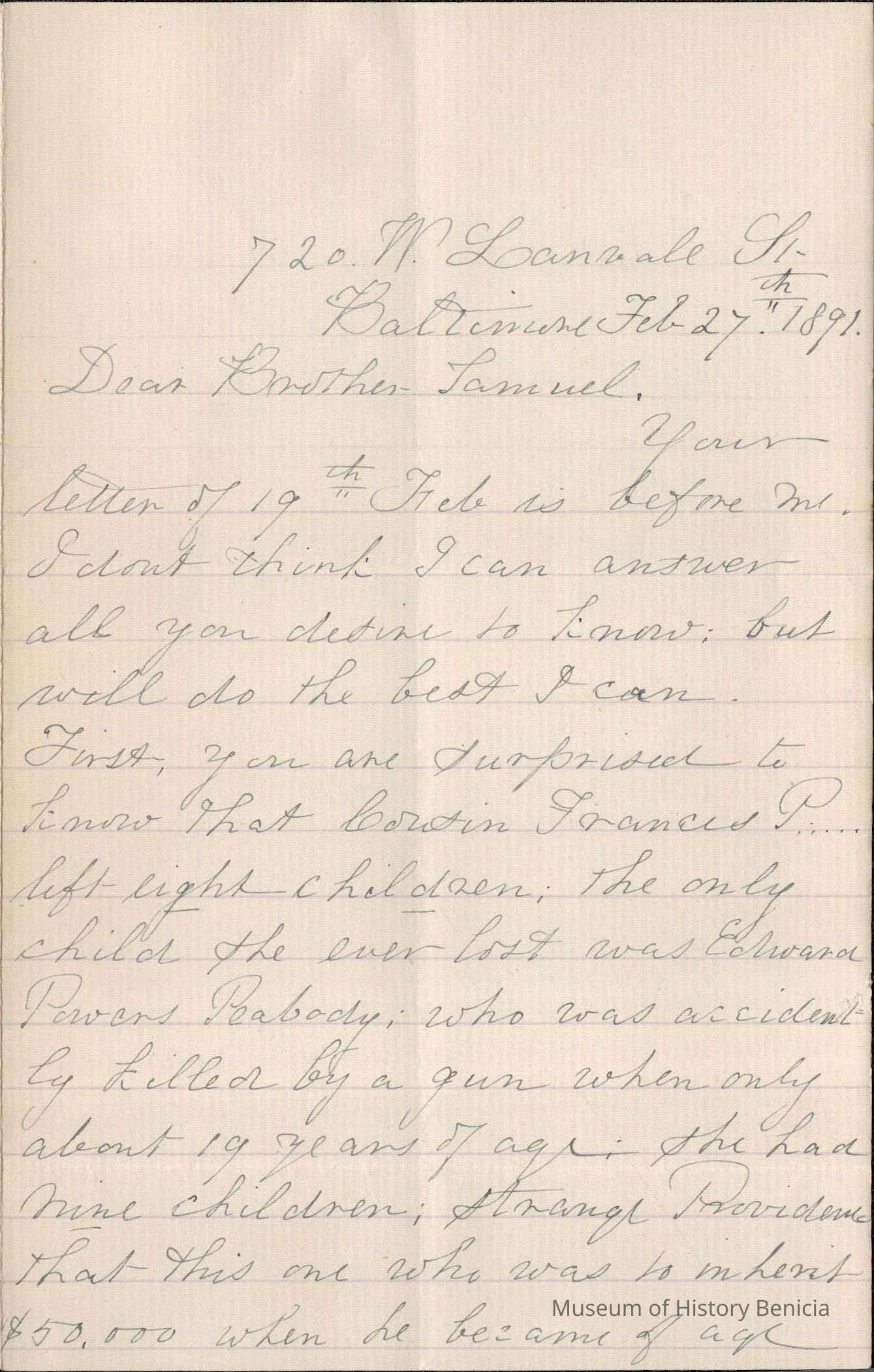 This is a letter dated 02/27/1891 from Mrs. Mary Gray Morton to her brother Mr. Samuel C. Gray regarding mainly estate matters. The letter is discussing the determination of what will happen to their uncle Edward Epps Powers (1793 - 1855) estate now that their cousin Adeline has passed. Edward Powers will had several stipulations in it for how his extensive estate should be distributed. One of the more unusual stipulations was that two of his nephews would each receive $50,000 when they turned 21 if they would change their names legally and forever to the surname "Powers". Since neither lived to age 21 that money was given to Edward's niece Adeline Ann Williams for her use during her lifetime. The situation in 1891 is the death of Adeline and a determination as to how the money in her control (including the previously mentioned $100,000) should now be divided.