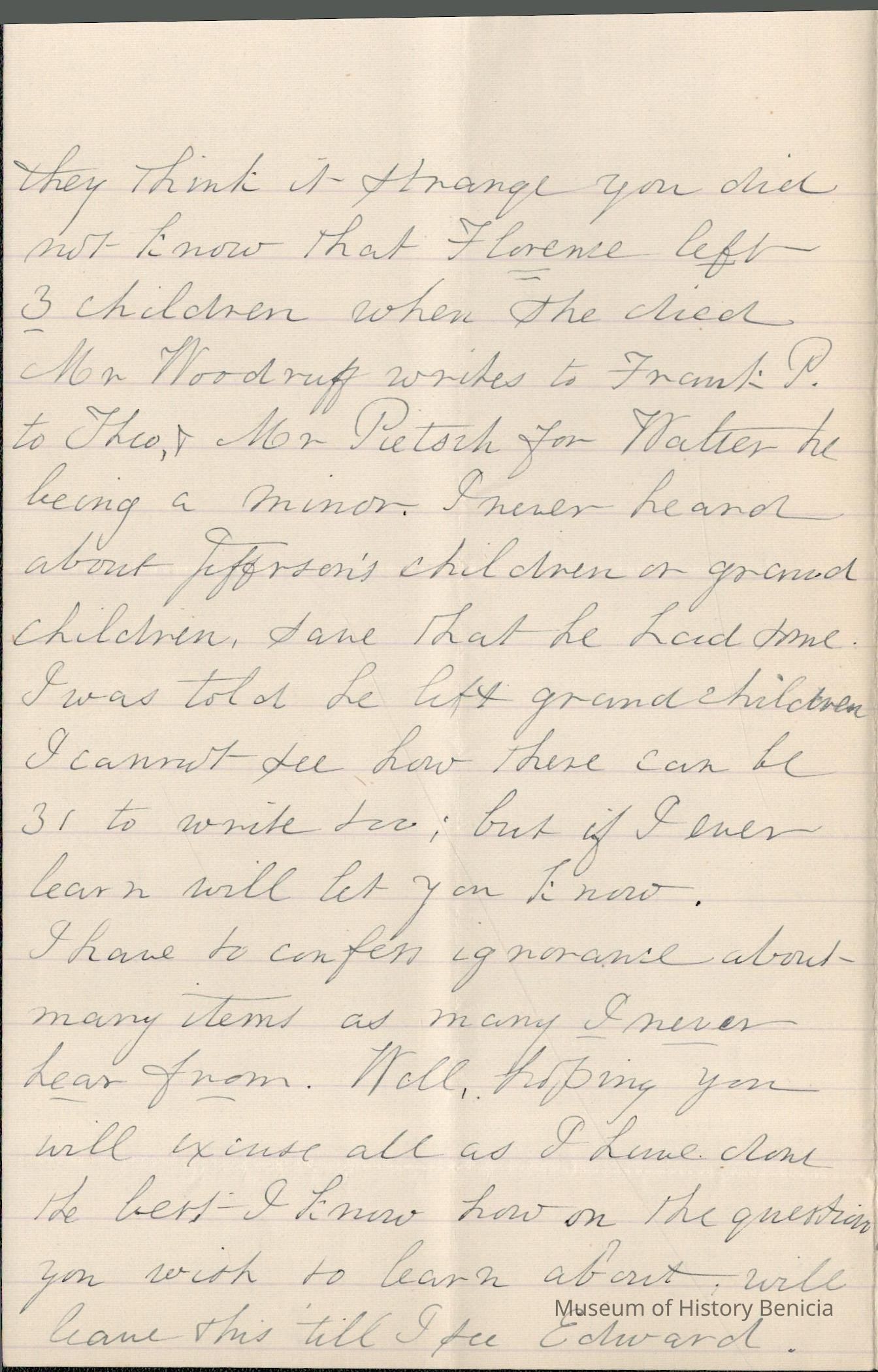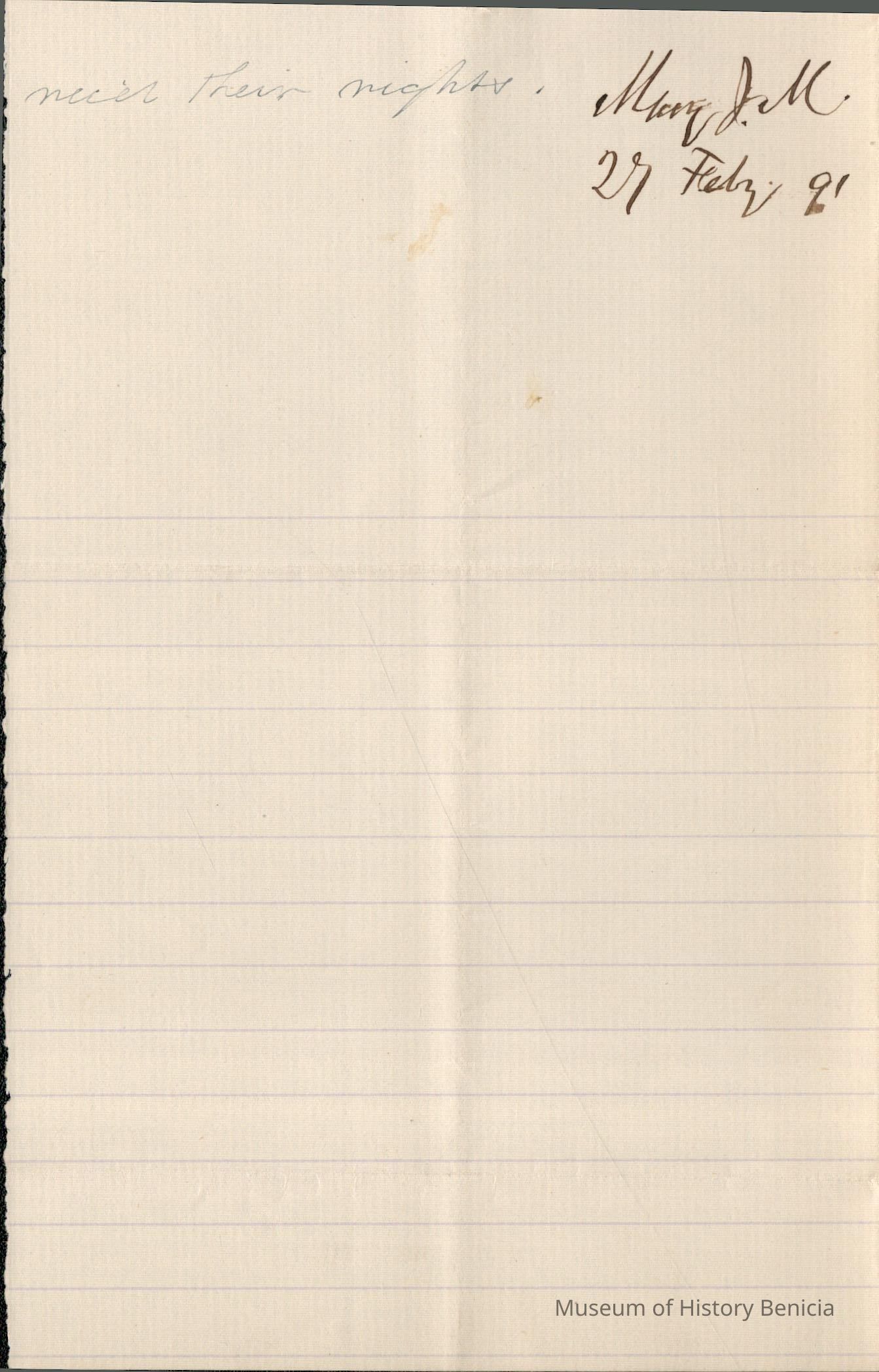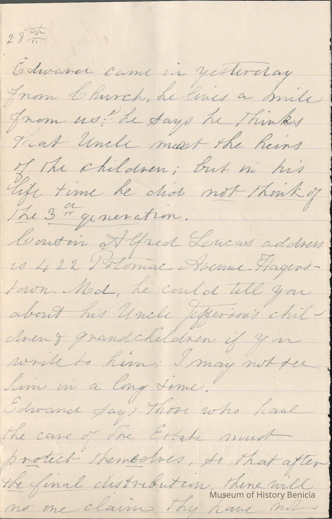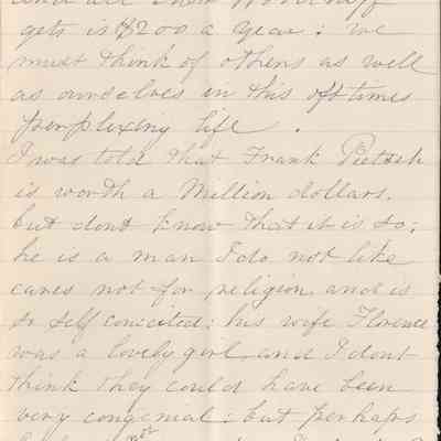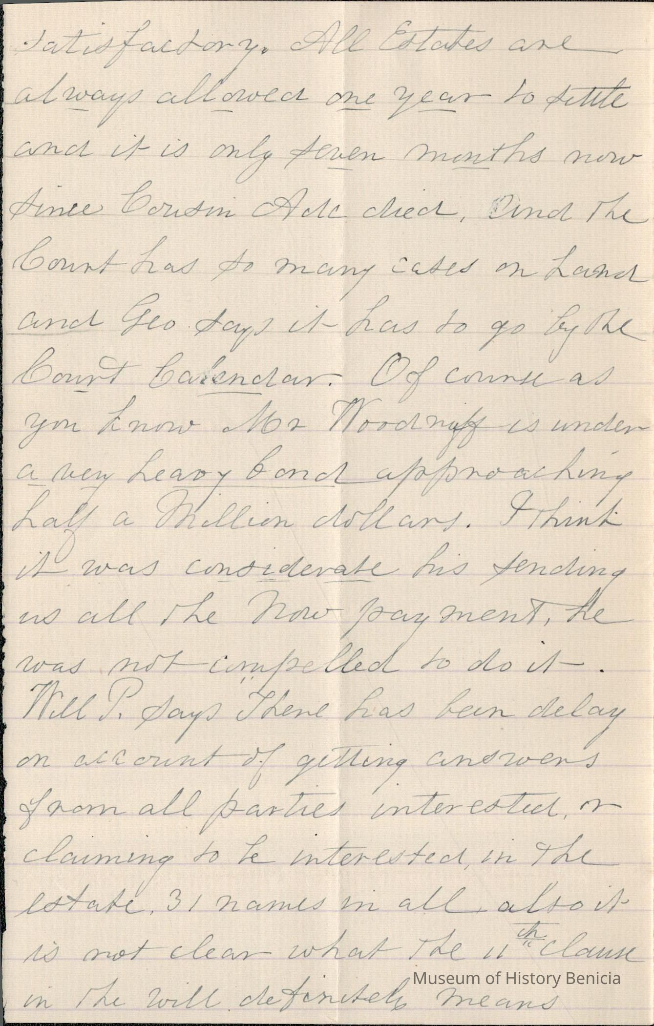 This is a letter dated 02/27/1891 from Mrs. Mary Gray Morton to her brother Mr. Samuel C. Gray regarding mainly estate matters. The letter is discussing the determination of what will happen to their uncle Edward Epps Powers (1793 - 1855) estate now that their cousin Adeline has passed. Edward Powers will had several stipulations in it for how his extensive estate should be distributed. One of the more unusual stipulations was that two of his nephews would each receive $50,000 when they turned 21 if they would change their names legally and forever to the surname "Powers". Since neither lived to age 21 that money was given to Edward's niece Adeline Ann Williams for her use during her lifetime. The situation in 1891 is the death of Adeline and a determination as to how the money in her control (including the previously mentioned $100,000) should now be divided.