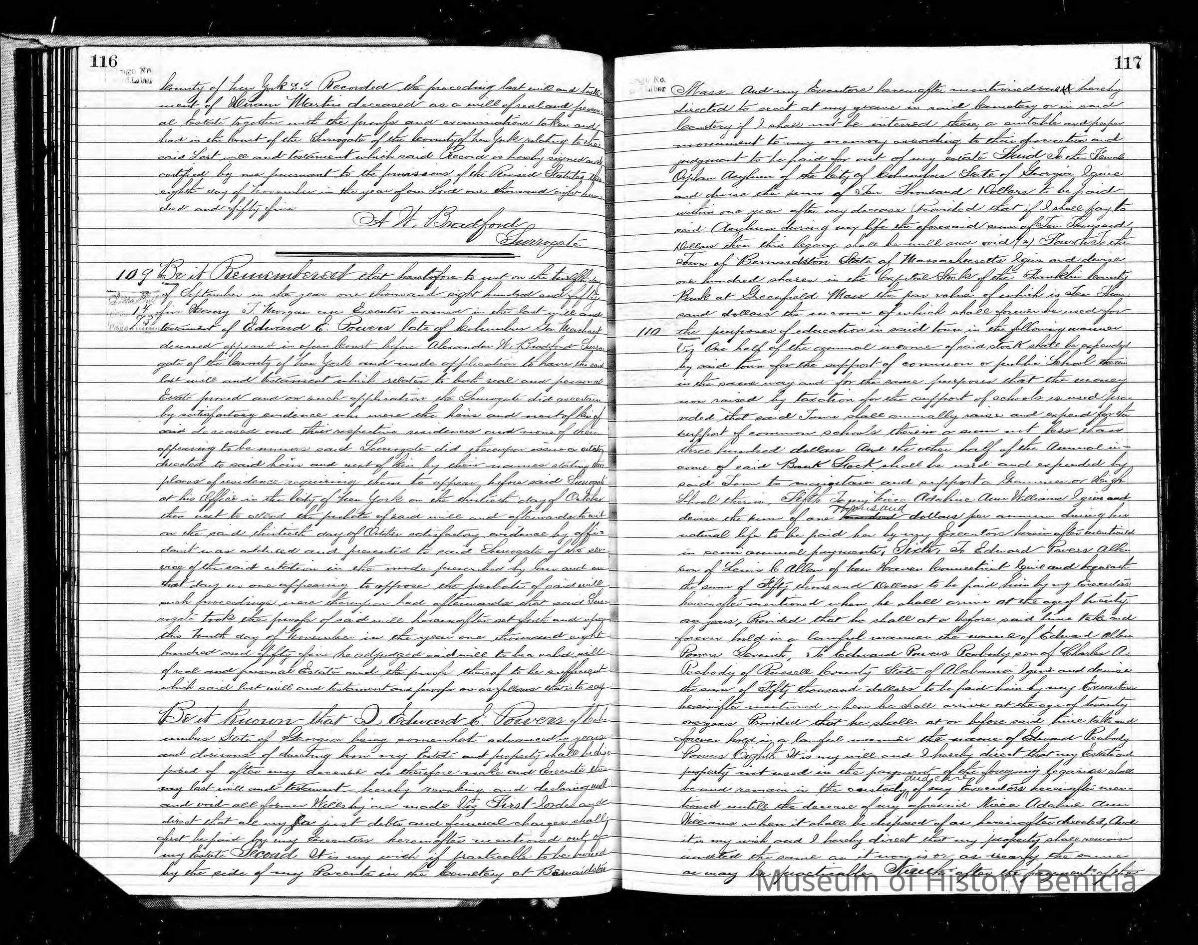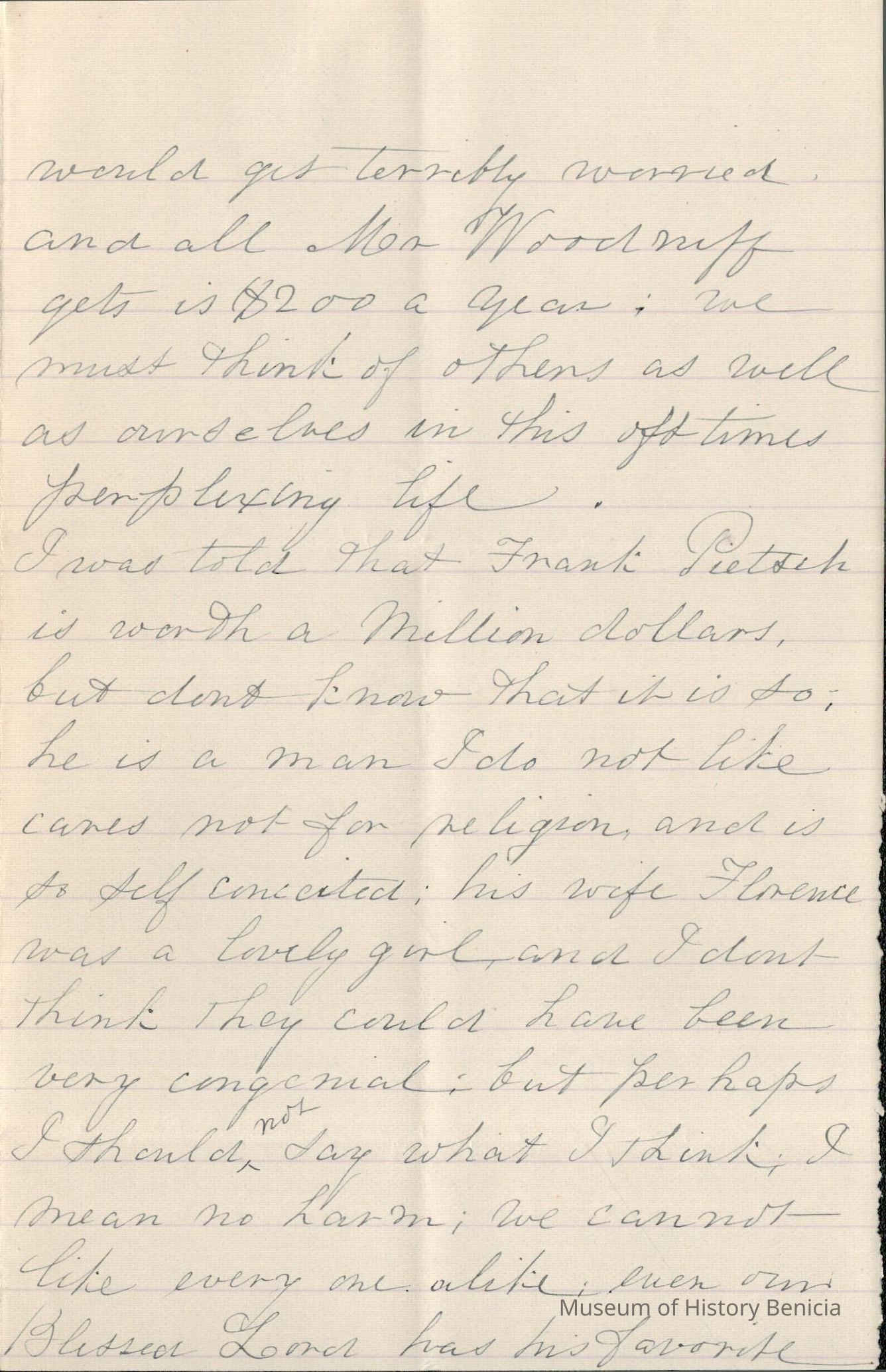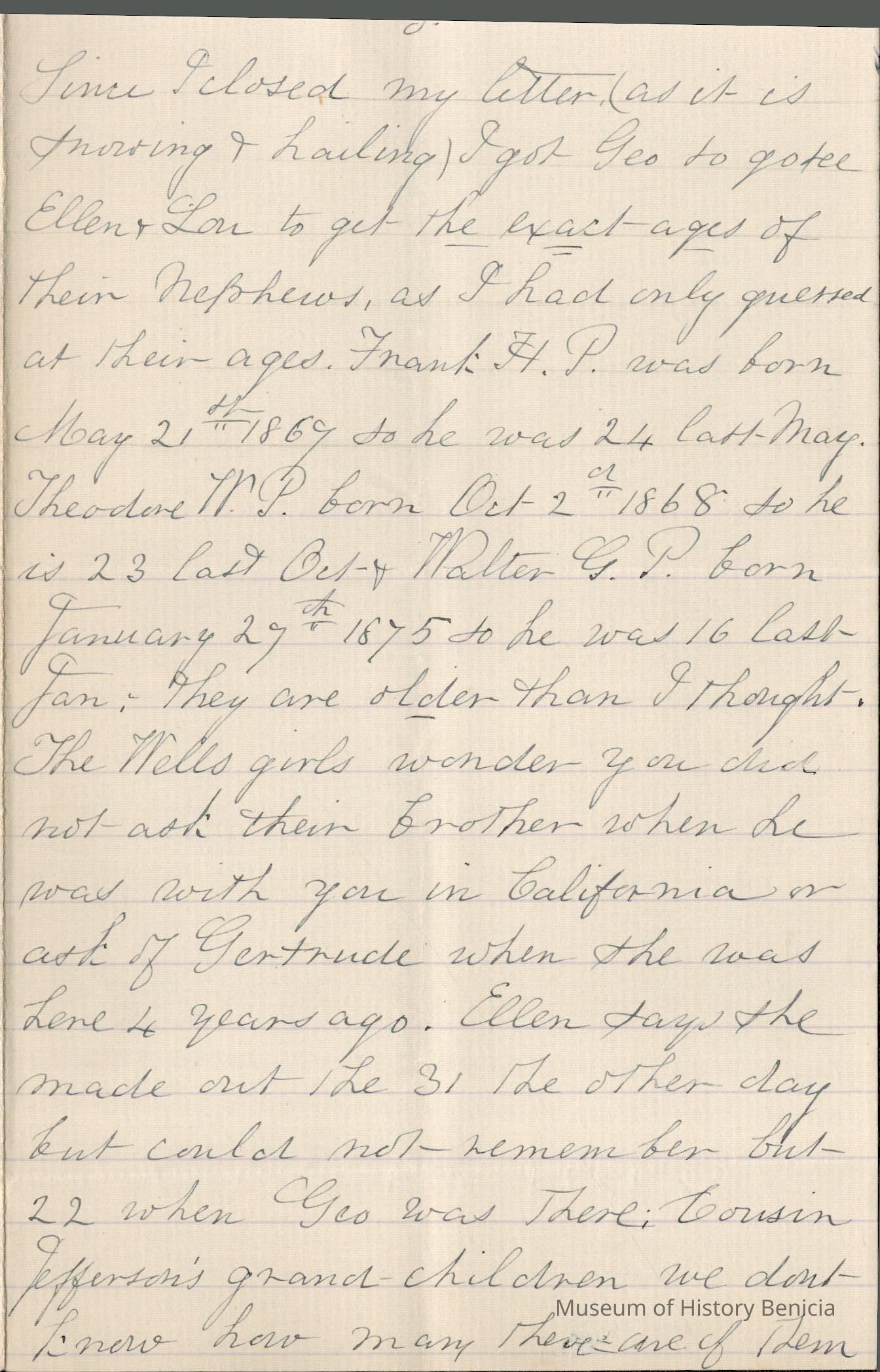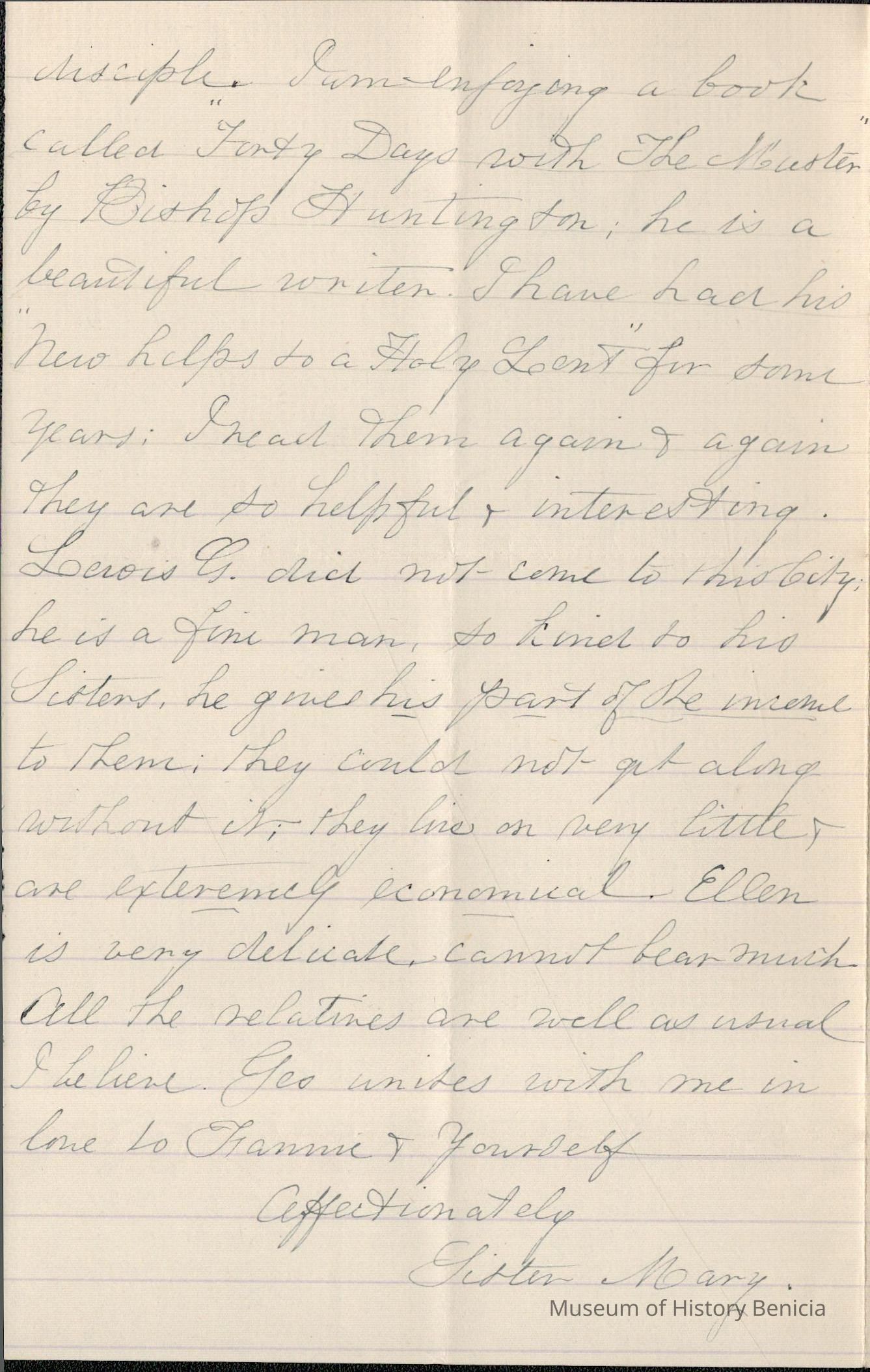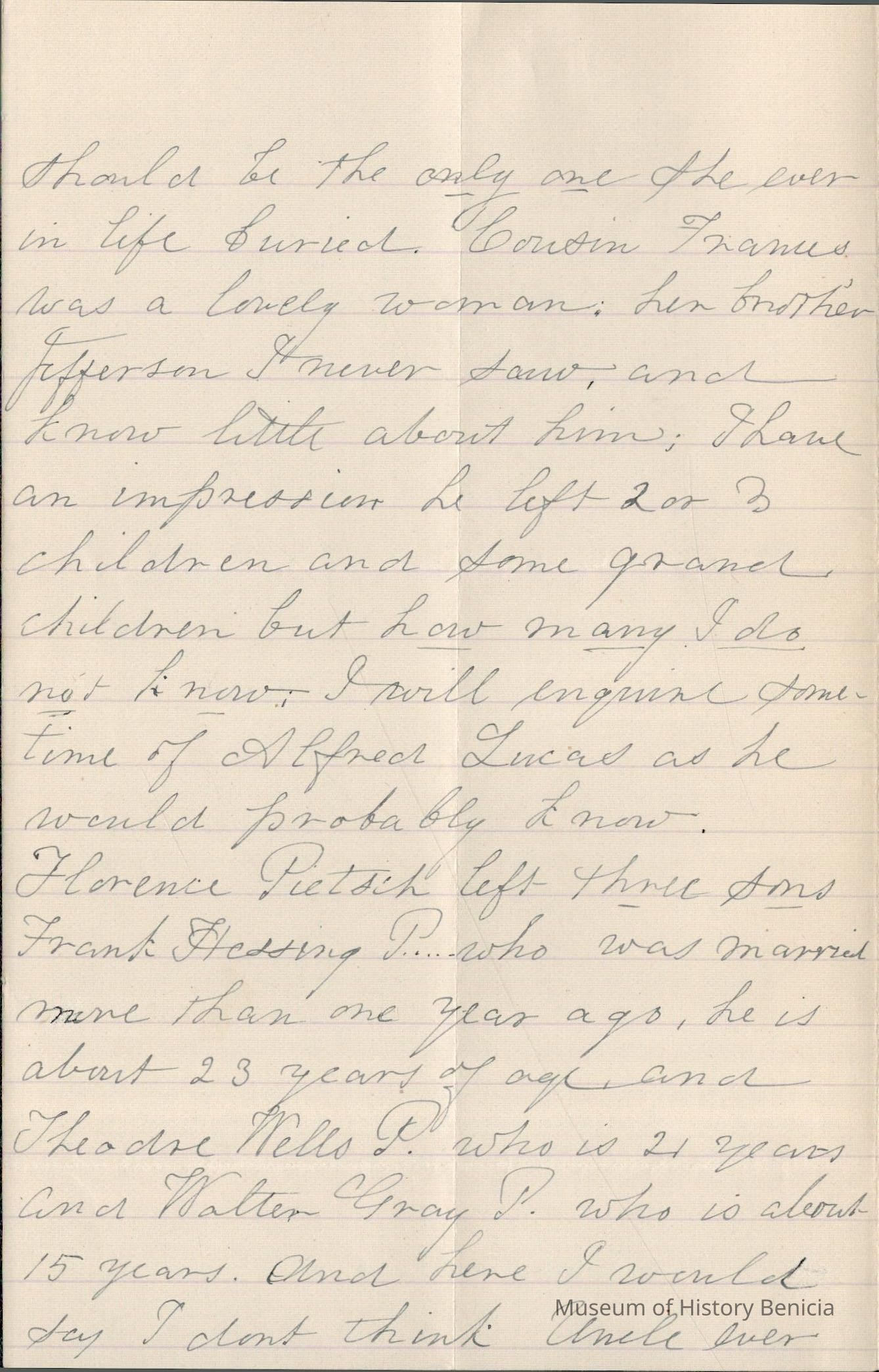 This is a letter dated 02/27/1891 from Mrs. Mary Gray Morton to her brother Mr. Samuel C. Gray regarding mainly estate matters. The letter is discussing the determination of what will happen to their uncle Edward Epps Powers (1793 - 1855) estate now that their cousin Adeline has passed. Edward Powers will had several stipulations in it for how his extensive estate should be distributed. One of the more unusual stipulations was that two of his nephews would each receive $50,000 when they turned 21 if they would change their names legally and forever to the surname "Powers". Since neither lived to age 21 that money was given to Edward's niece Adeline Ann Williams for her use during her lifetime. The situation in 1891 is the death of Adeline and a determination as to how the money in her control (including the previously mentioned $100,000) should now be divided.