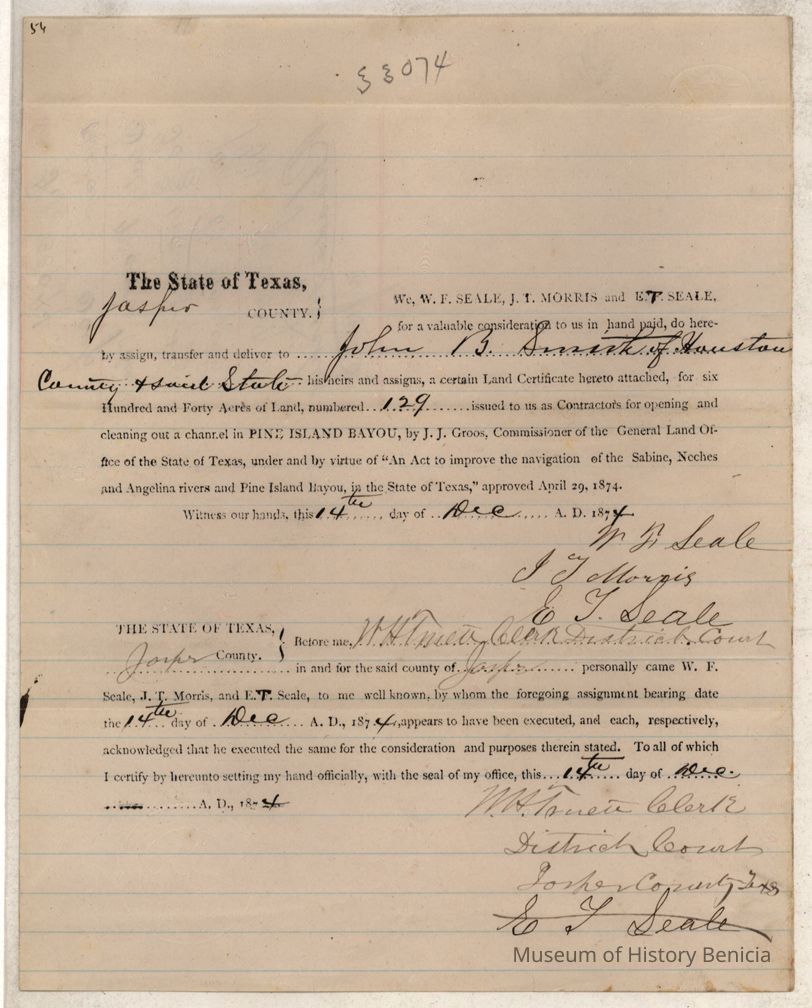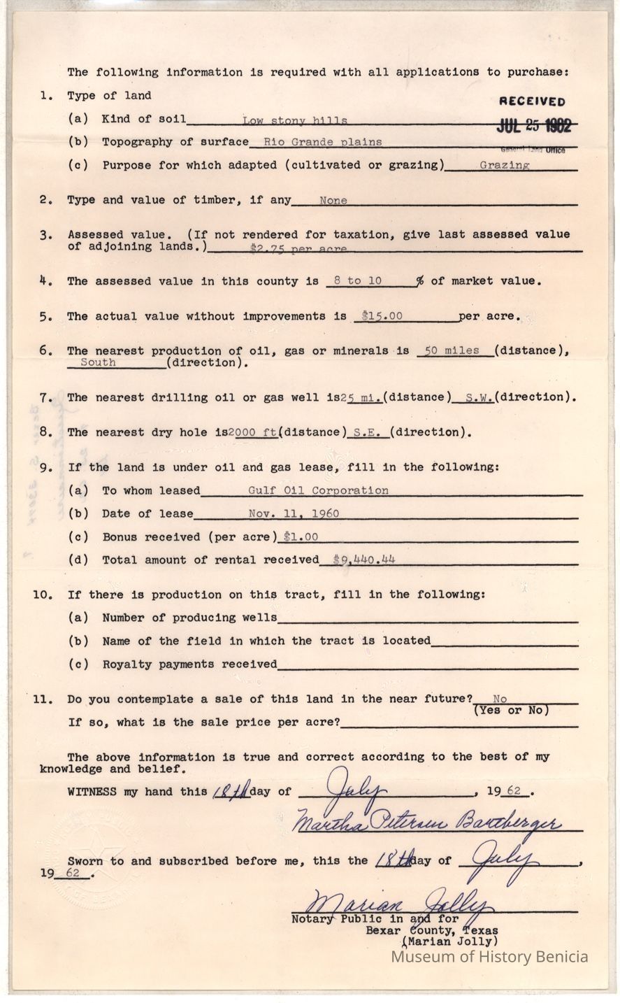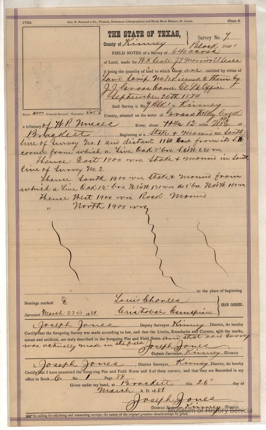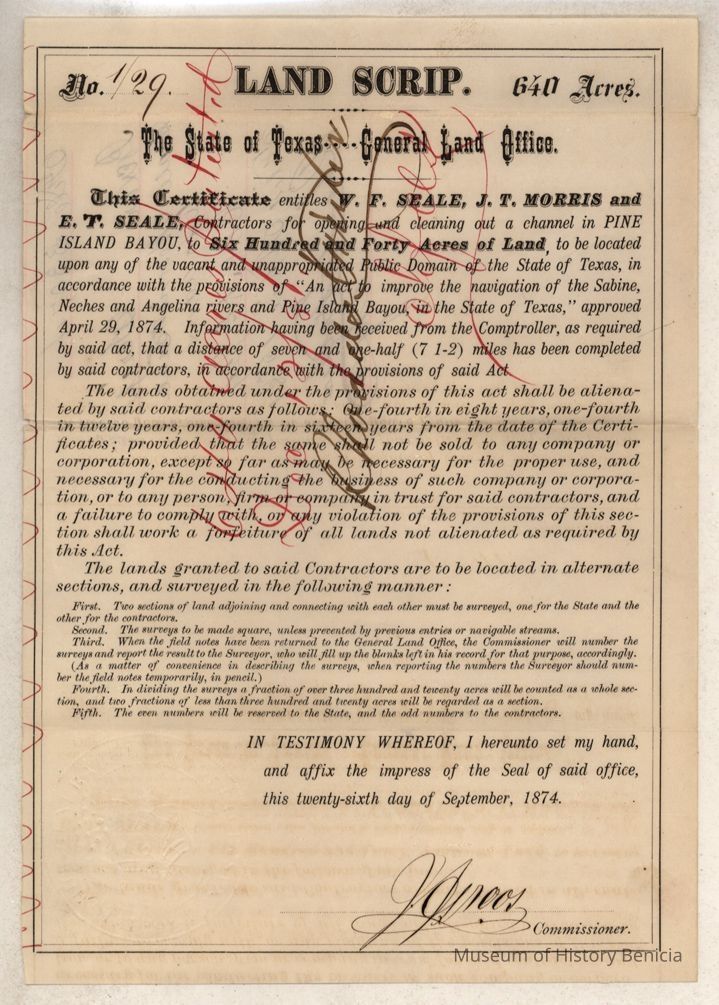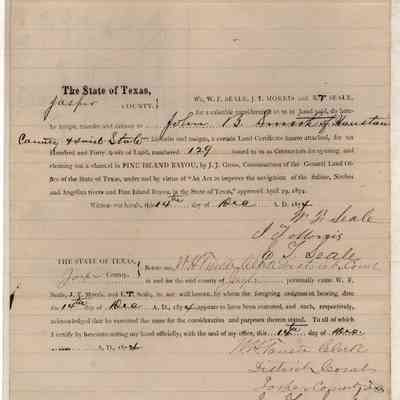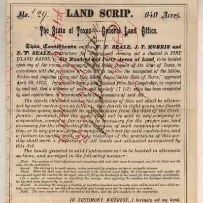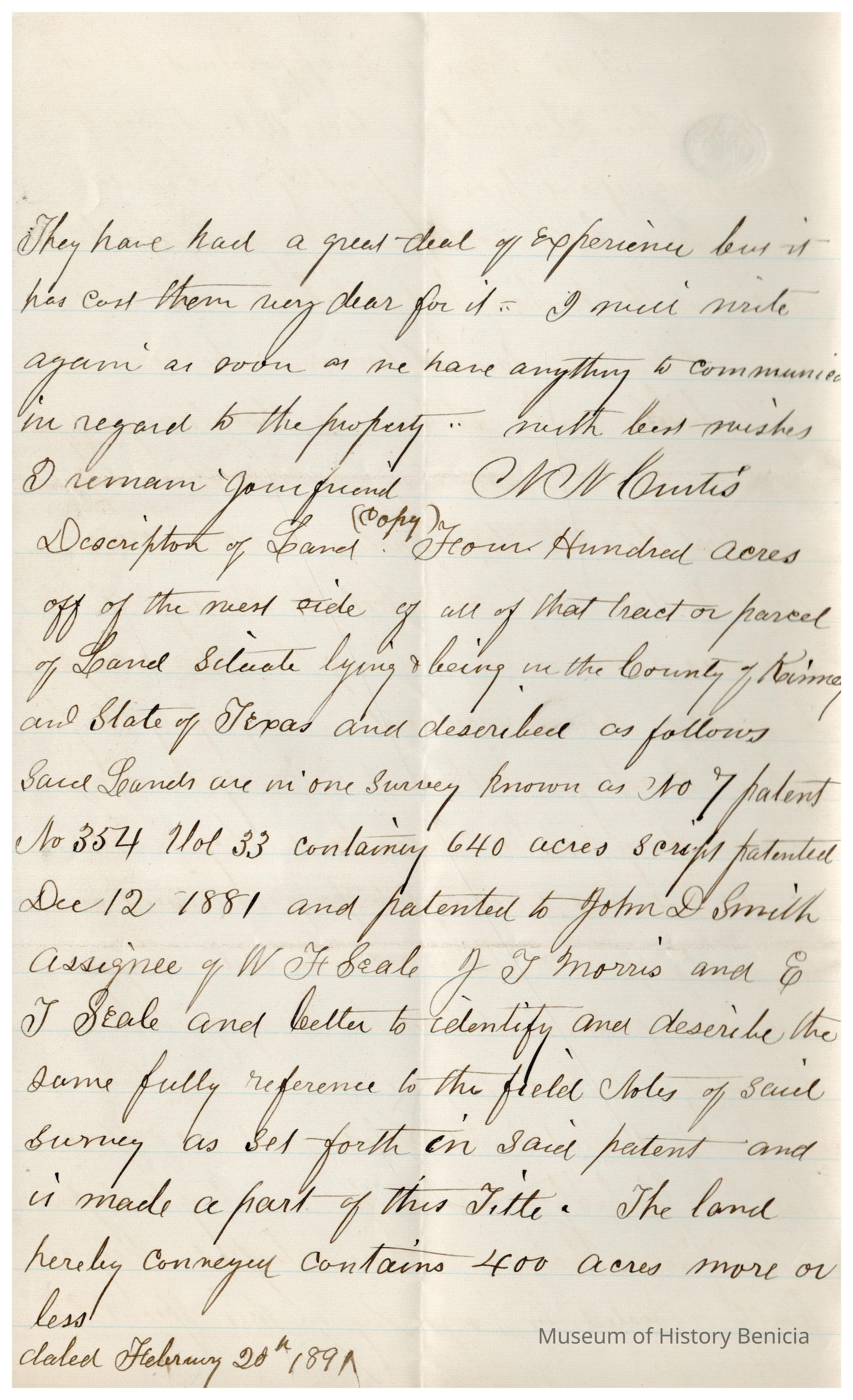 The land is described as patent # 354 vol. 33 patented 12/12/1881. The Texas online land registry database has a record for this patent under the name of Searle. I don't see a reference to the sale of these 400 acres.Collection