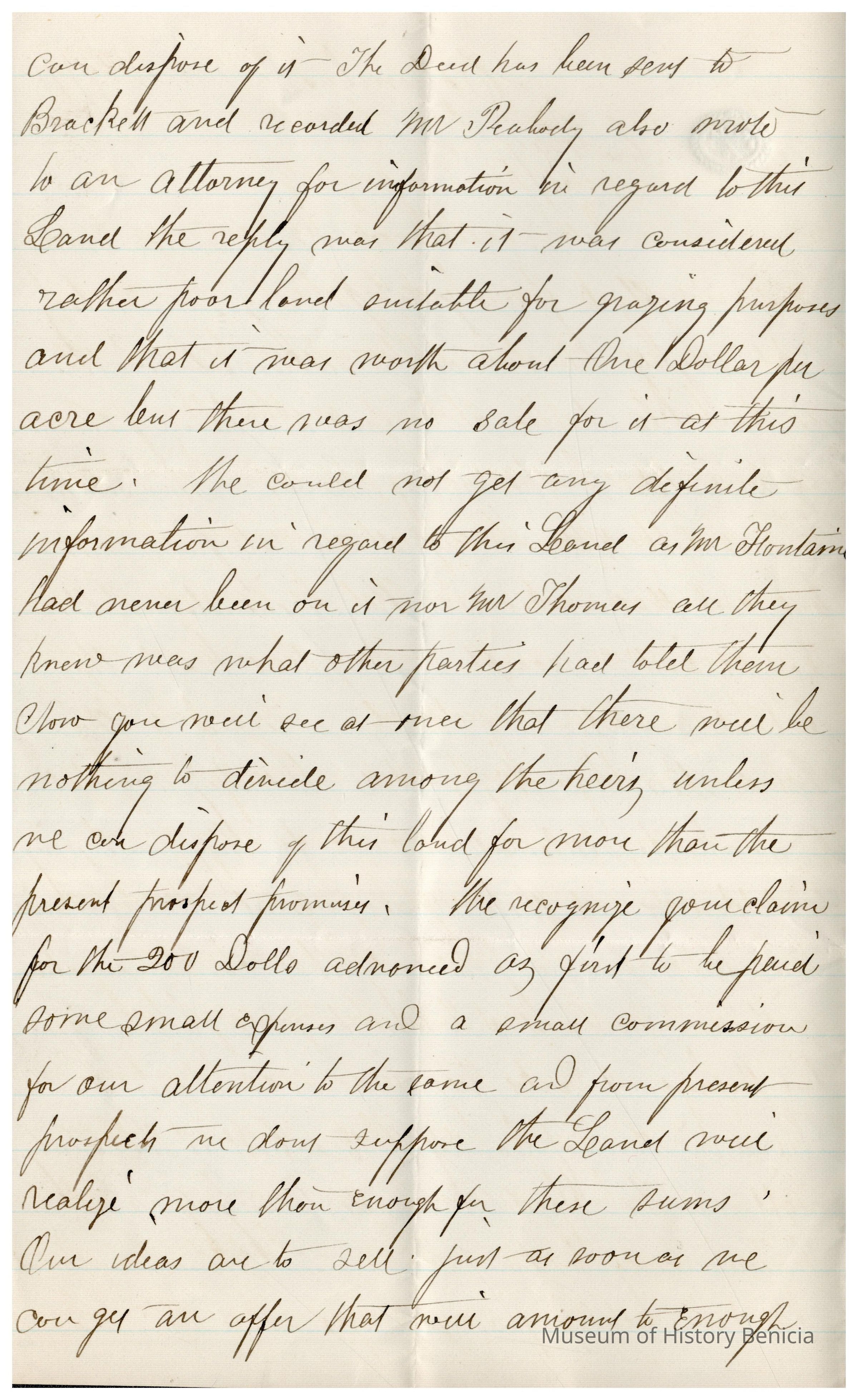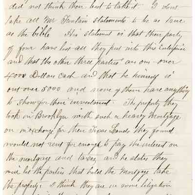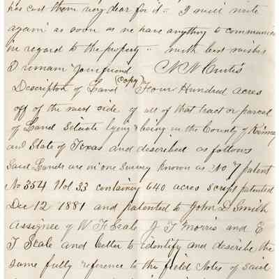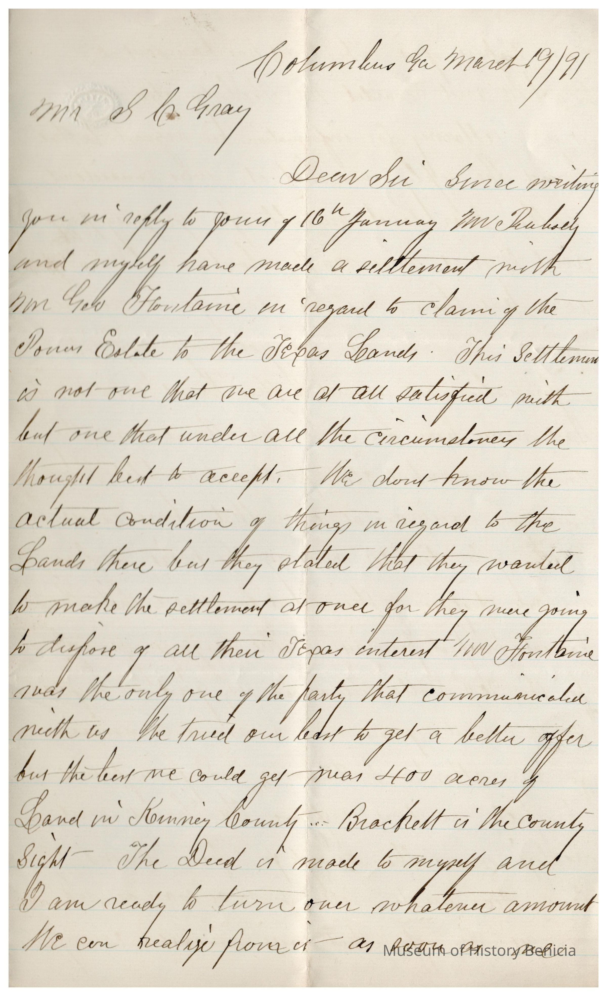 This is a letter to Samuel C Gray from N. N. Curtis dated 03/19/1891 regarding property of Samuel's Uncle in Texas. The letter talks about possibly selling 400 acres of land in Kinney County Texas (Central Texas West of San Antonio.). Somehow the deal involves Dr. Peabody and originated from the estate of Samuel's uncle Edward Powers (1793 - 1855).