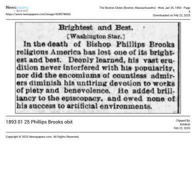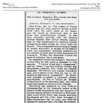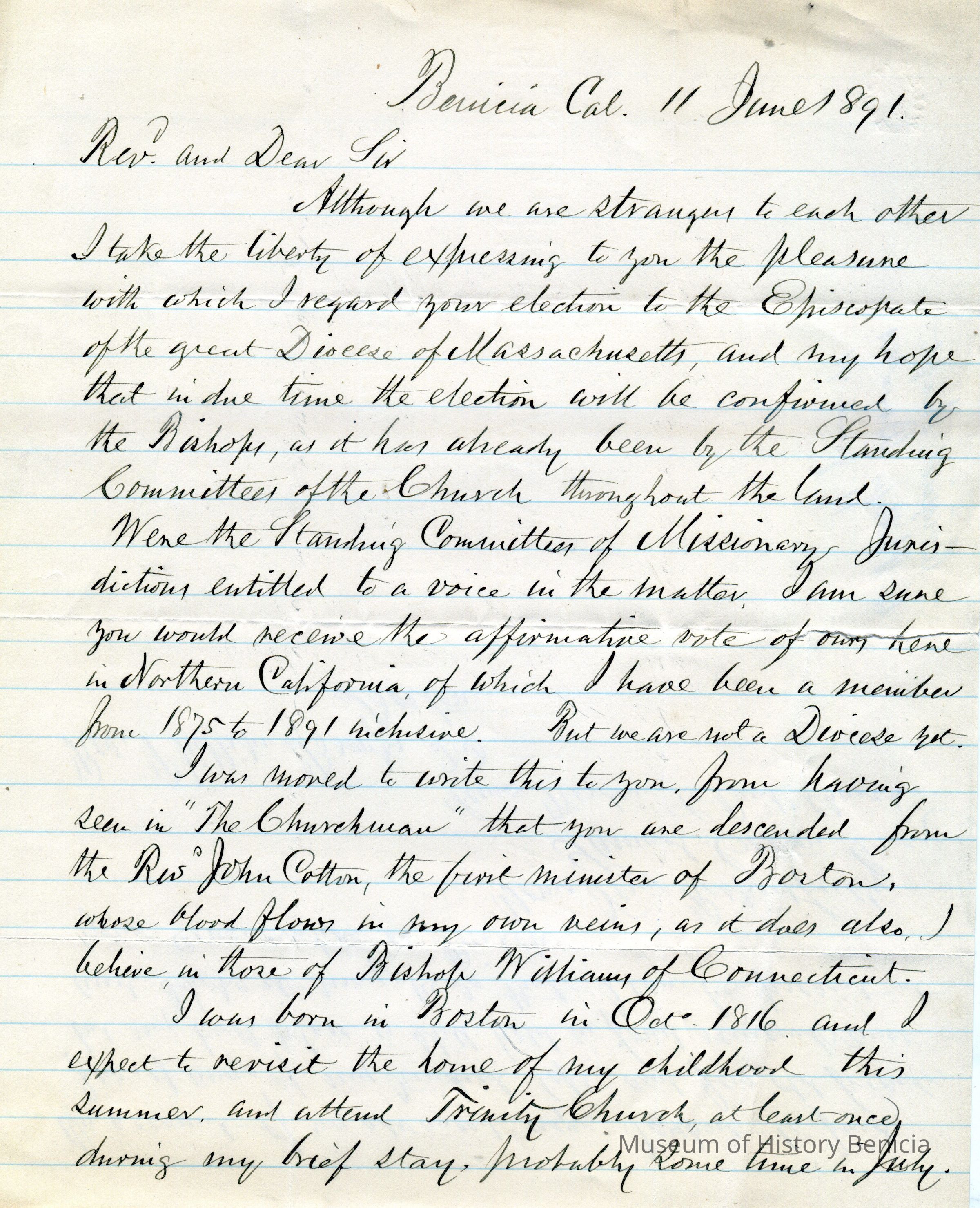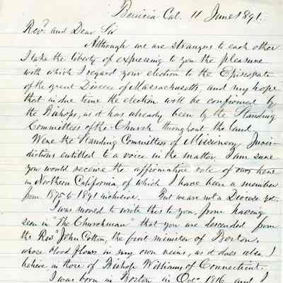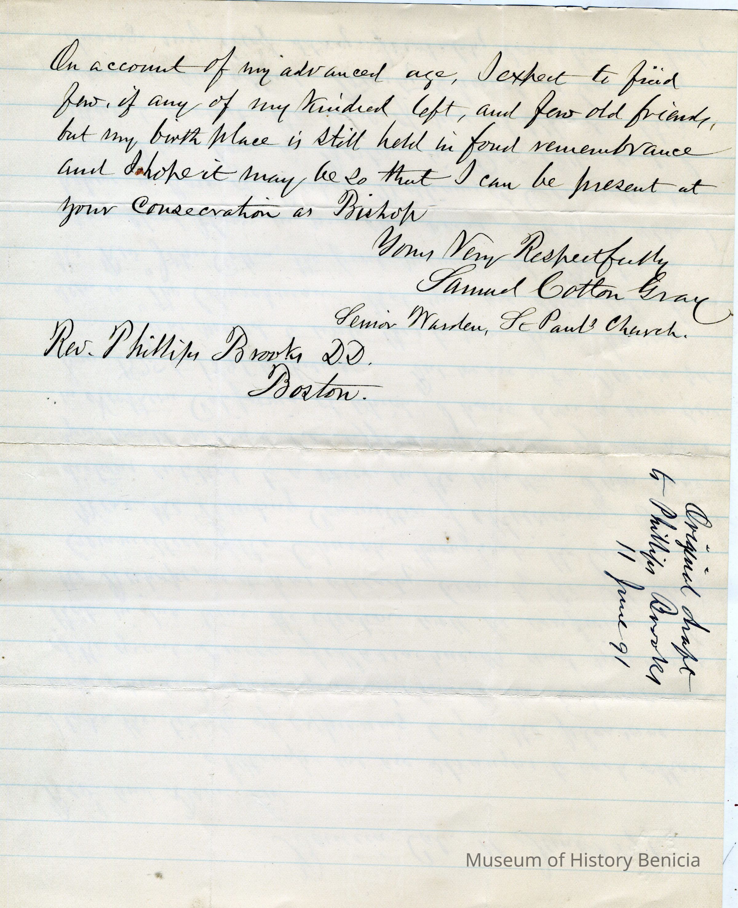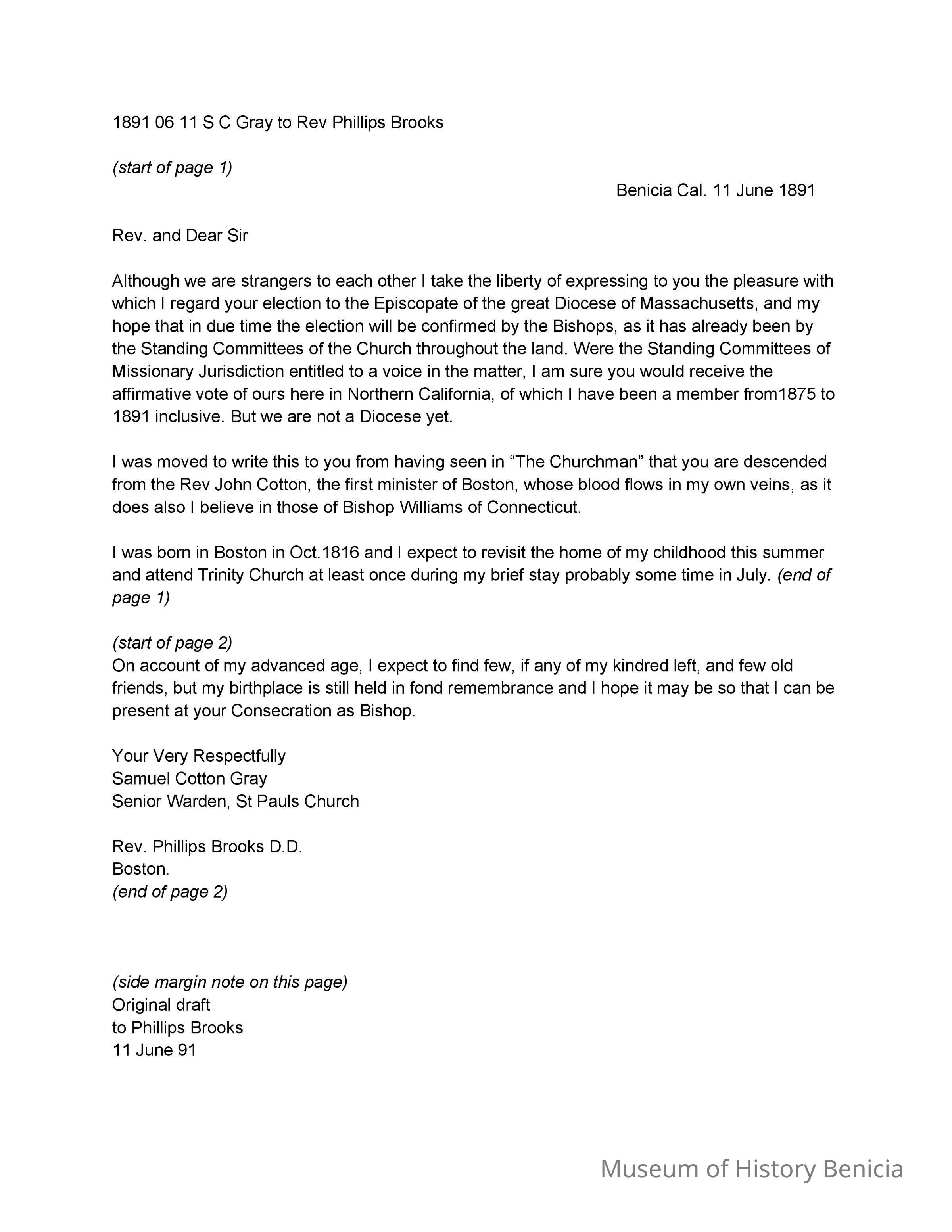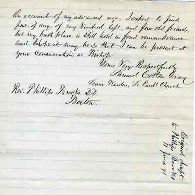 This is a letter from Samuel C Gray to Rev. Phillips Brooks dated 06/11/1891. Mr. Gray is writing to Rev. Brooks because he is descended from Rev. John Cotton and Samuel is also related to the Cotton family. In addition, Samuel hopes that Rev. Brooks is elected to the Episcopate of the Diocese of Massachusetts.Collection