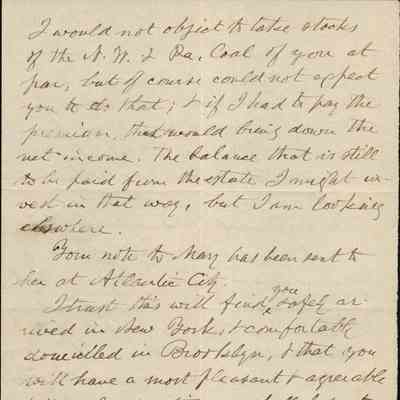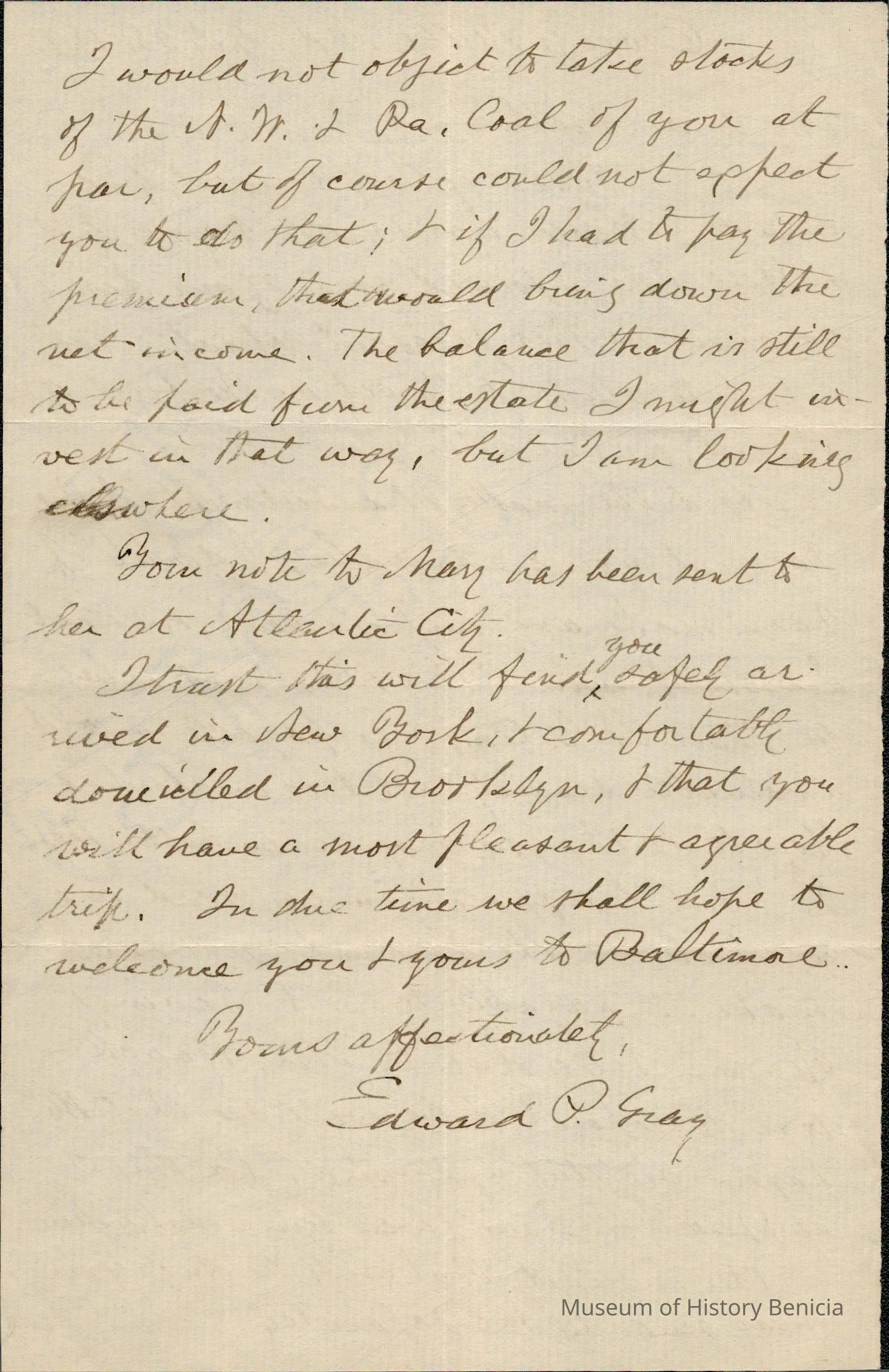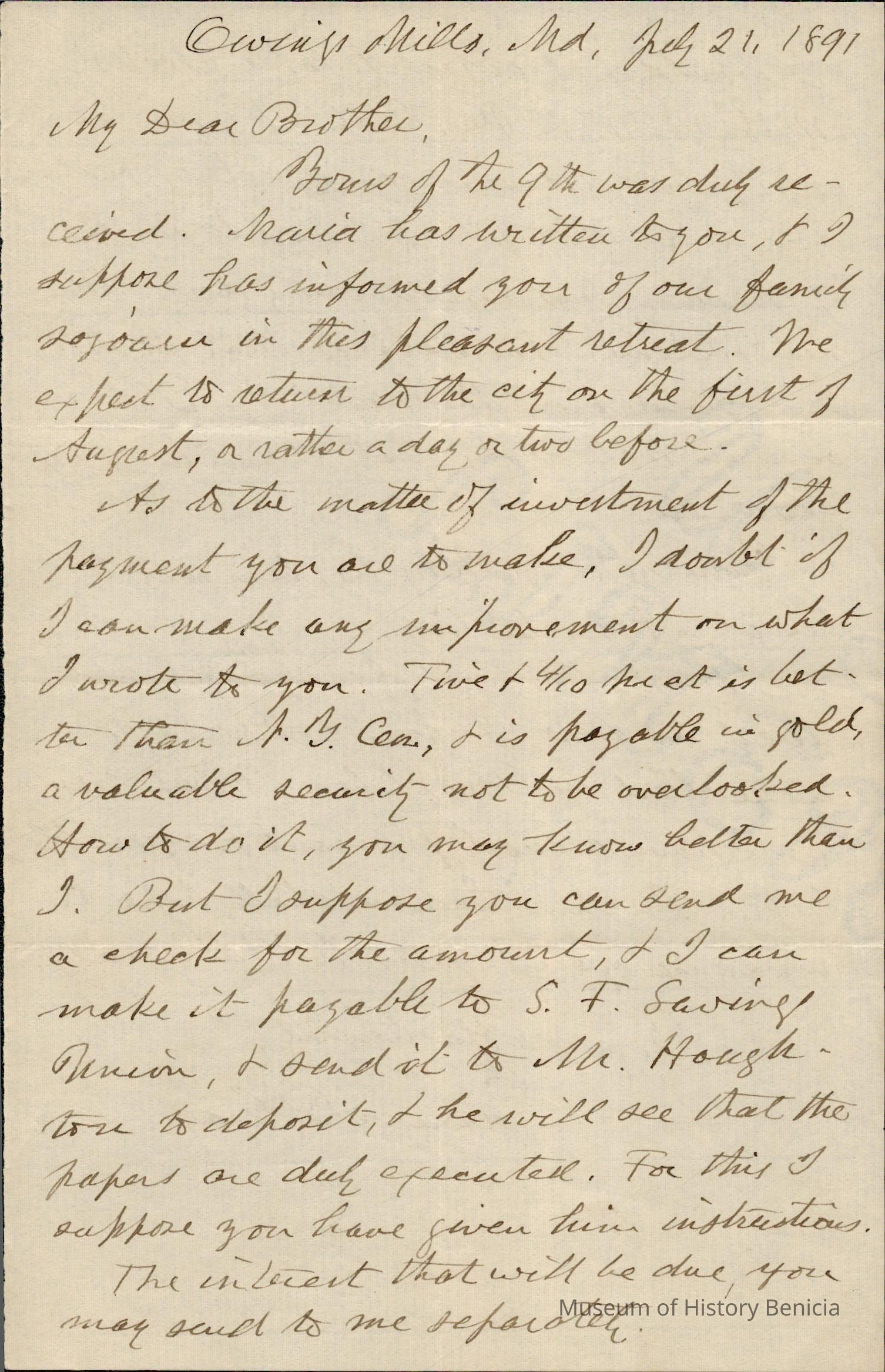 This is a letter dated 07/21/1891 from Mr. Edward Powers Gray to Mr. Samuel C. Gray regarding mainly estate matters. He does mention that they are on vacation in Owings Mills, MD, a very pleasant place.