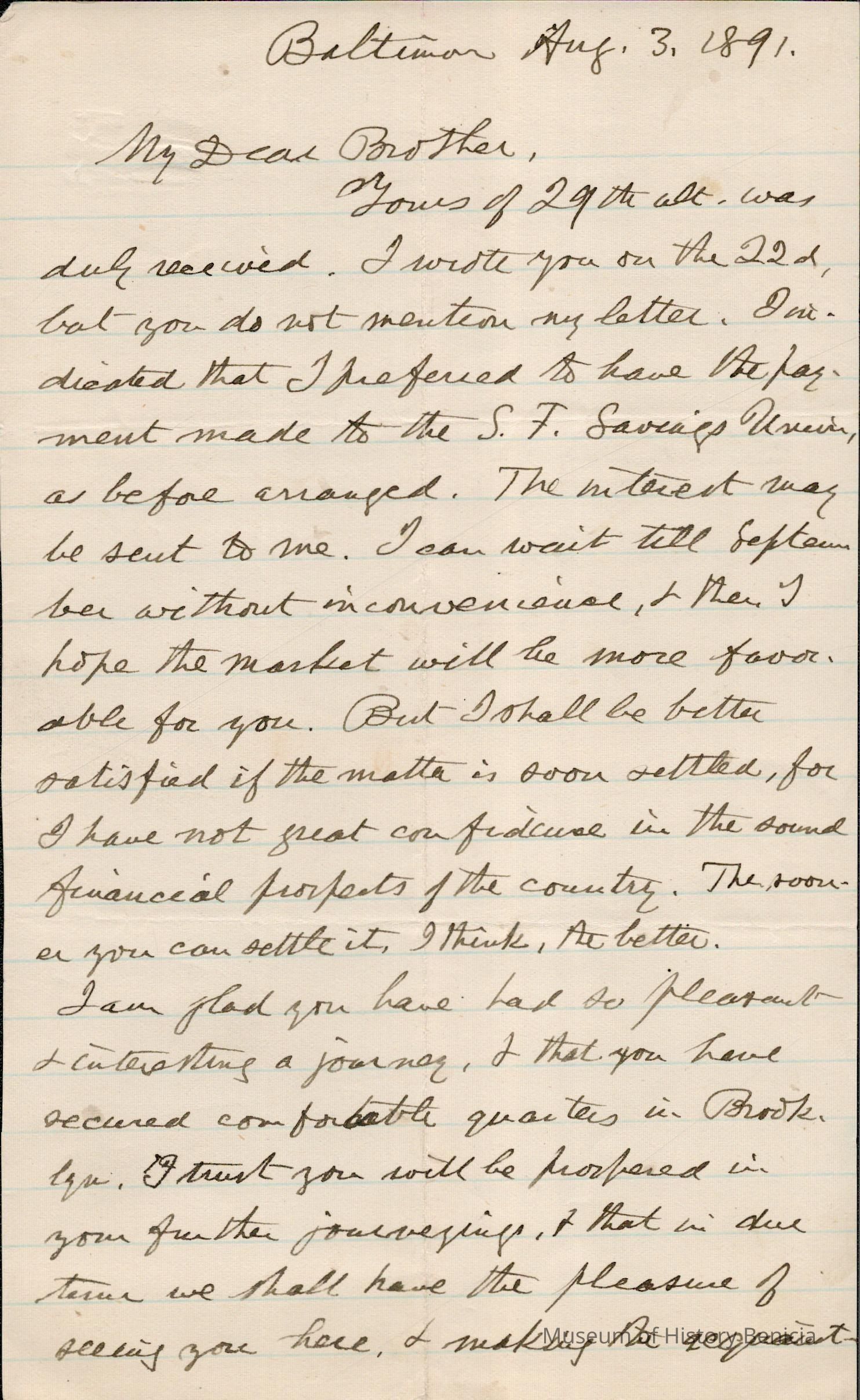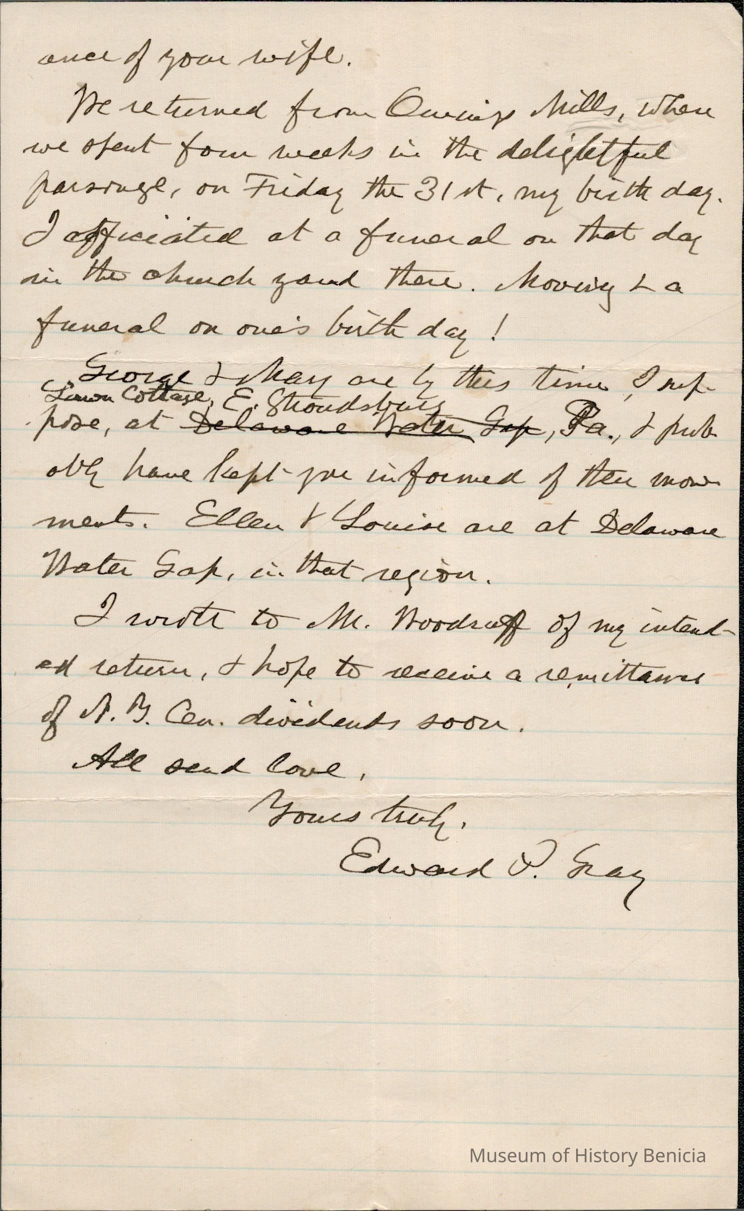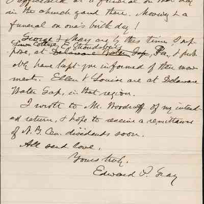 This is a letter dated 08/03/1891 from Mr. Edward Powers Gray to Mr. Samuel C. Gray regarding mainly estate matters. He is glad that Samuel has found good accommodations in Brooklyn, NY on his trip and hopes to soon meet Samuel's new wife. He mentions that on his birthday he officiated at a funeral and thinks that is very unusual.