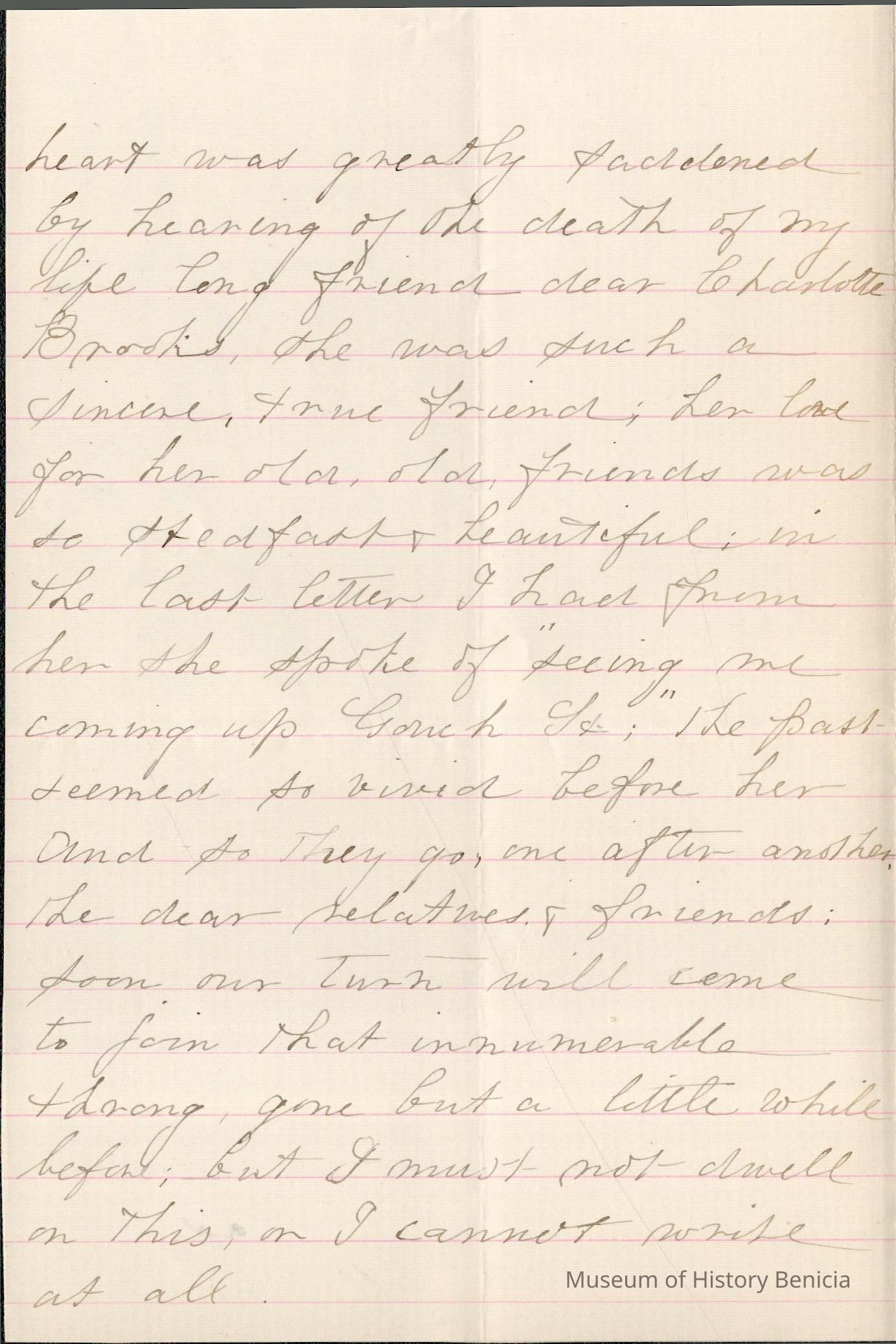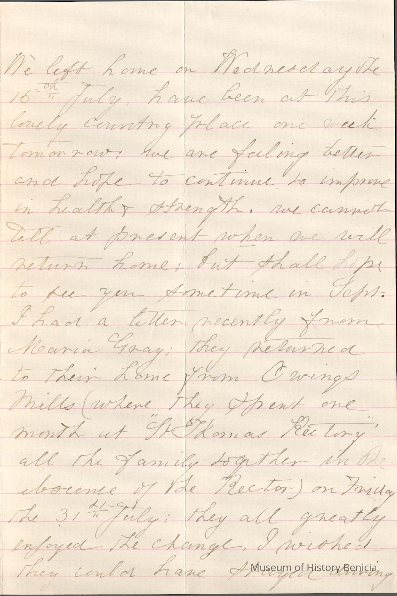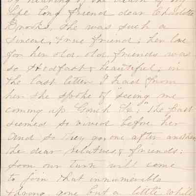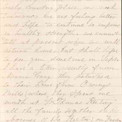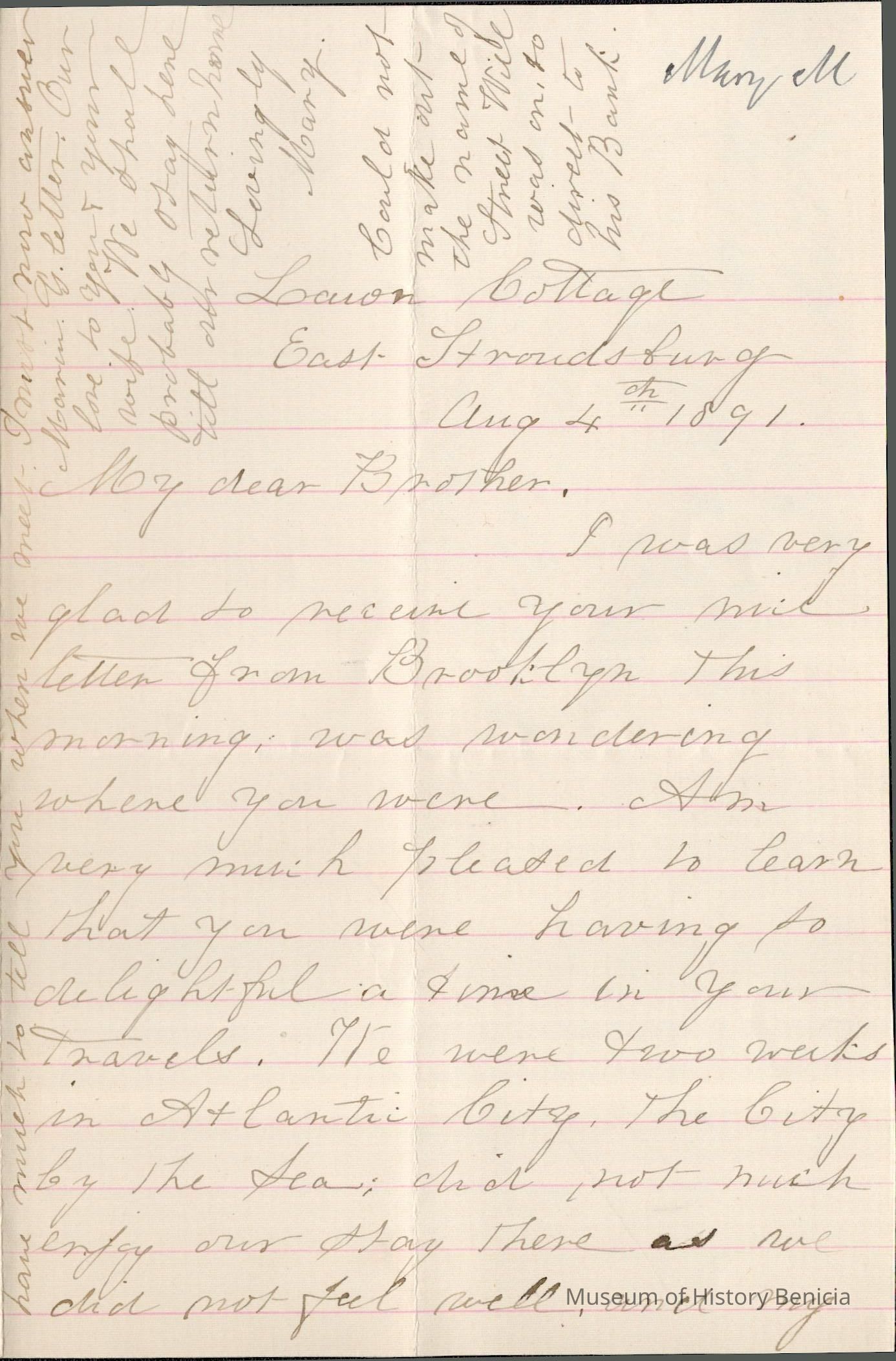 This is a letter dated 08/04/1891 from Mrs. Mary Gray Morton to her brother Mr. Samuel C. Gray regarding mainly family and travel matters. Mary is very pleased that Samuel and his wife are having such a good time in Brooklyn, NY. She and George have been in Atlantic City for a couple of weeks. She mentions her sadness at the death of her childhood friend, Charlotte Brooks. She also tells of receiving a letter from Maria Gray (1834 - 1919) (wife of brother Edward Gray (1822 - 1902)). Their family is spending a month at St. Thomas' Rectory.