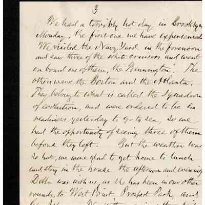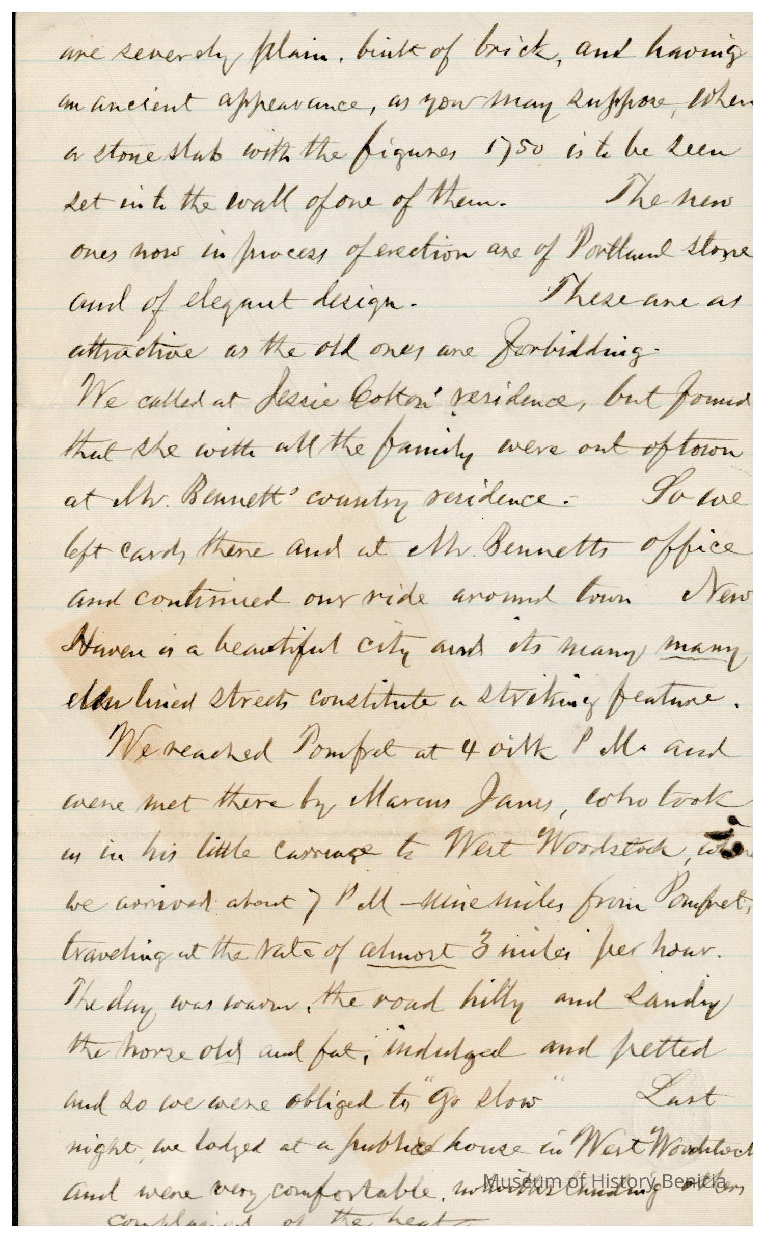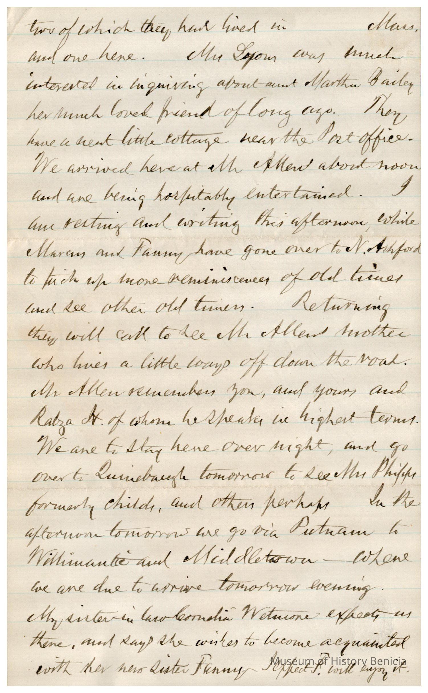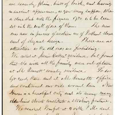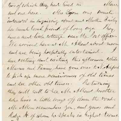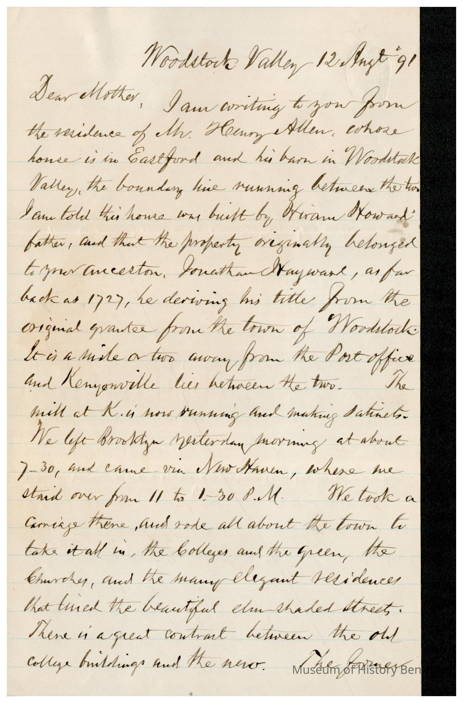 The image depicts a handwritten letter from Samuel Gray to his mother-in-law, dated August 12, '91, from Woodstock Valley. In the letter, Gray describes his visit to the residence of Mr. Henry Allen, whose property spans Eastford and Woodstock Valley. The house, originally belonging to the recipient’s ancestor, Jonathan Hayward, was built by Hiram Howard's father. Gray mentions the proximity of the residence to a post office and Kenyonville, noting a functioning mill at the latter. He details his journey from Brooklyn, passing through New Haven, where they explored the town by carriage to admire the colleges, green, churches, and residences, noting the contrast between the old college buildings and newer structures in the area.