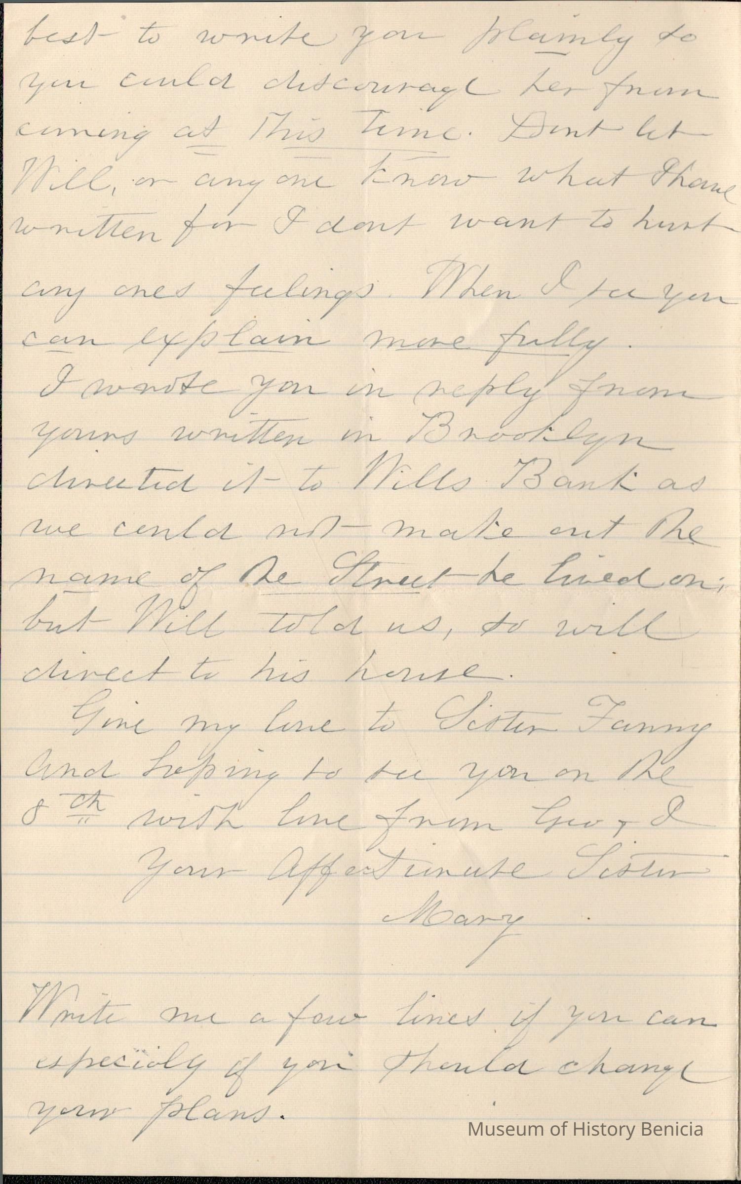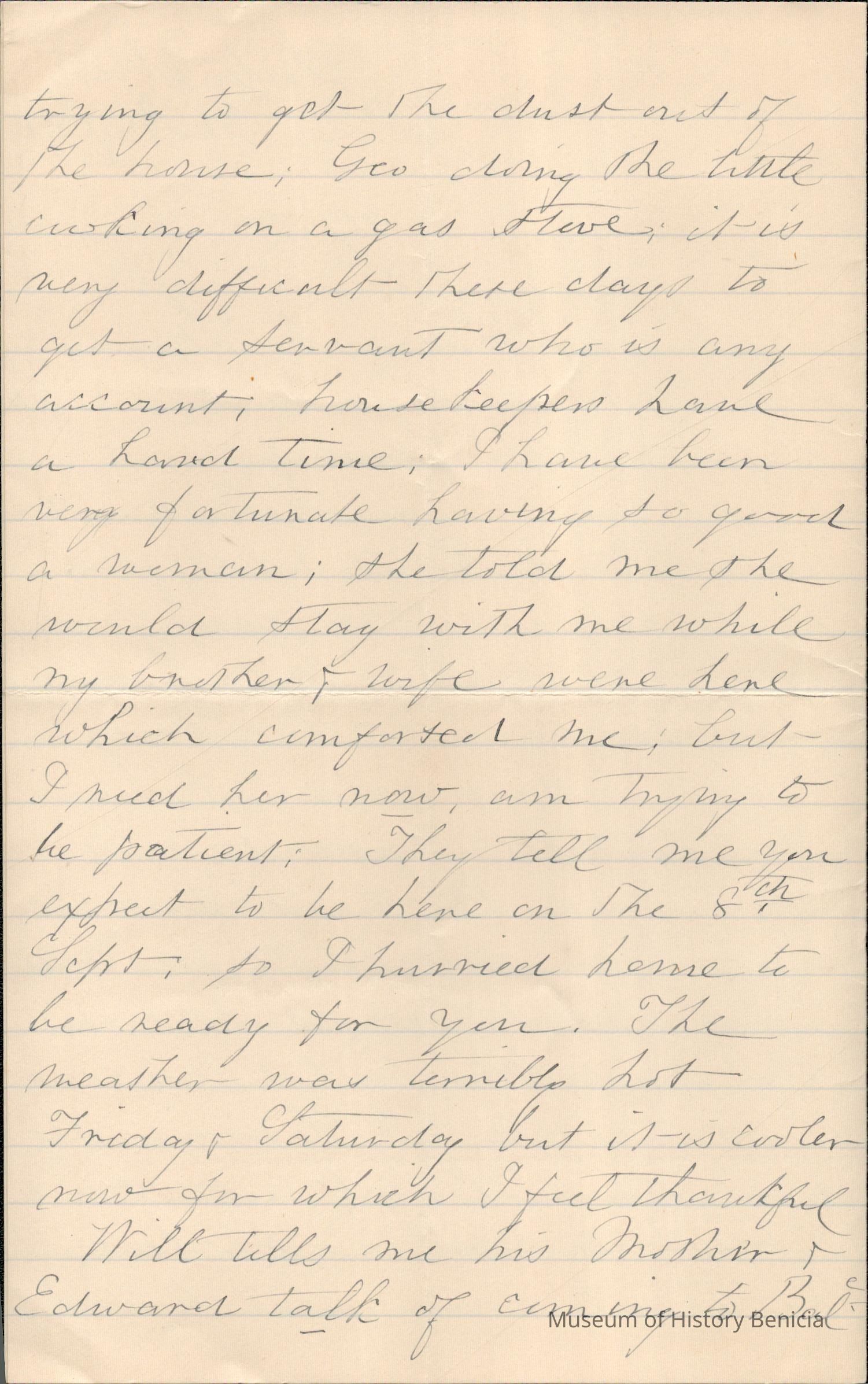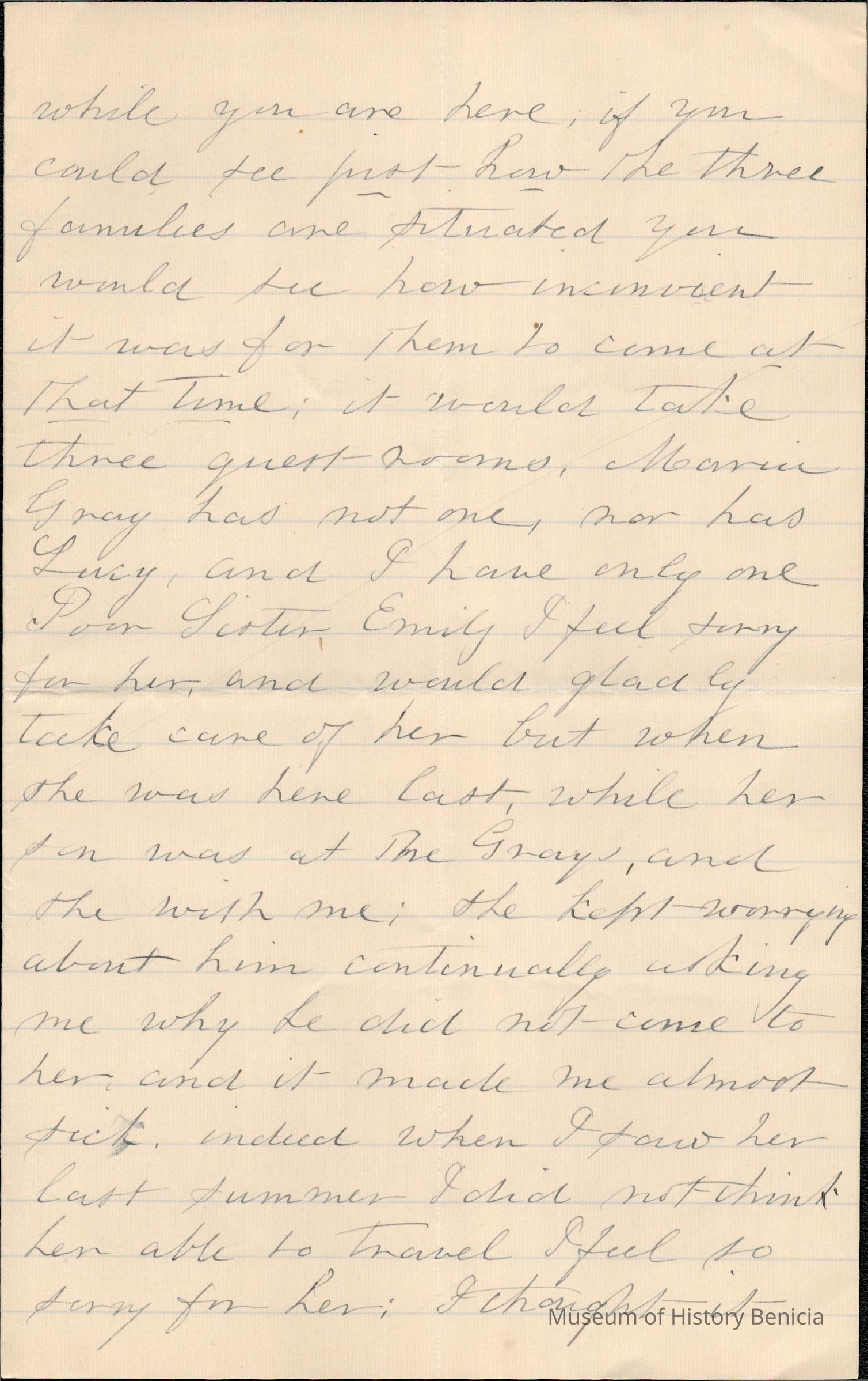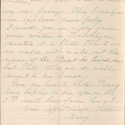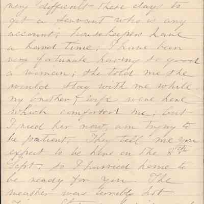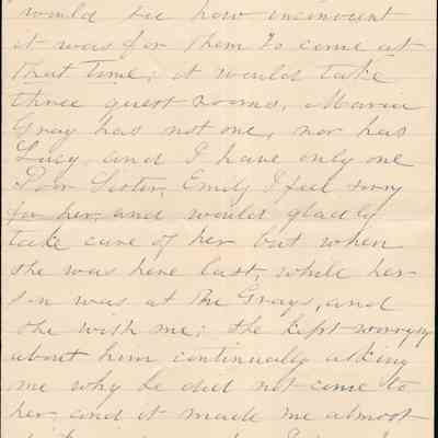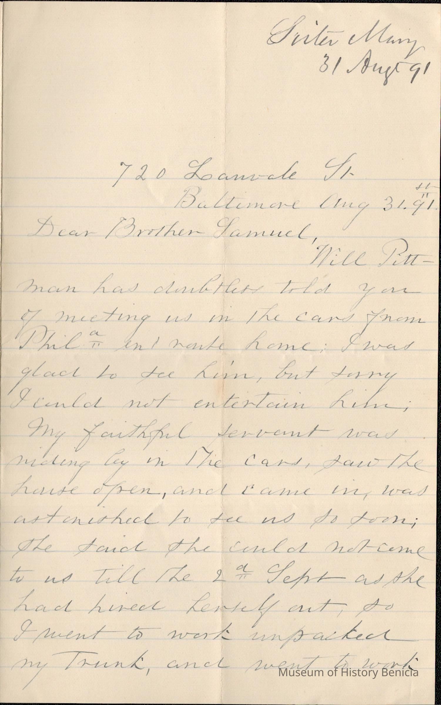 This is a letter dated 08/31/1891 from Mrs. Mary Gray Morton to her brother Mr. Samuel C. Gray regarding mainly family and travel matters. Mary says they saw William Pittman (sister Emily's husband) on the "cars". He thought they might come to Baltimore when Samuel and Fanny visit Mary. She confides in Samuel why that won't work and asks that he dissuade them from visiting her. She talks of the difficulty of finding a good housekeeper. She seems excited for Samuel's visit on the 8th. Lastly, she talks of her sadness for sister Emily.