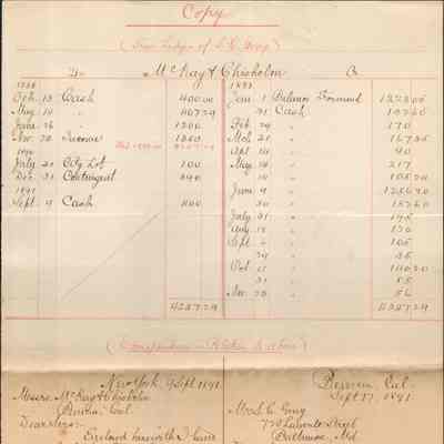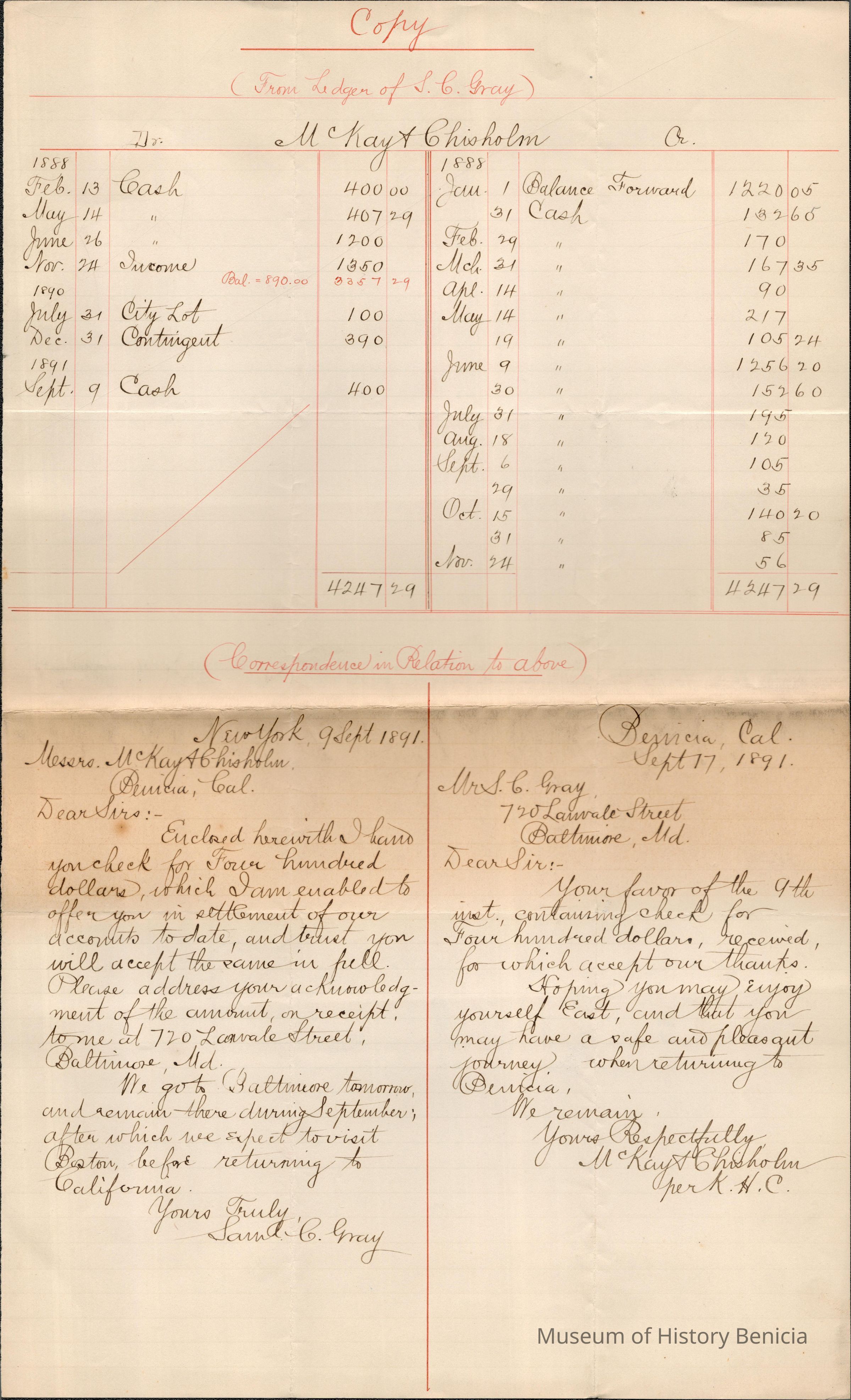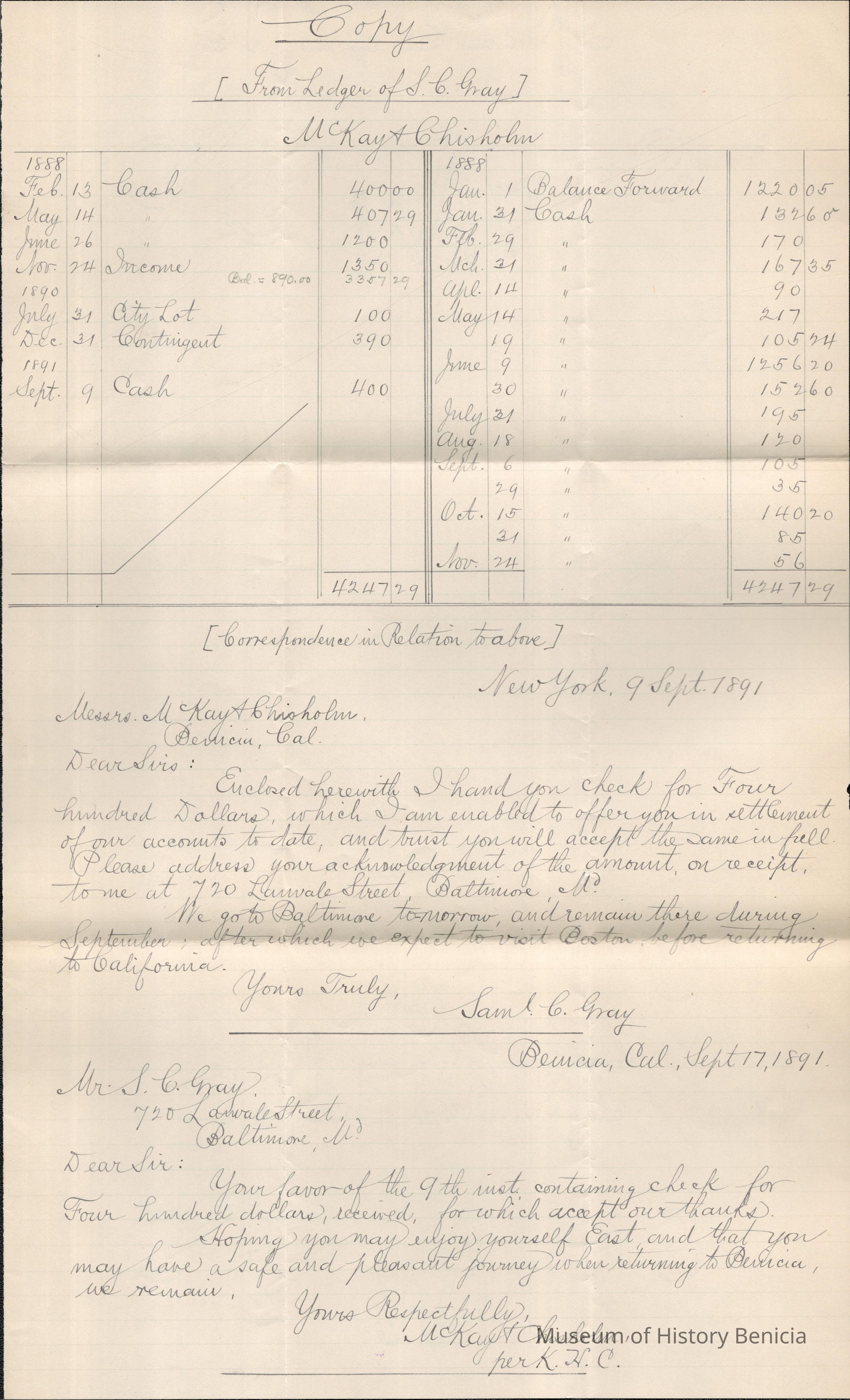 The image shows a neatly handwritten document displaying a balance sheet from Samuel C. Gray's ledger, detailing financial transactions related to the firm McKay & Chisholm, based in Benicia. The ledger entries, dated from 1888 to 1891, list amounts under categories like "Cash," "Income," and "Contingent." Below the balance sheet, there is correspondence dated September 9, 1891, from New York, where Samuel C. Gray sends a letter to McKay & Chisholm, enclosing a check for four hundred dollars, settling his account. Following this, there's a reply from McKay & Chisholm, acknowledging receipt of the check and expressing thanks, dated September 17, 1891, from Benicia, California.
