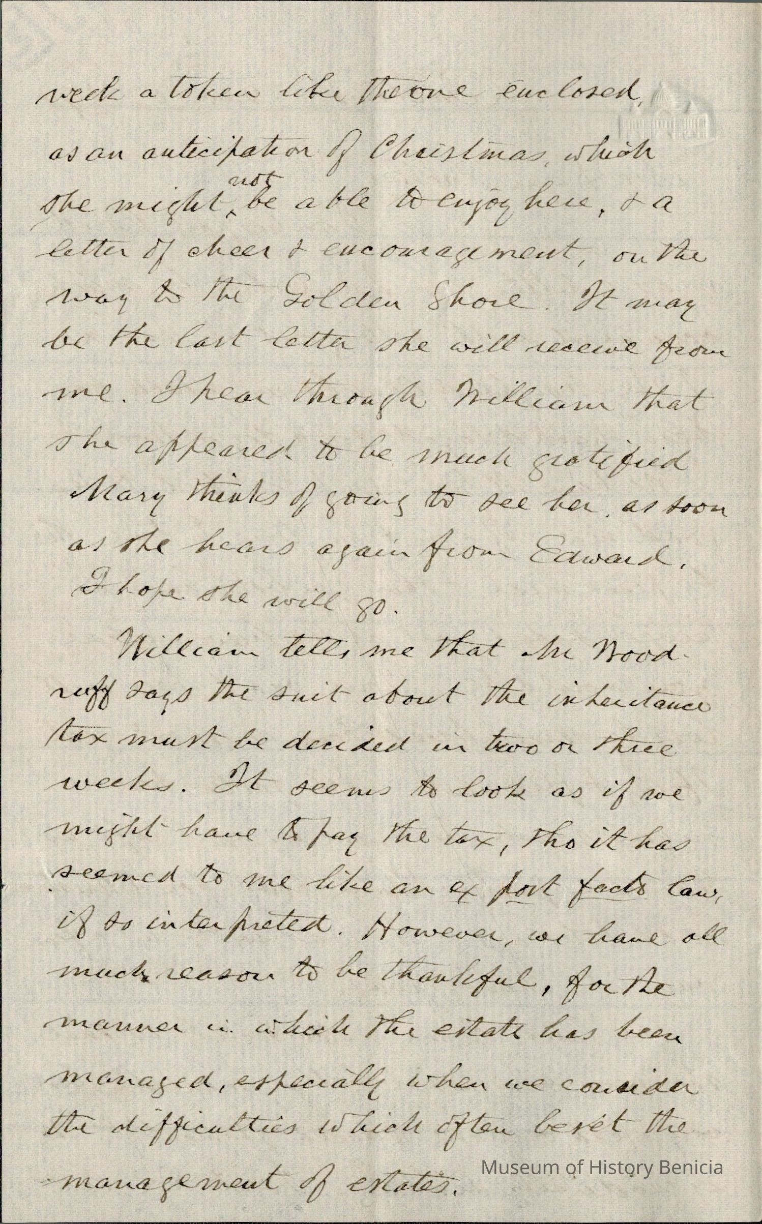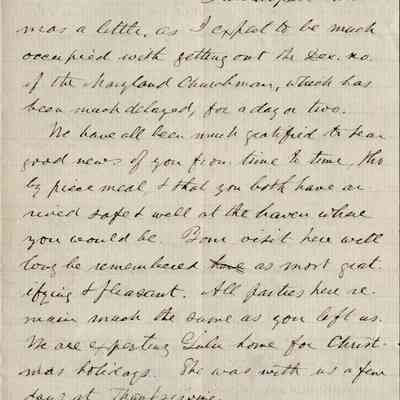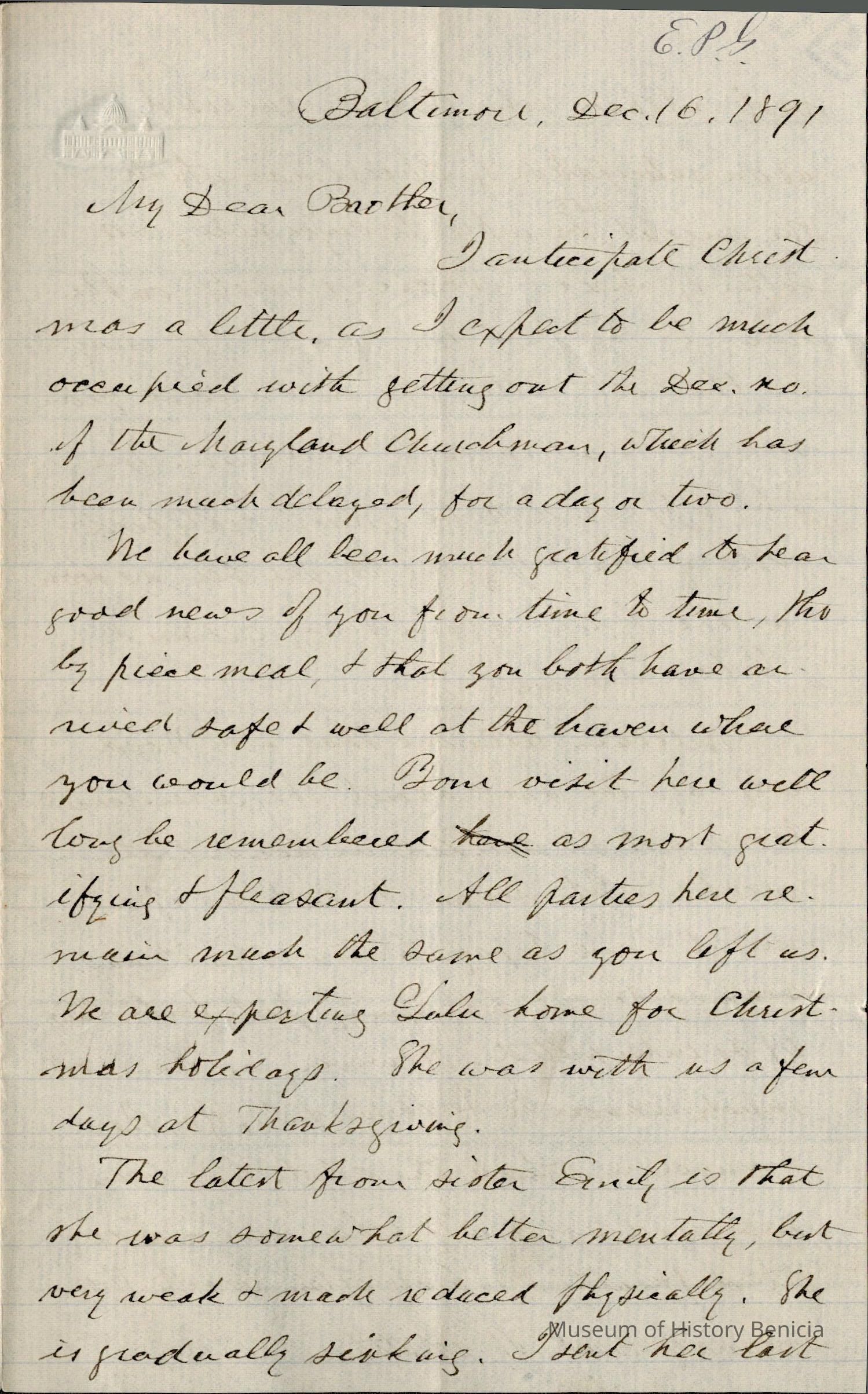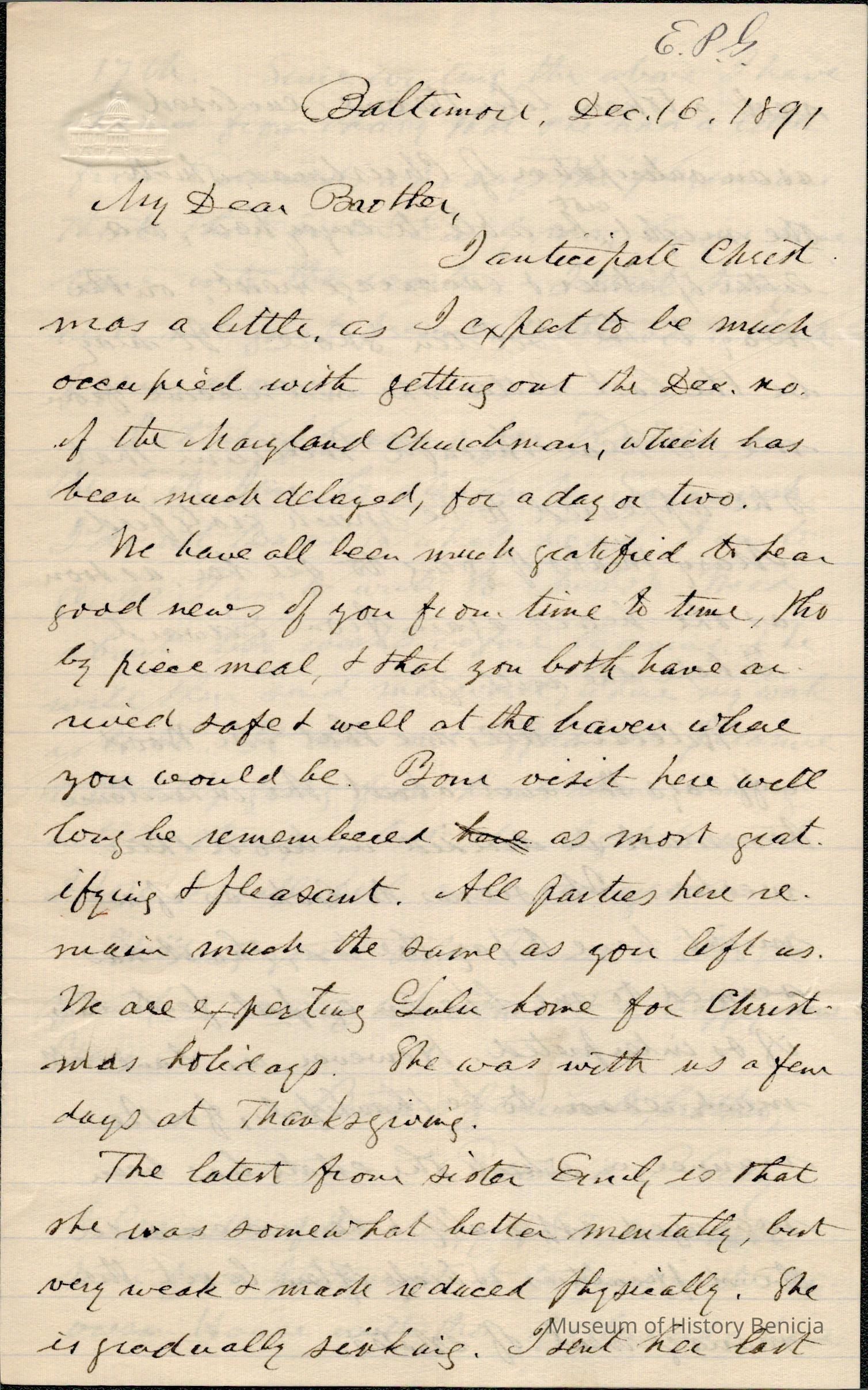 This is a letter dated 12/16/1891 from Mr. Edward Powers Gray to Mr. Samuel C. Gray regarding mainly family matters. He mentions his sister, Emily, and that this might be the last letter he sends her. (Emily was born 1812 and passed away 01/22/1891).