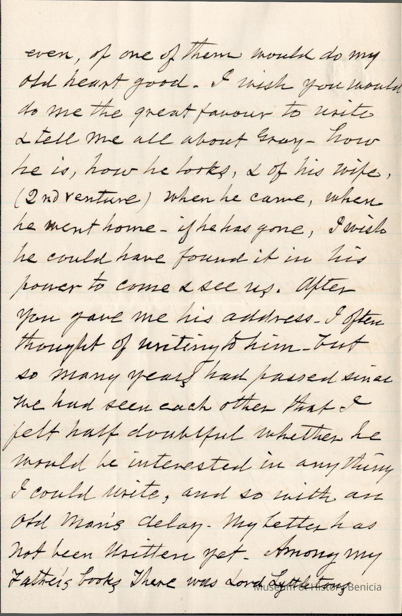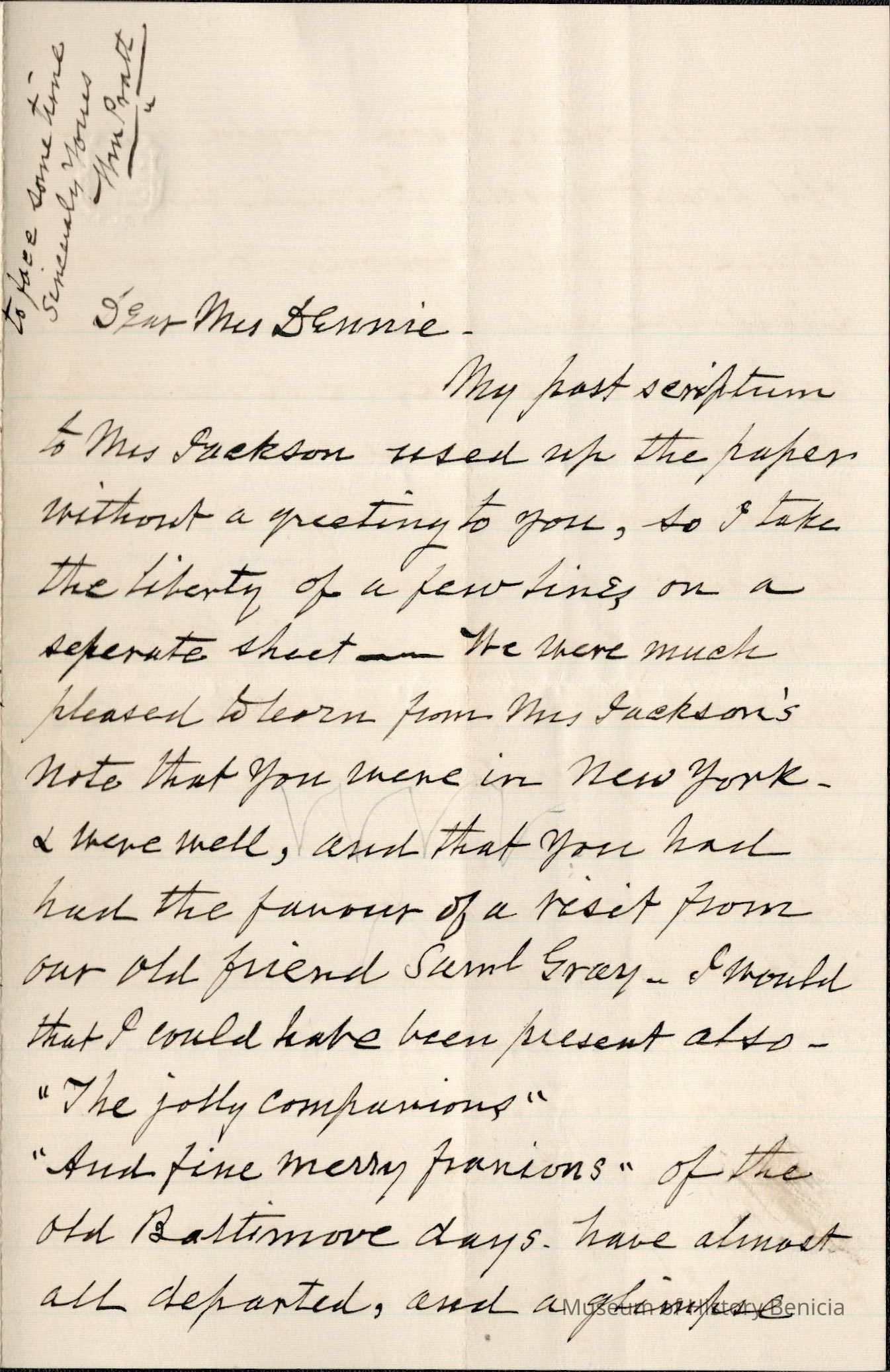 Mr. Pratt writes to Mrs. Dennie to say he wishes he could have seen Samuel Gray and his wife when they visited but wants her to tell him all about them. They were childhood friends, and he says he guesses only they and one other are left from their old