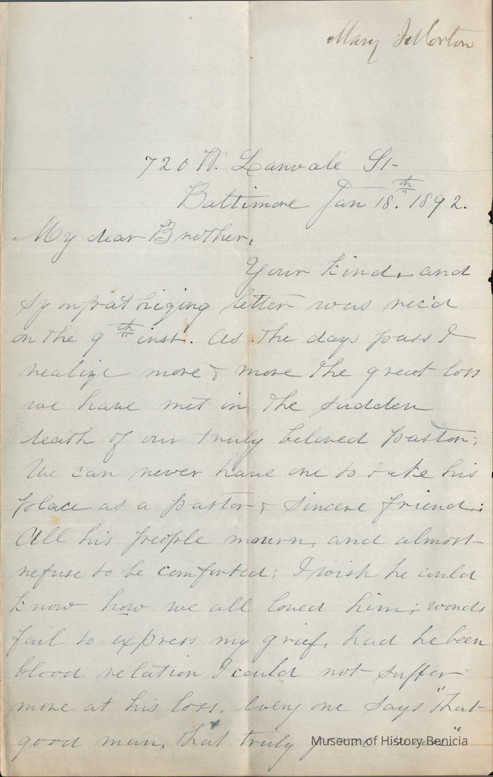 This is a letter dated 01/18/1892 from Mrs. Mary Gray Morton to her brother Mr. Samuel C. Gray regarding the retirement of Dr Grammer from St. Peter's church and family matters.