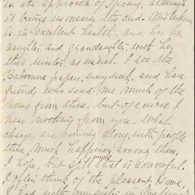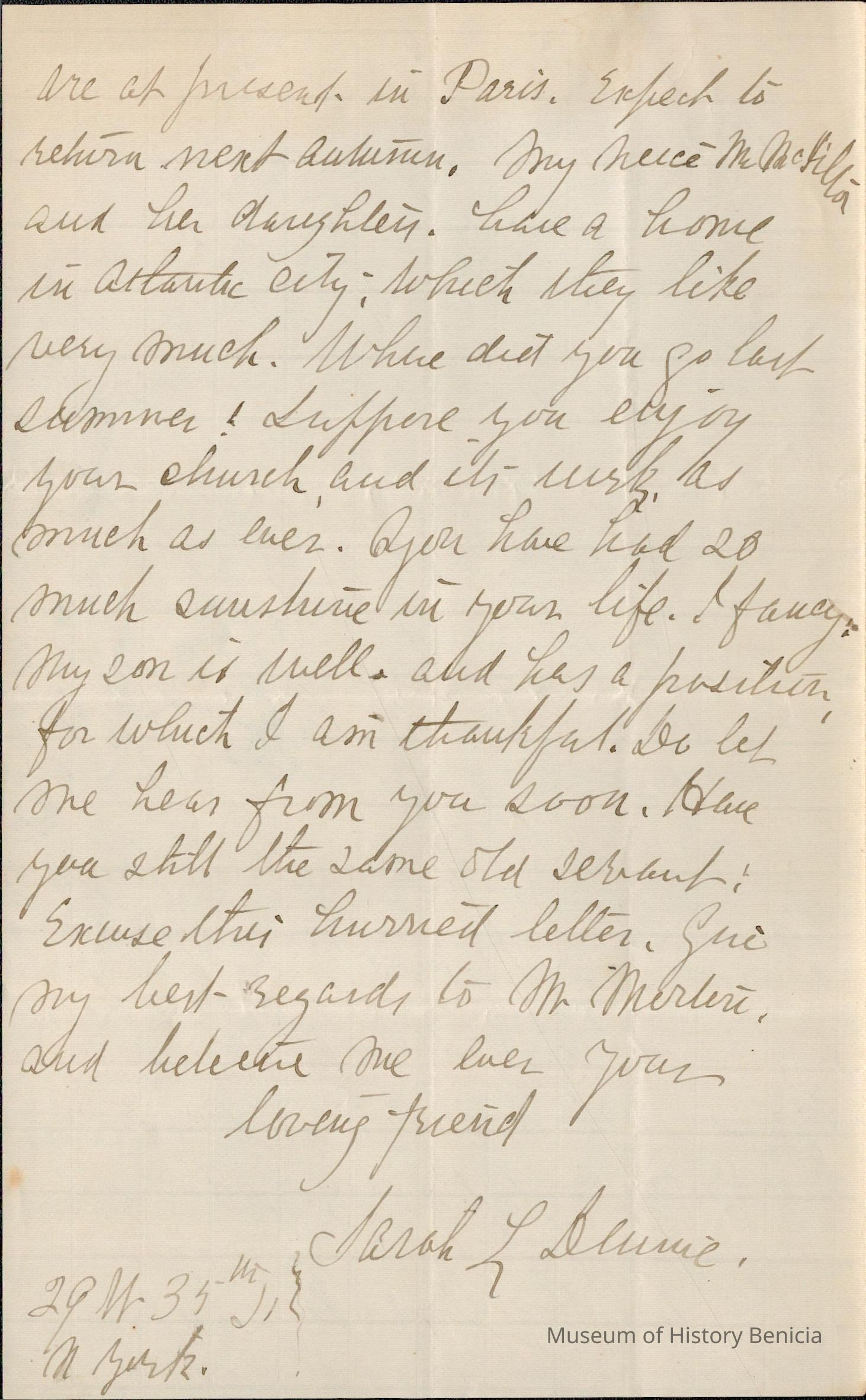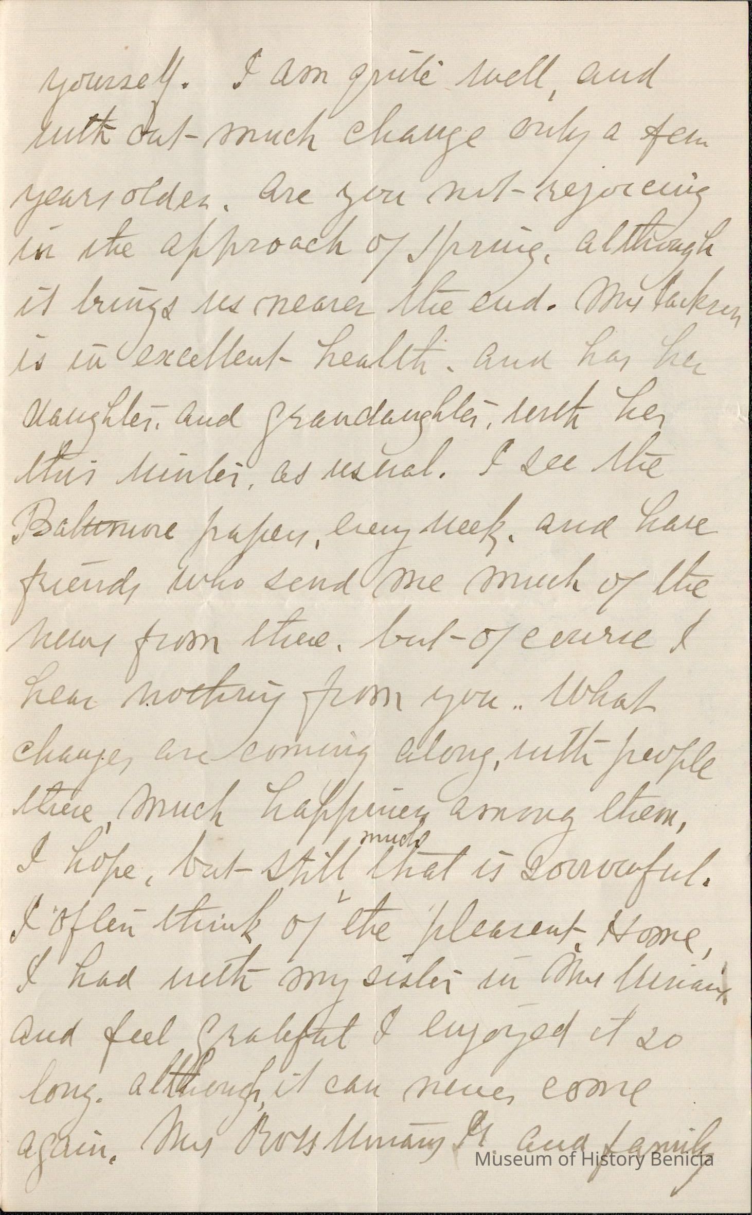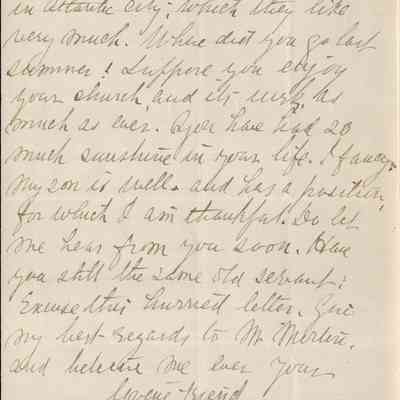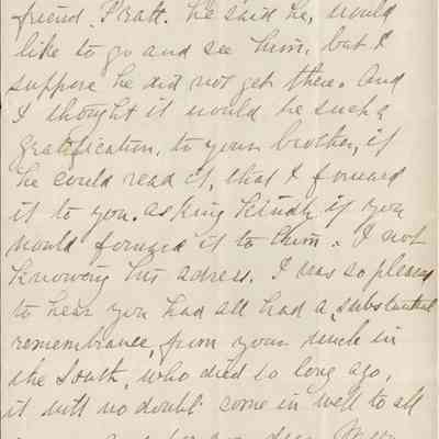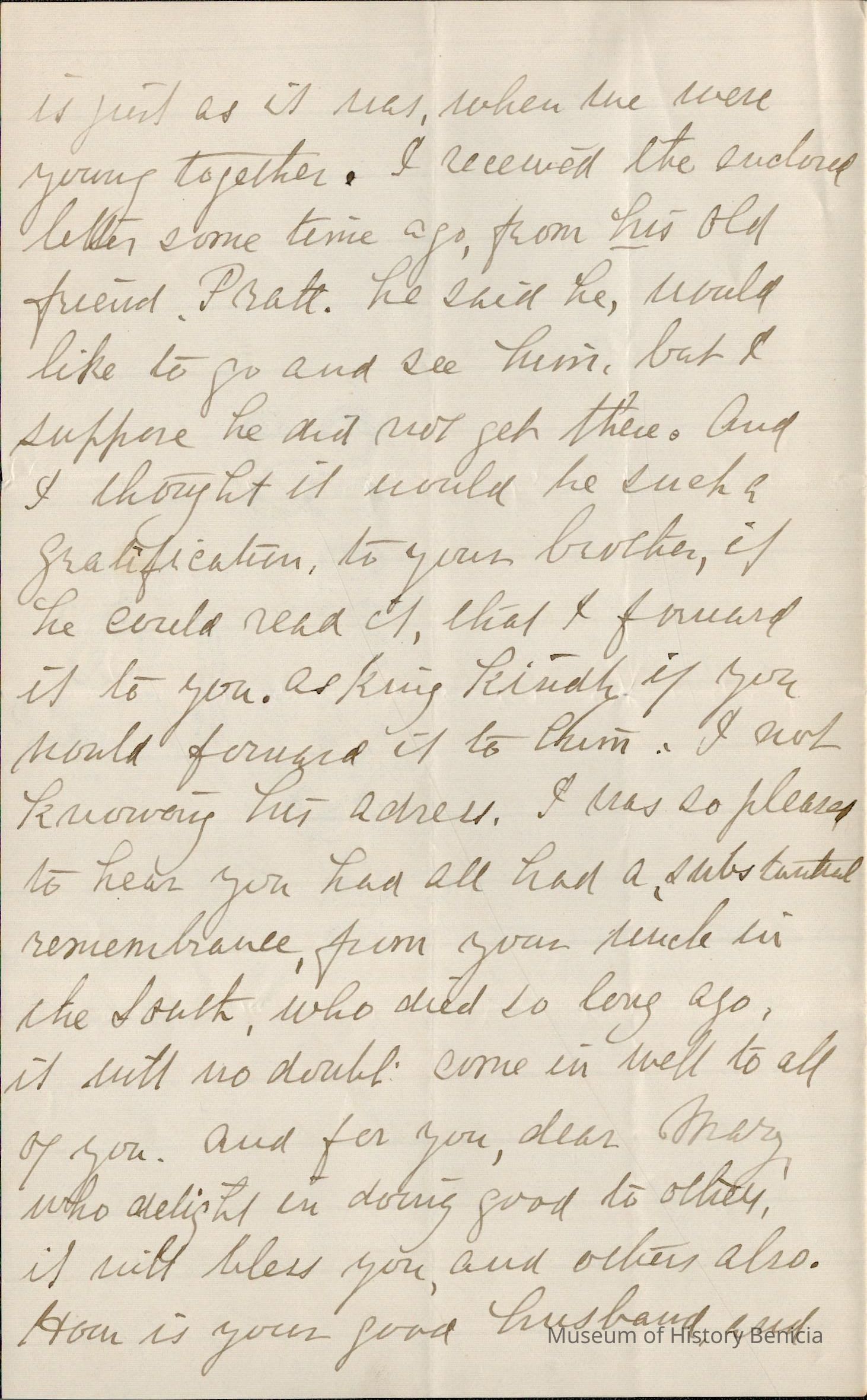 Mrs Dennie talks of having had a visit from Samuel and his wife Fannie last summer. She says she is sending Mary a letter she received from Mr. Pratt, Samuel's friend, because she doesn't think he was able to see him when they were visiting last summer.