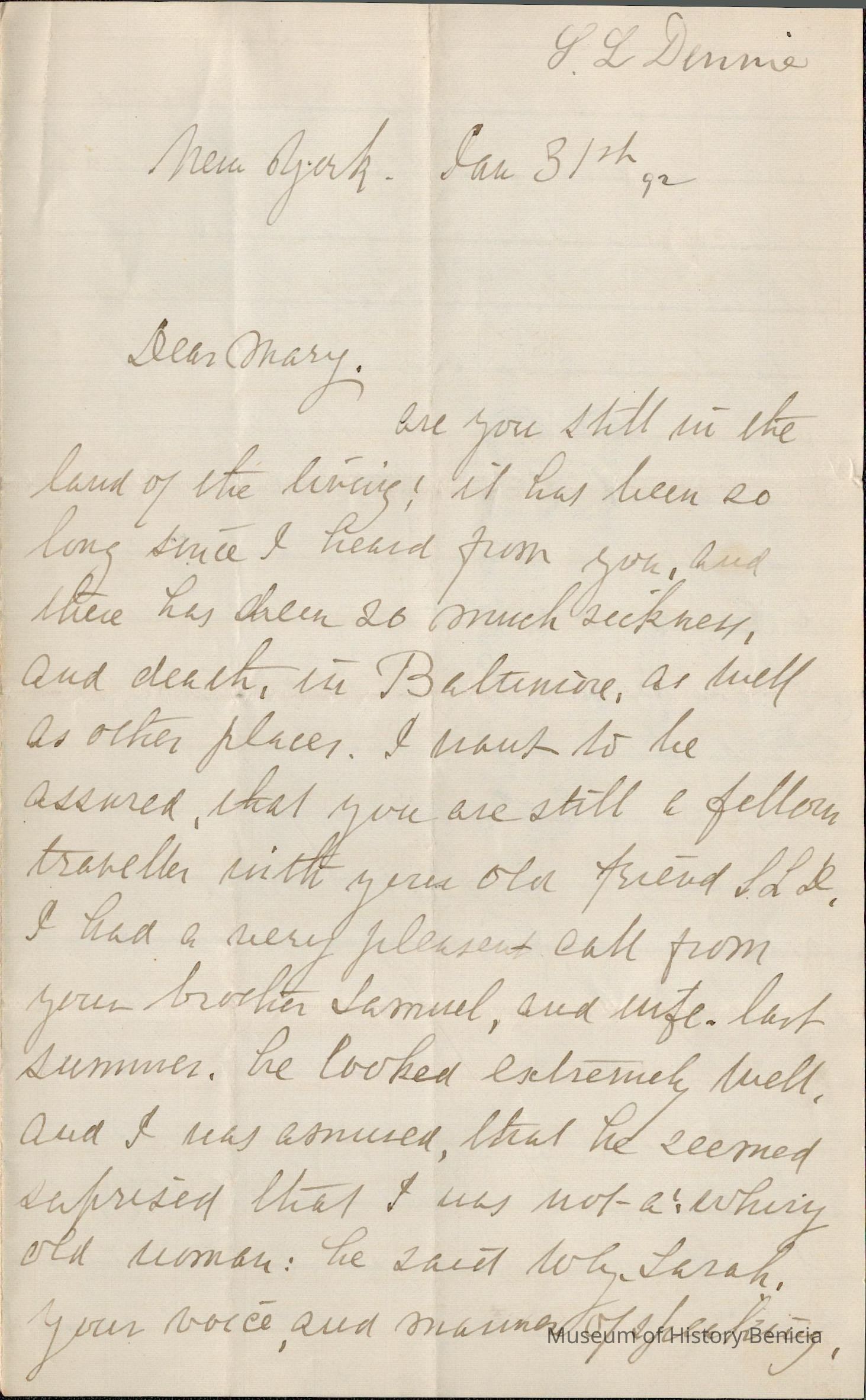 This is a letter dated 01/31/1892 from Sarah L Dennie to Mrs. Mary Gray Morton who sent it to her brother Mr. Samuel C. Gray regarding Mr. Pratt. (The letter from Sarah L. Dennie is 348.2 and one from William Pratt is accessioned as 348.3).