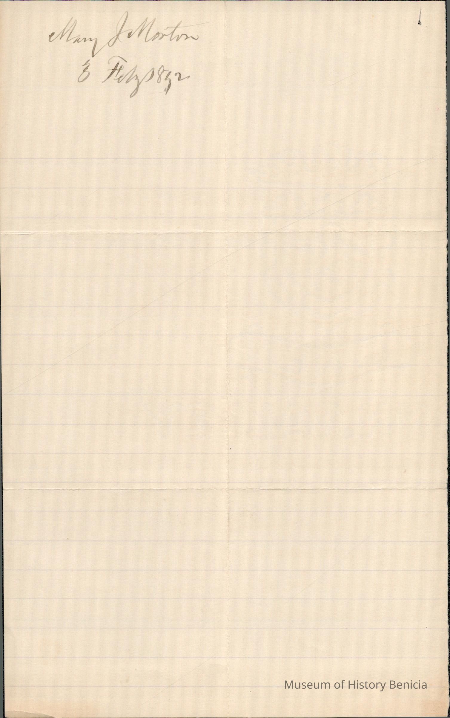 This is a letter dated 02/03/1892 from Mrs. Mary Gray Morton to her brother Mr. Samuel C. Gray regarding mainly family matters. She does mention that their sister Emily Naomi Pittman's (1812 - 1892) body was placed in a temporary vault in Troy, NY to be moved to a cemetery in Brooklyn in the Spring.