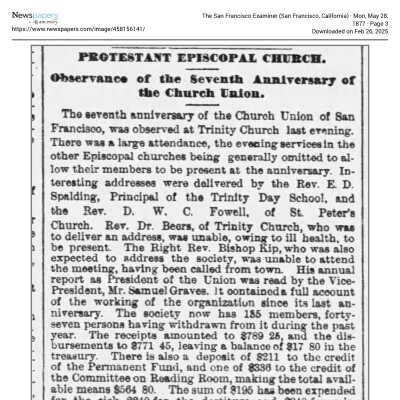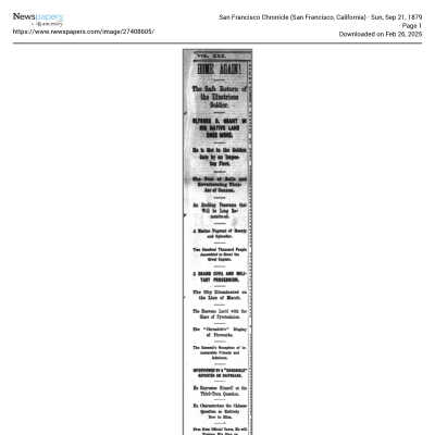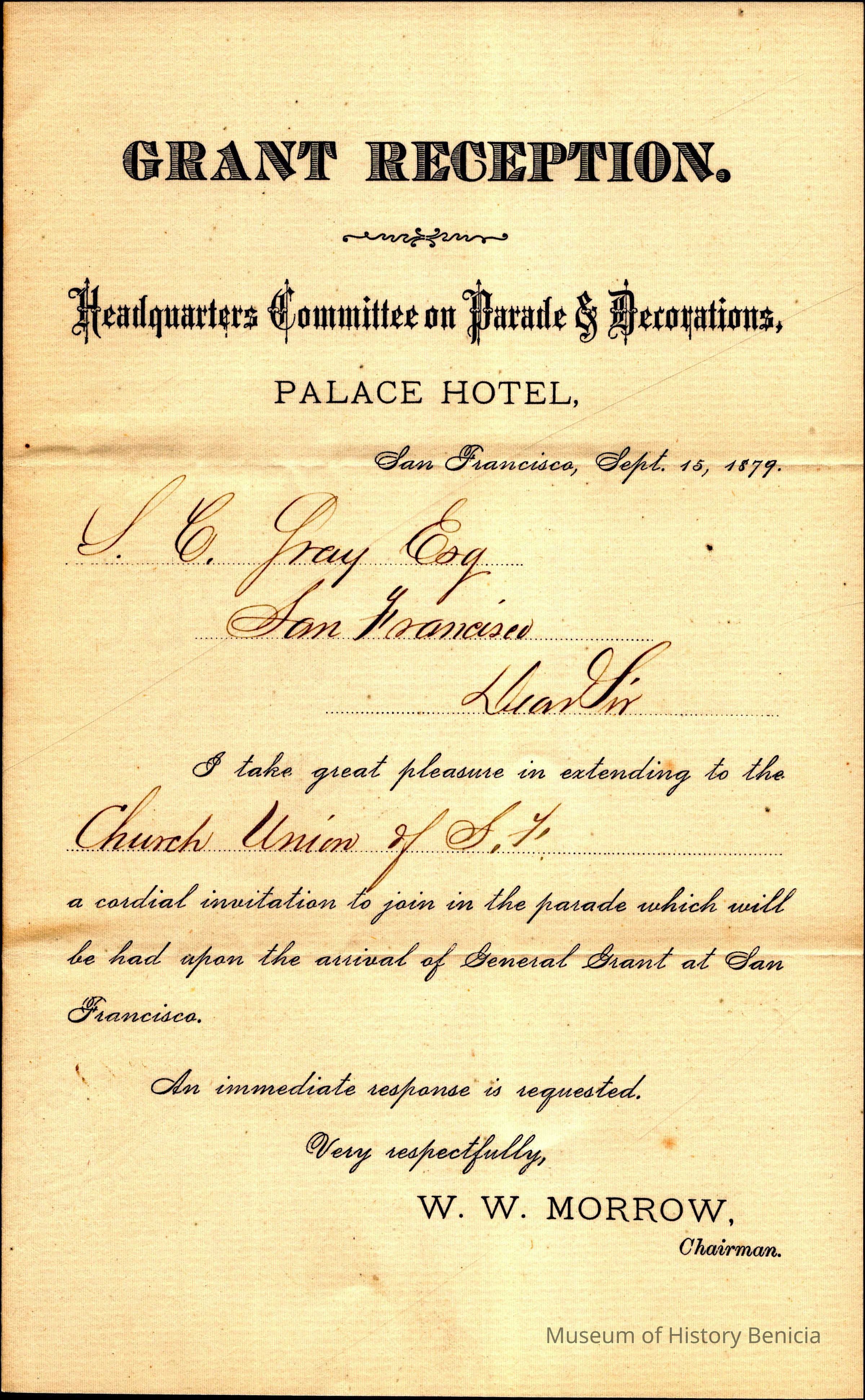 This is a flyer to Samuel C Gray in San Francisco from members of the General Grant Reception Committee inviting the Church Union of San Francisco to a reception at the Palace Hotel for General Grant dated 09/18/1879. General Grant was on a world tour and was returning to the U.S. from Japan.Collection
