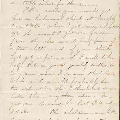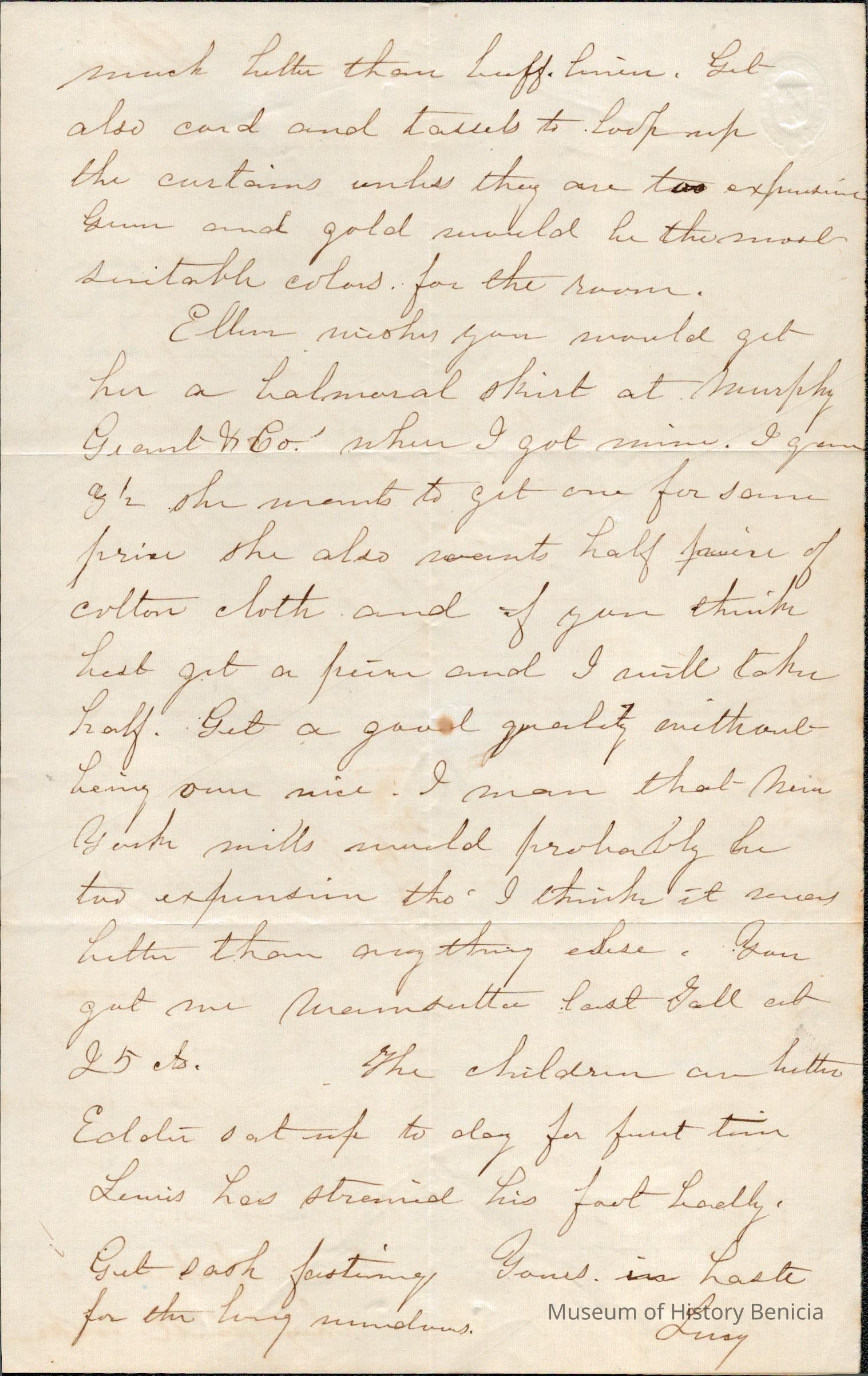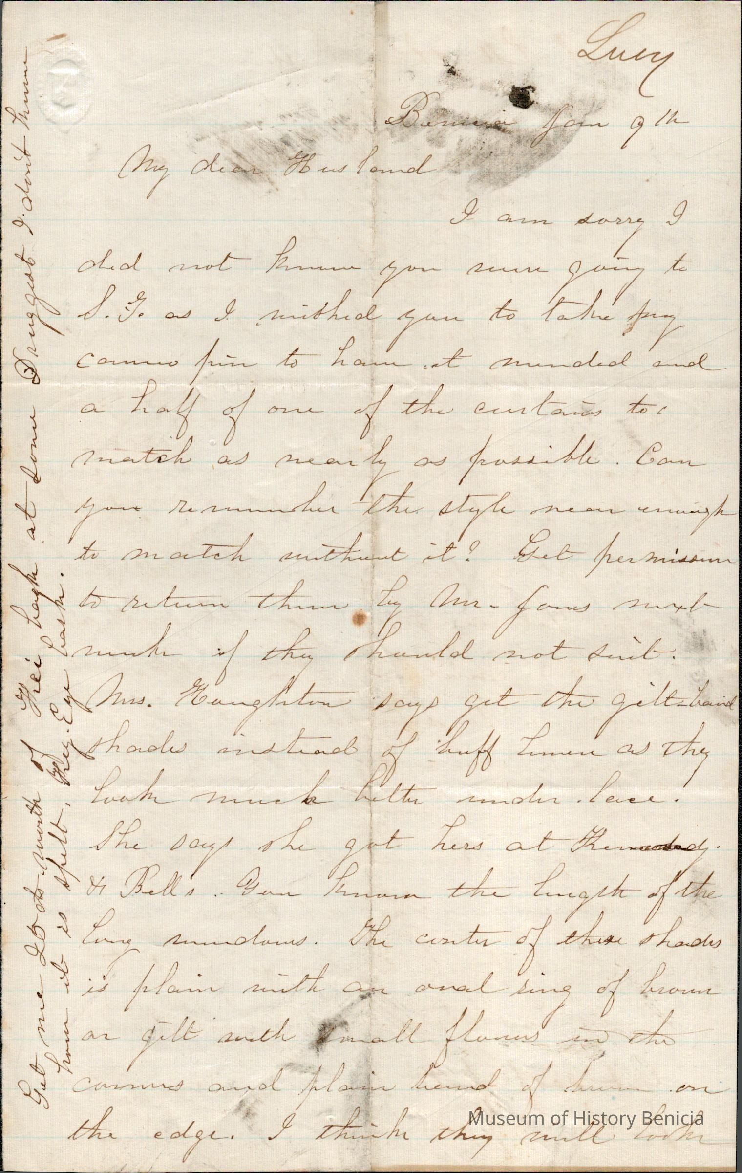 This is a letter from Lucy Gray in Benicia to Samuel Gray probably in San Fracisco. The letter mainly concerns buying curtains.