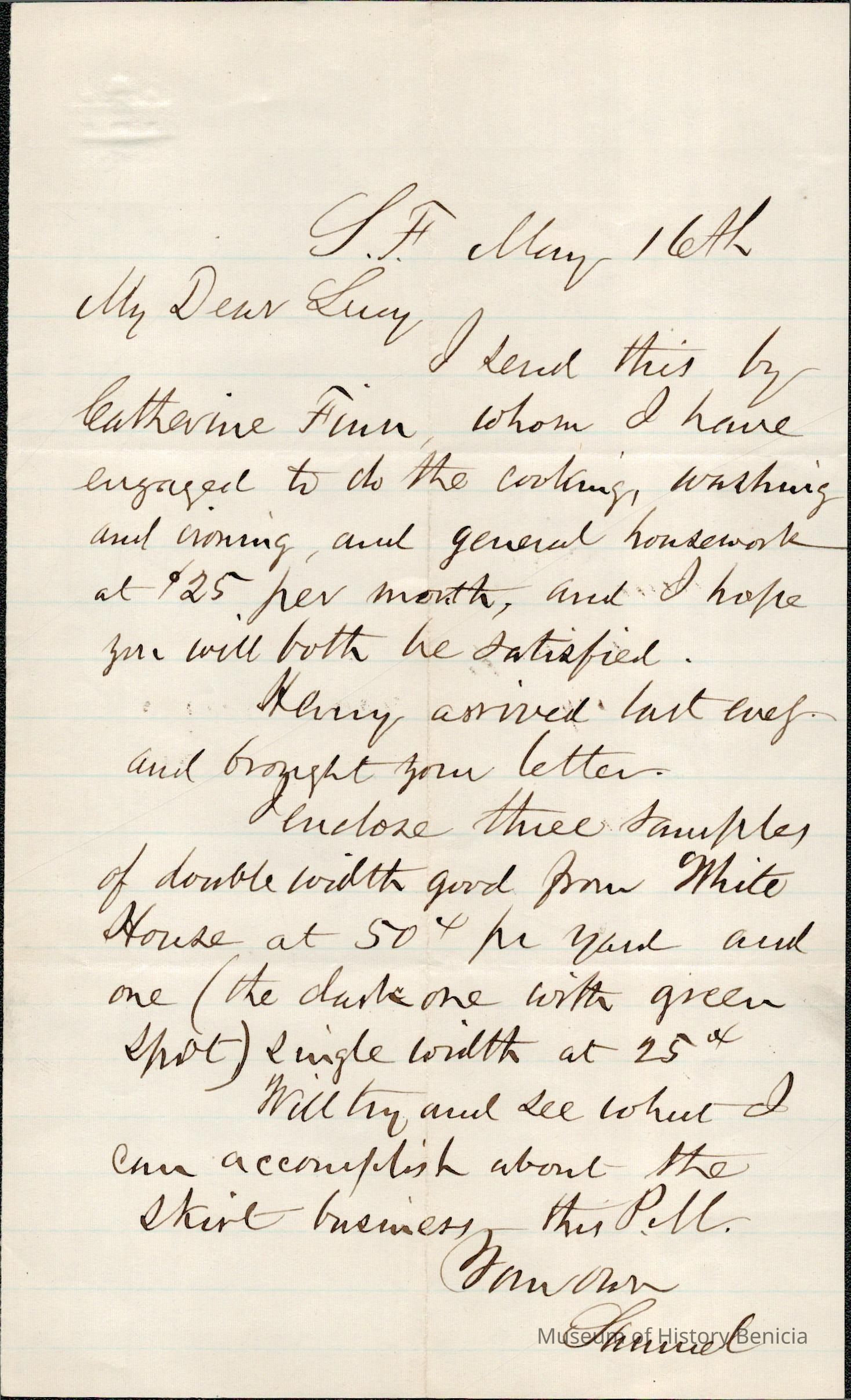 This is a letter from Samuel C Gray to his wife Lucy Wetmore Gray when he was in San Francisco, CA.