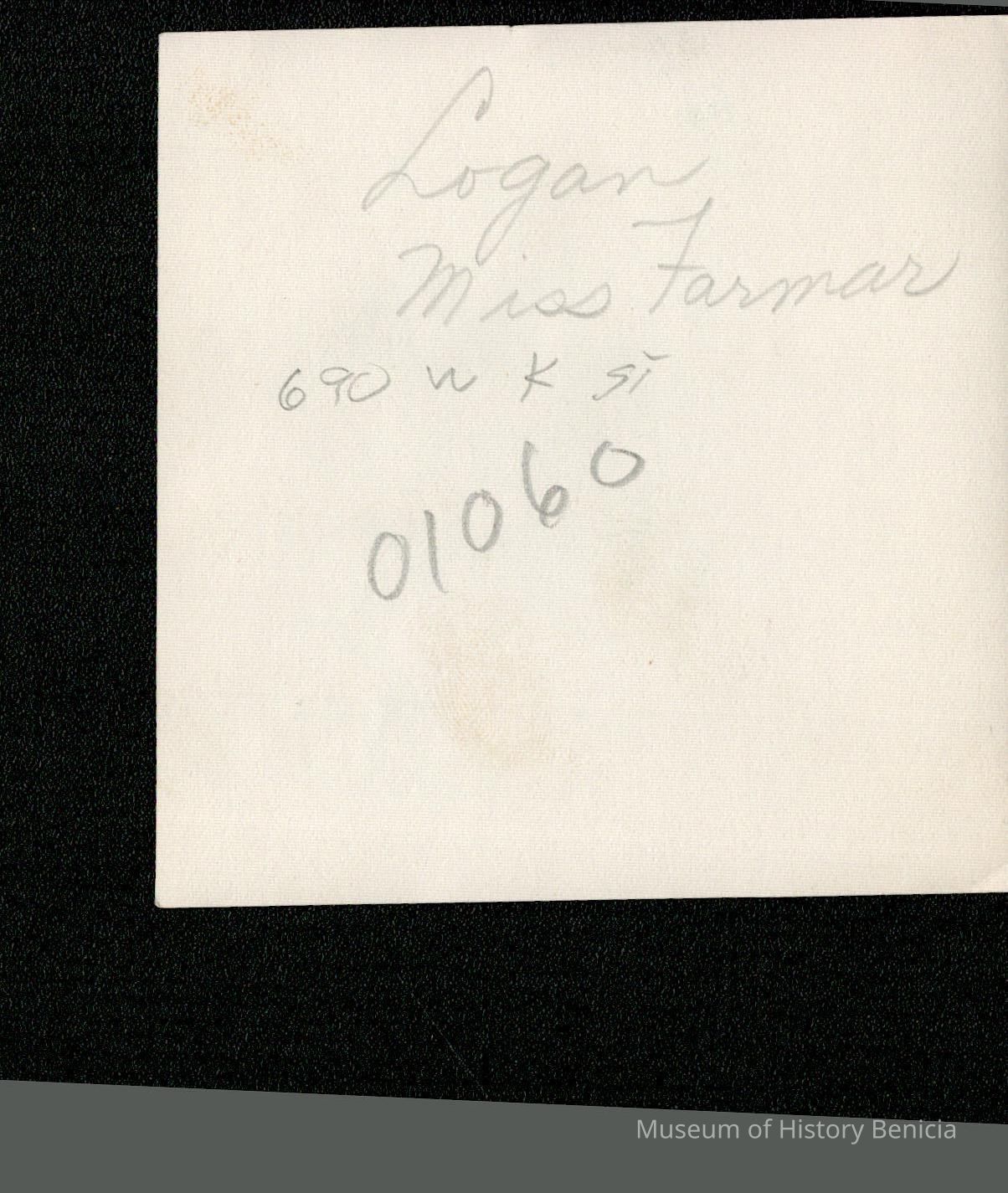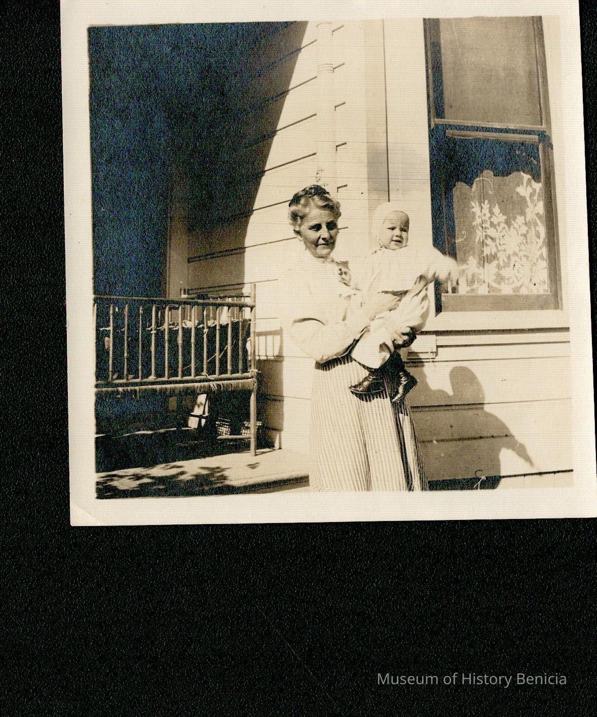 This is a photograph of Logan Stewart Gray with Mary Farmar. Logan is related to Samuel Cotton Gray. Mary Farmar boarded with the Gray family in Benicia and was treated like a member of the family. The house is at 690 W K st.