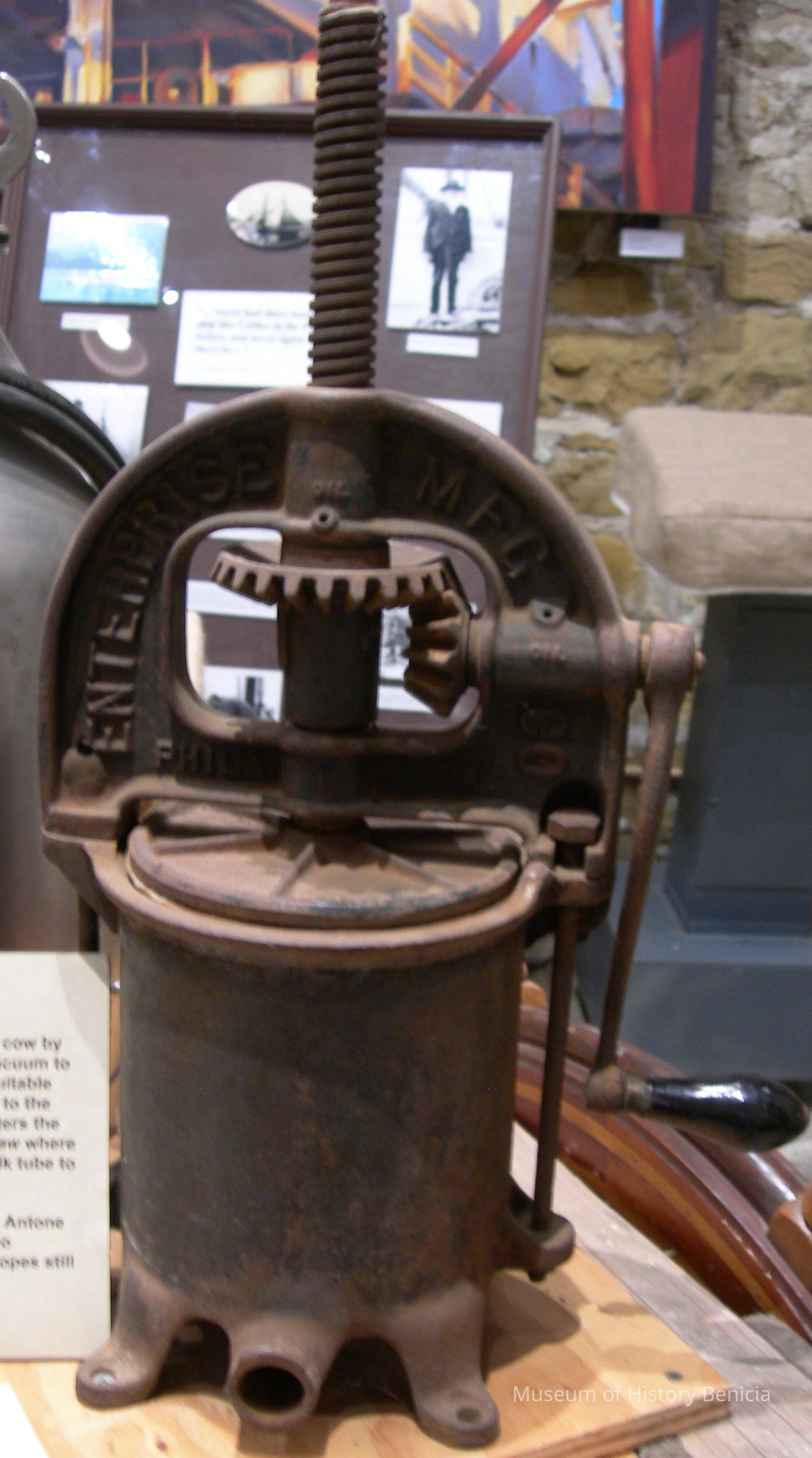 Heavy metal sausage maker "Enterprise MFG Co., Phila, PA" made in U.S.A. 2074". Has four flanges on bottom w/holes to attach to counter/base. Crank handle is wood painted blackCollection