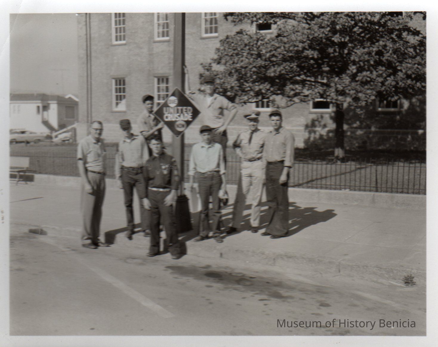 B/W copy of a print. Eight men (mostly young) standing around a lamp post bearing a diamond-shaped sign reading "Give/United Crusade/Now" side of capitol building in background. Standing on ground L-R: Mike Fitzgerald, Danny Stroud, Harland Hall, unknown youth, unknown adult in military uniform, Milford Hodges. Standing behind L-R: Vernon Stroud, Mike Connell.