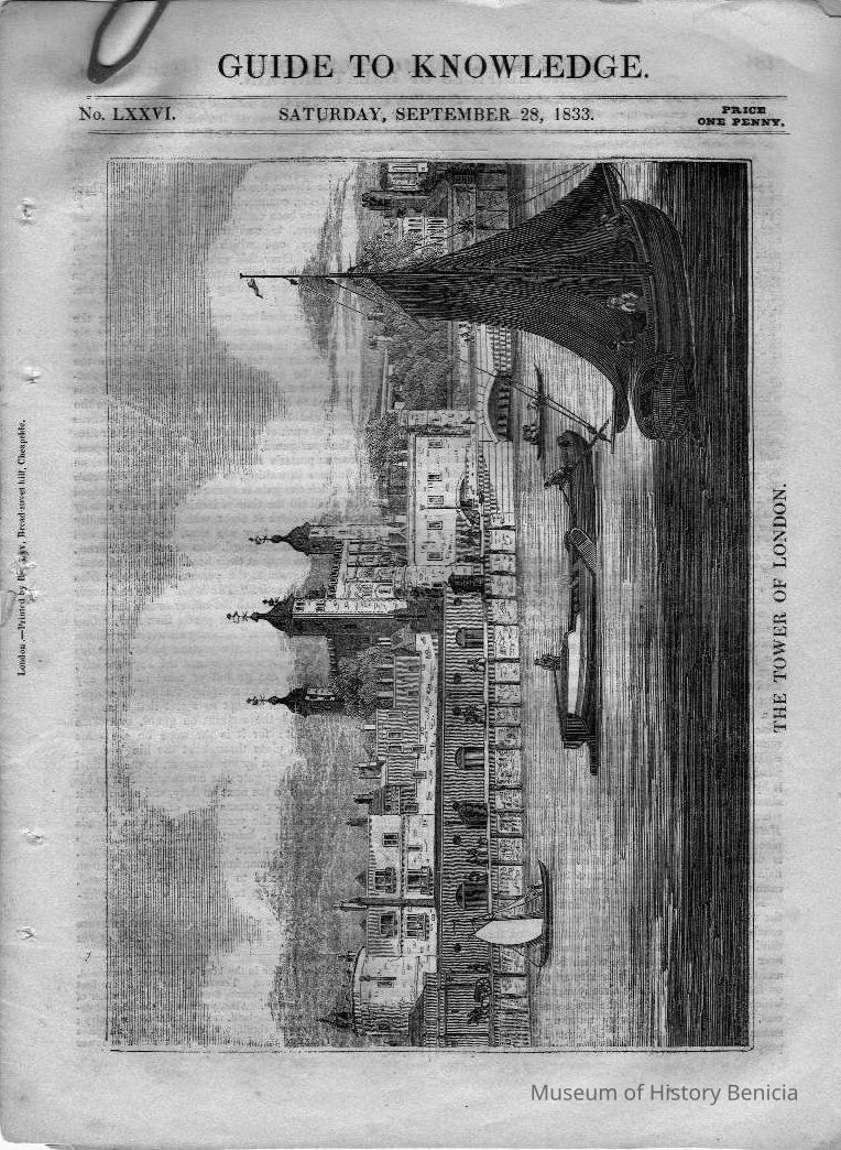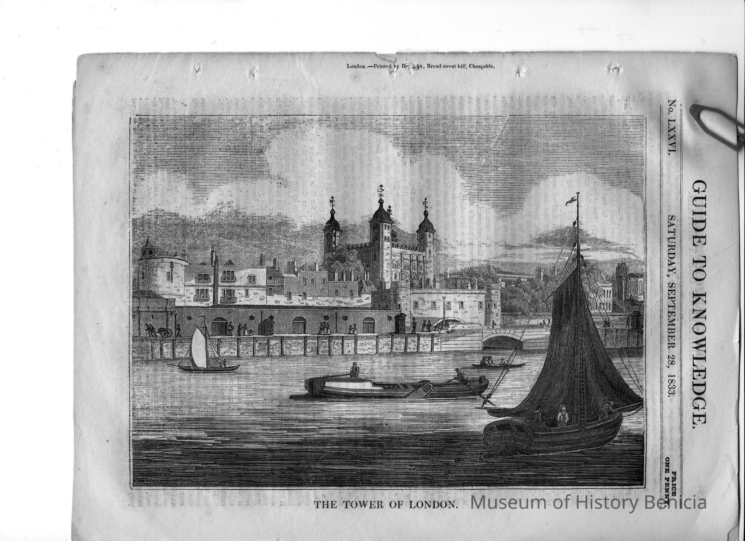 3-page section, printed front and back "Pinnock's Guide to Knowledge/Public Edifaces of Great Britain/ II-the Tower of London/No. LXXVI/ Saturday, September 28, 1833" See also 85.11.3and 85.11.4Collection