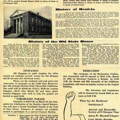 "This wide-spread call is to initiate a roaring celebration of Clamper Day, March 14, i Benicia, to pay a solumn tribute to that historic city and to celebrate the restoration and preservation of the Old State House of Benicia."