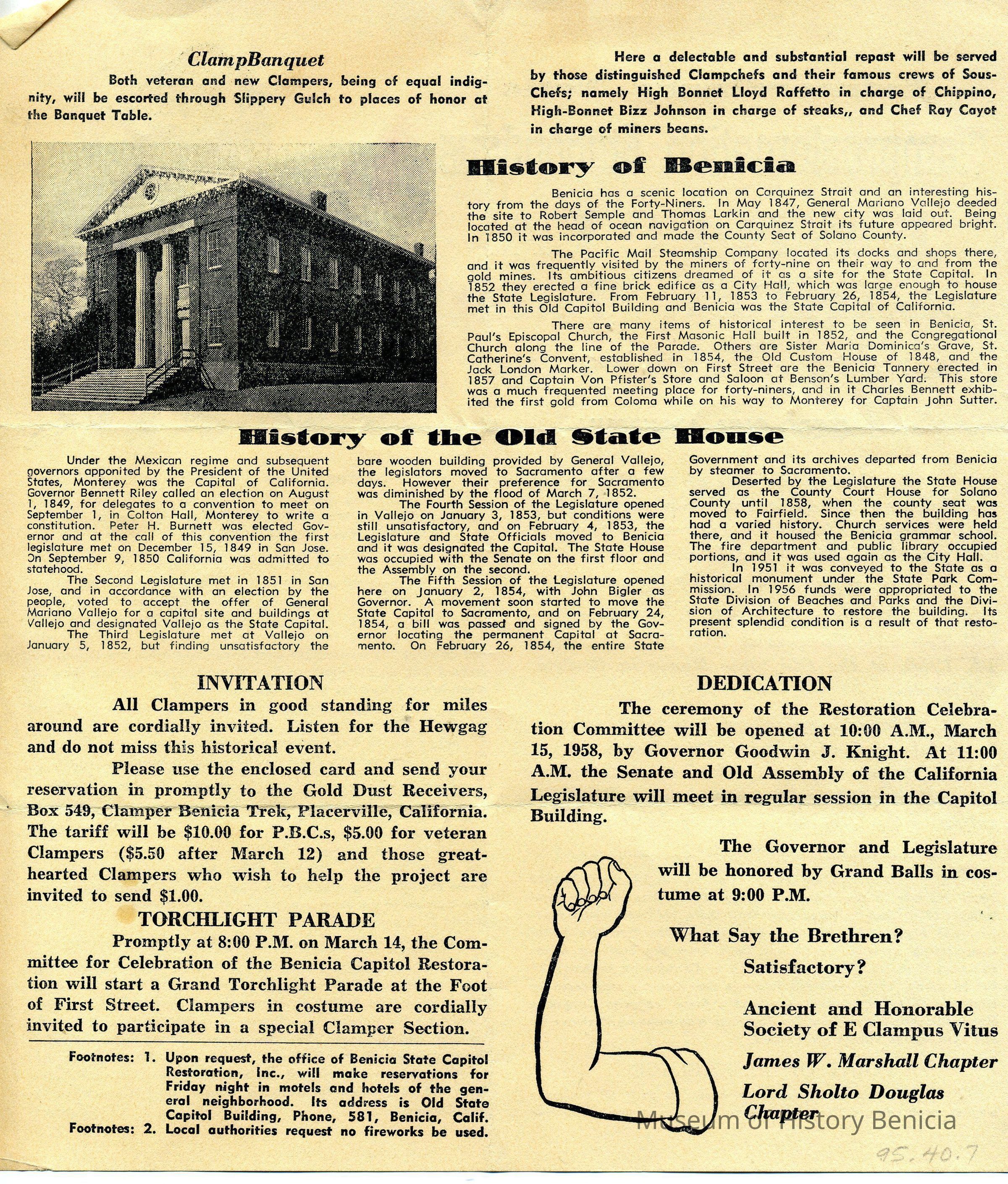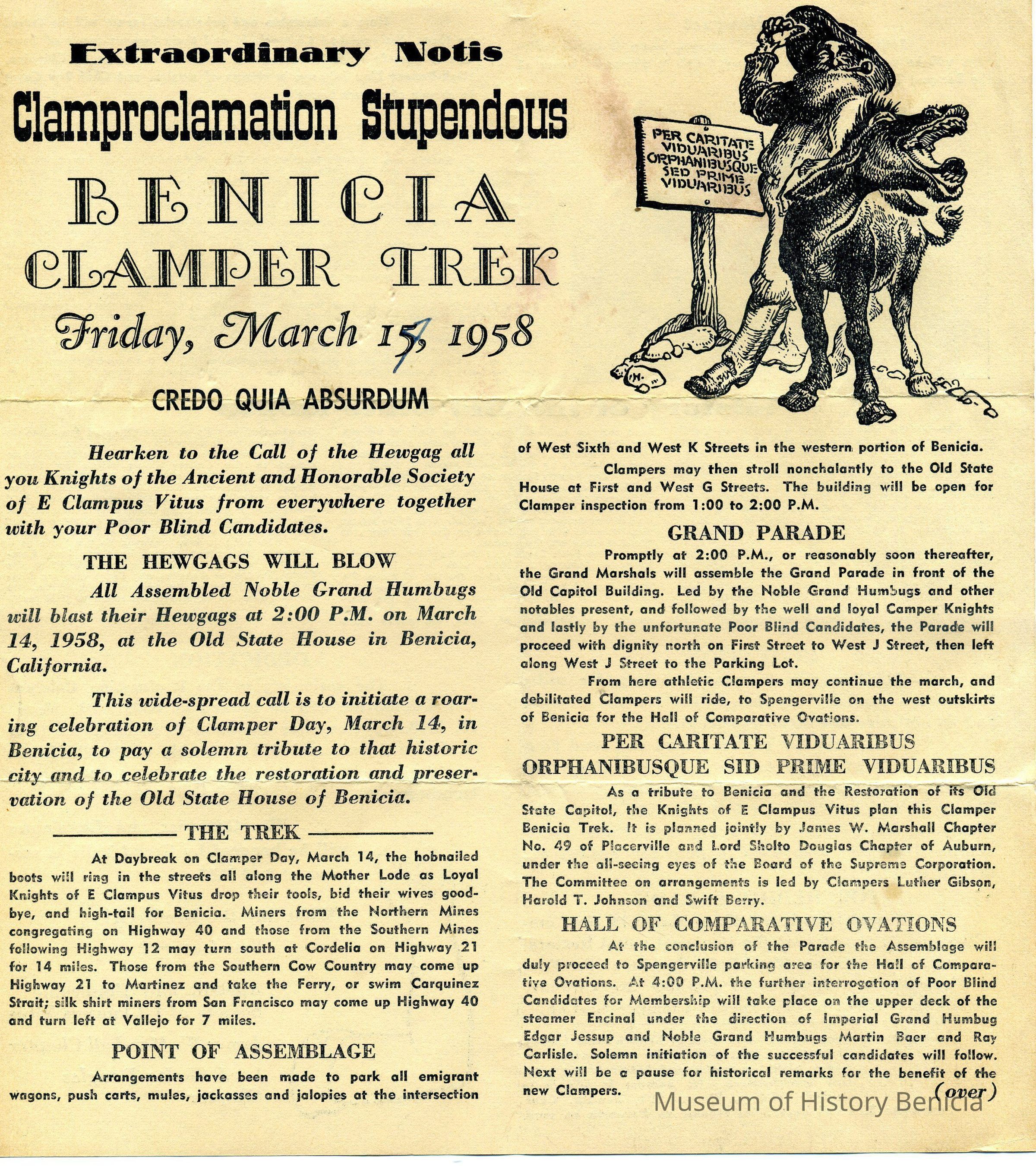 The Group, Ancient and Honorable Society of E Clampus Vitus, was advertising an event to be held in Bencia to celebrate the restoration of the Benicia Capitol Bulilding