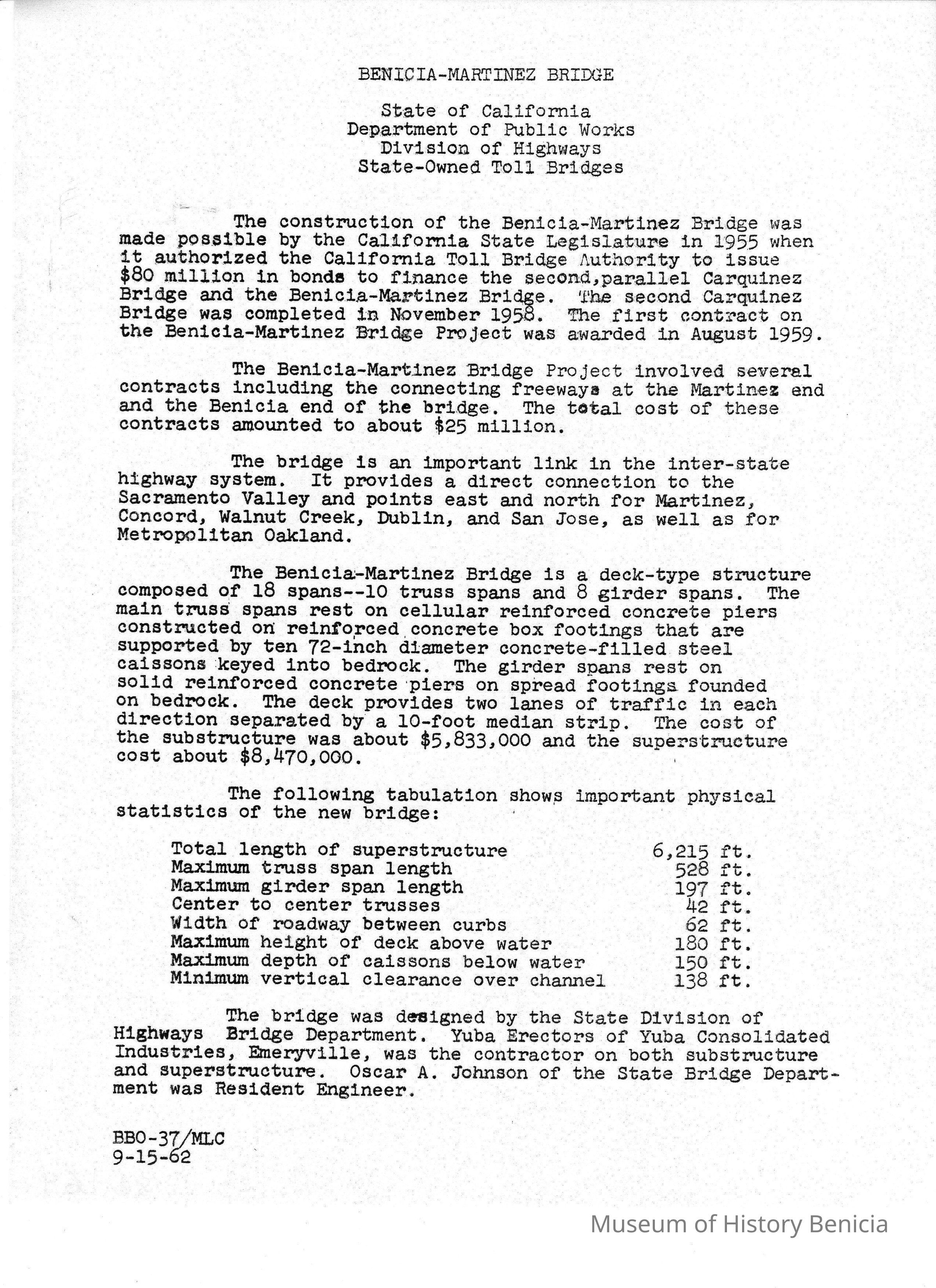 Handbill recording the vital statistics (cost, dimensions, etc.) of the Benicia-Martinez Bridge. Dated 9-15-62.