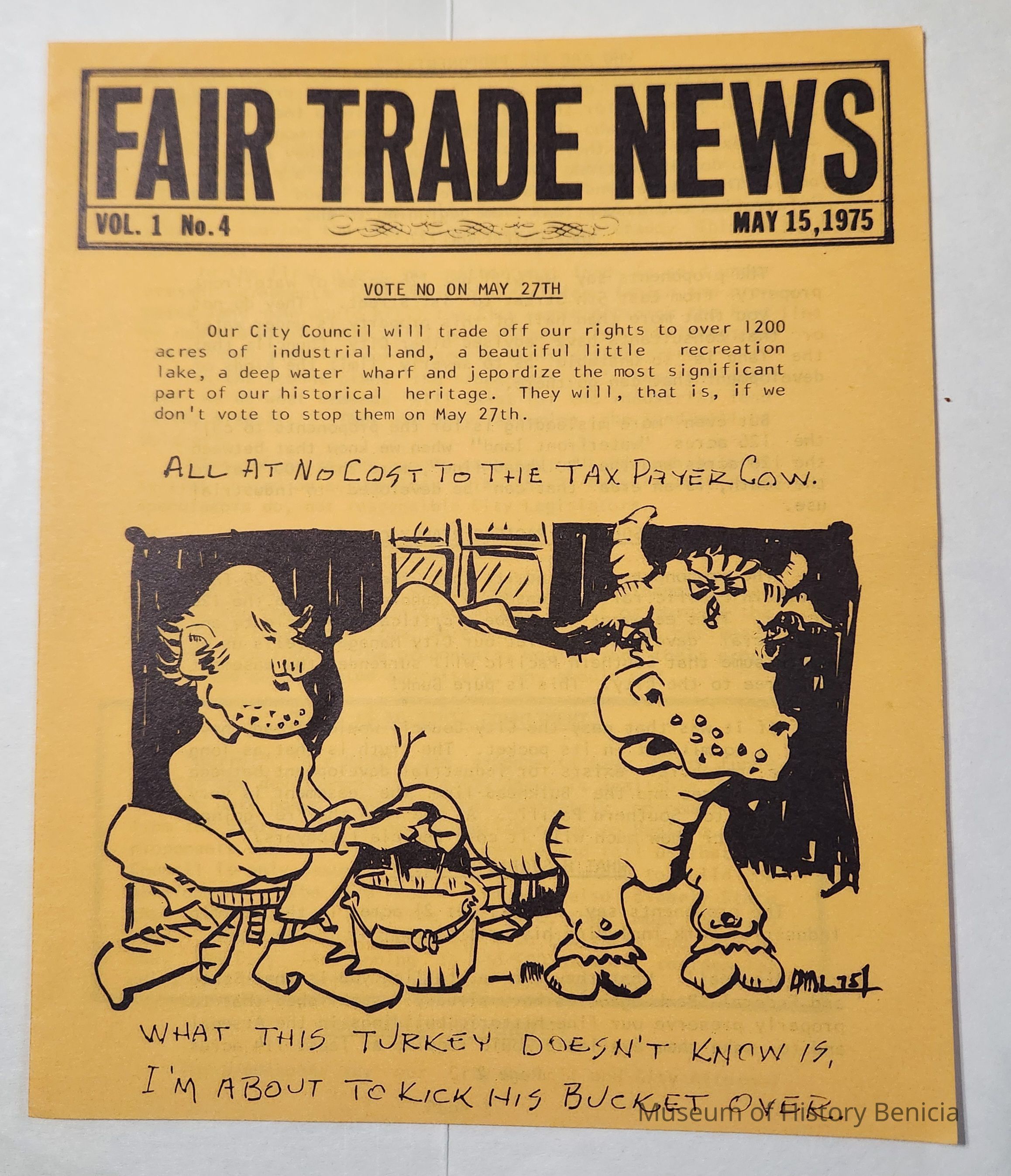 It is a handbill voicing opinions in opposition to the land swap proposal between the City of Benicia and Benicia Industries. Benicia voters were urged to vote NO at the election to be held on May 27th. Black ink on gold paper with a cartoon/drawing on the front and typed text throughout. On the back: Published by: Benicia Fair Trade Committee / 675 East 'H' Street.Collection
