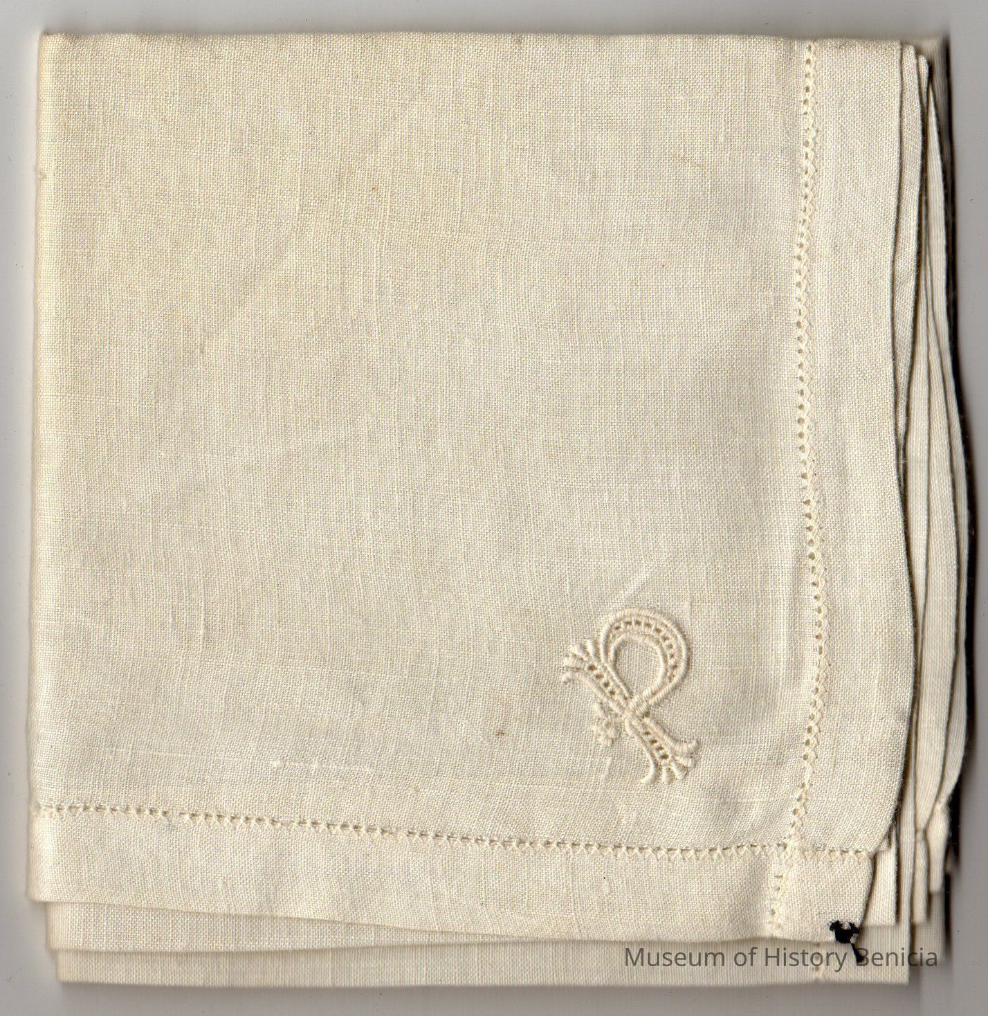 White handkerchief with an embroidered "P". Attached is a note that reads "1 handkerchief marked "P" probably belonged to B. M. Potts"