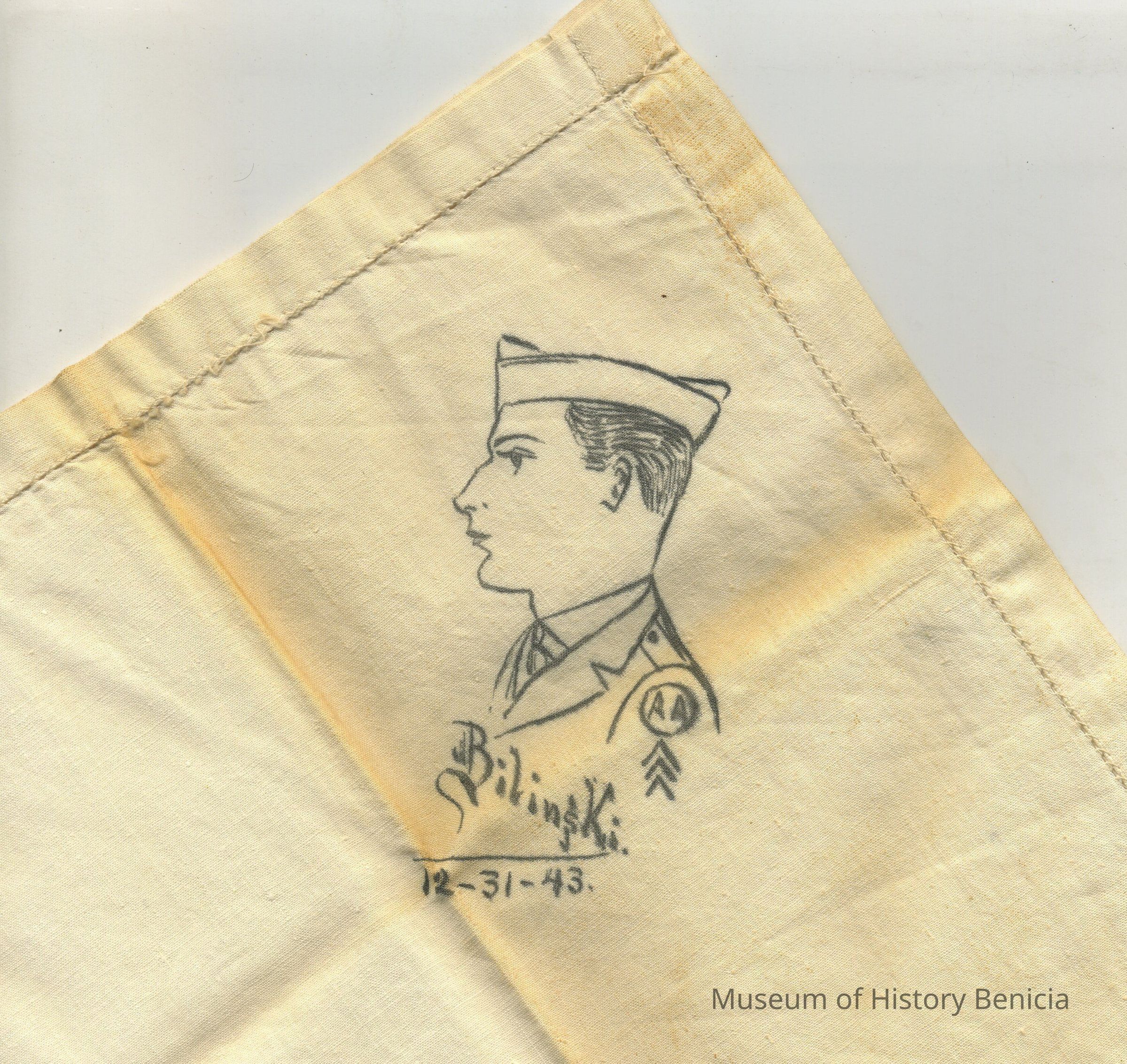 Men's Handkerchief - in one corner is a drawing done by Thomas Donohue of a soldier with the name "Bilinski" and date "12-31-43"