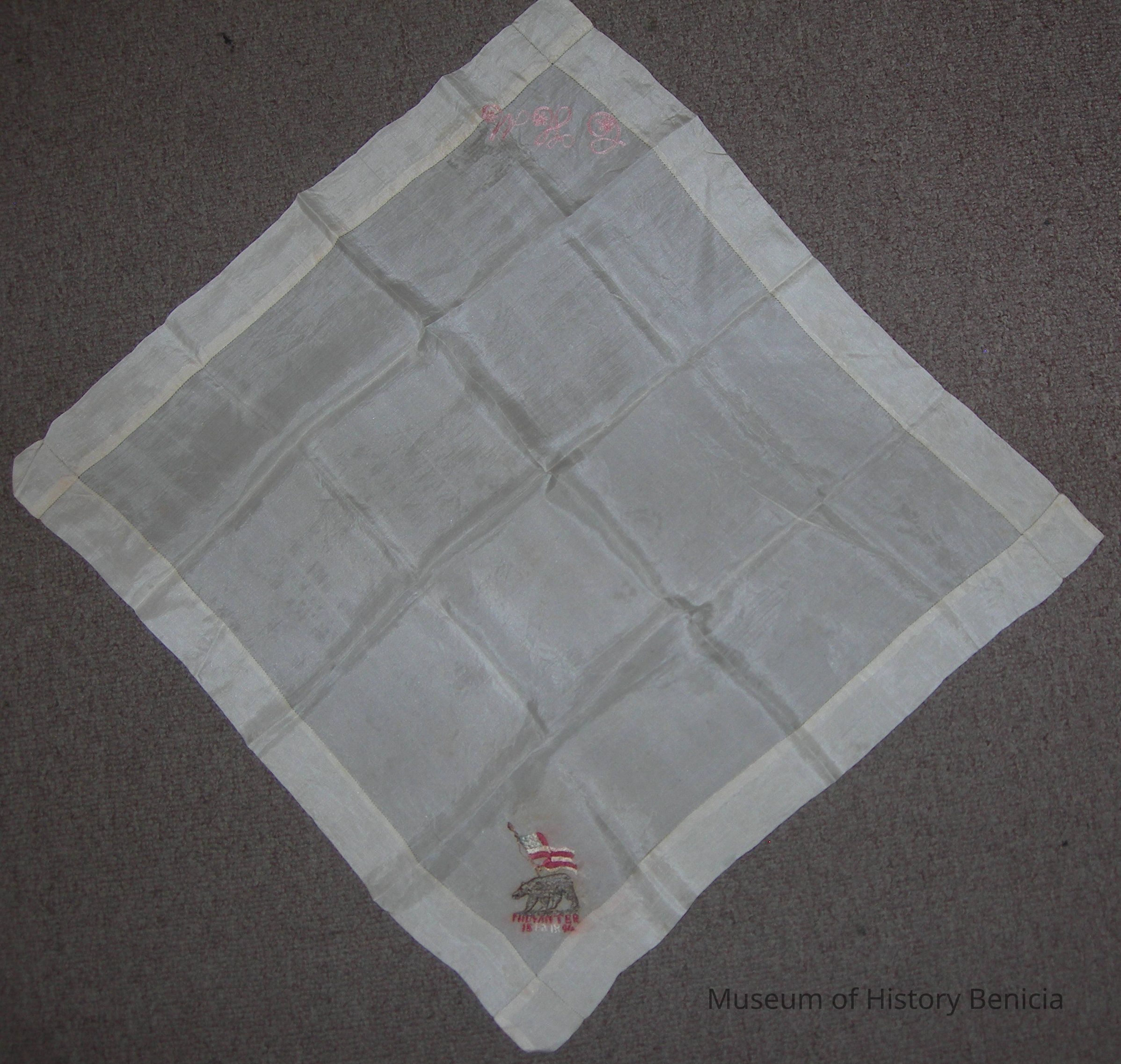 Silk Handkerchief - embroidered logo (brown bear and U.S. Flag) of the California Midwinter Fair/Exposition which was held in San Francisco's Golden Gate Park in 1894. It was an "Orientalist" inspired exposition which lasted from January 27 to July 5, 1894. Some exhibits from the Chicago Fair of 1893 were moved here. Some elements from 1894 remain in the park today: The Japanese Tea Garden, and the Fine Arts Building which became the De Young Museum (to name two). This was the first American International Expositon to be held west of Chicago and 2-1/2 million people attended.