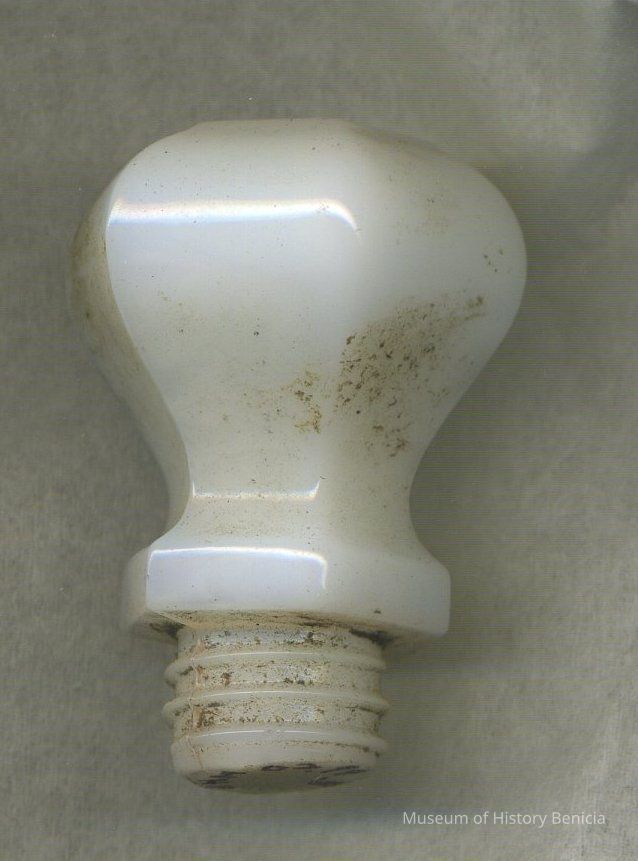 Cabinet door or drawer knob; white, opaque glass; threaded; 1-3/4" high, 1-1/4" wide, 1/2" diameter at threaded end.