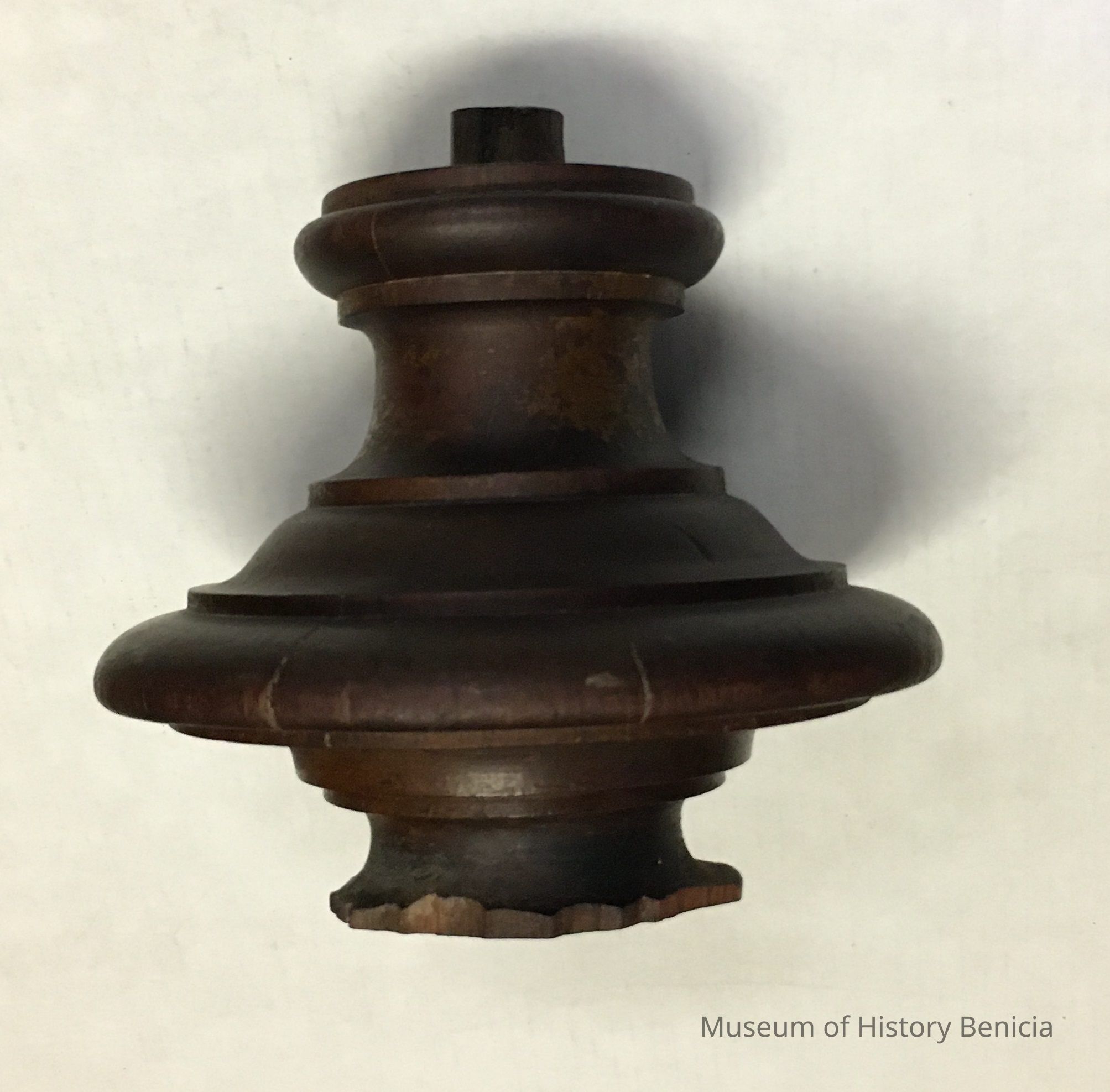 Small wood staircase circular cap from the Hastings mansion. 7 inches in height, several diameters, 7" is largest, bottom is 4" diameter. Wood is walnut. c1880s.Collection