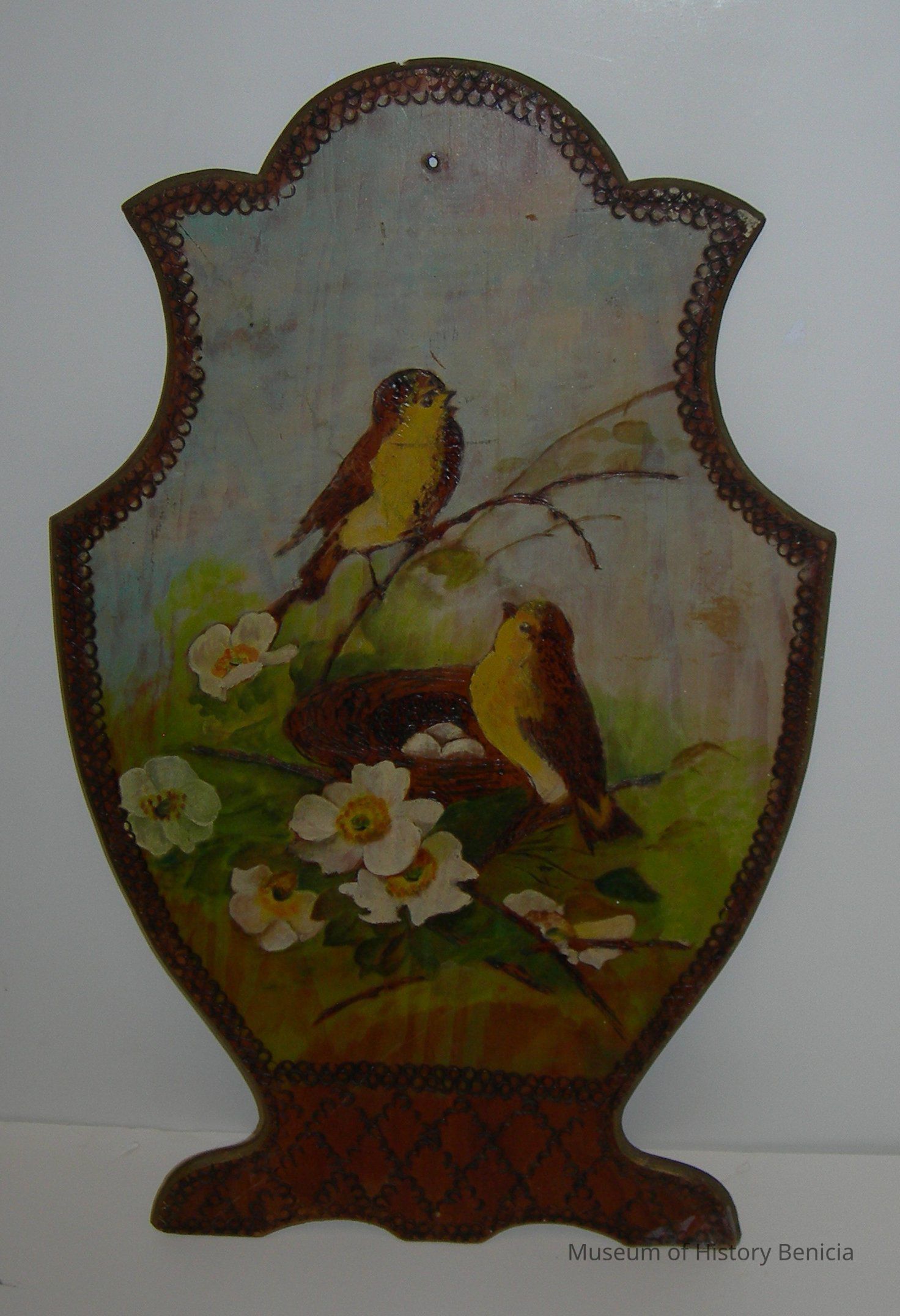 Wooden wall hanging depicting two birds, a nest, and blossoms. Has edging and base designed with etching. Looks to be handmade. Figures look as if they have been carved into the wooden backing and then painted. Some stains, nicks, and fading. It was made by Lillian Eggen's husband.Collection