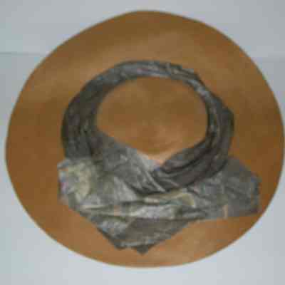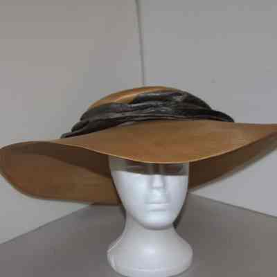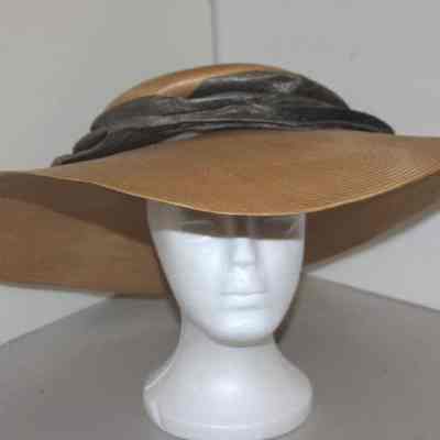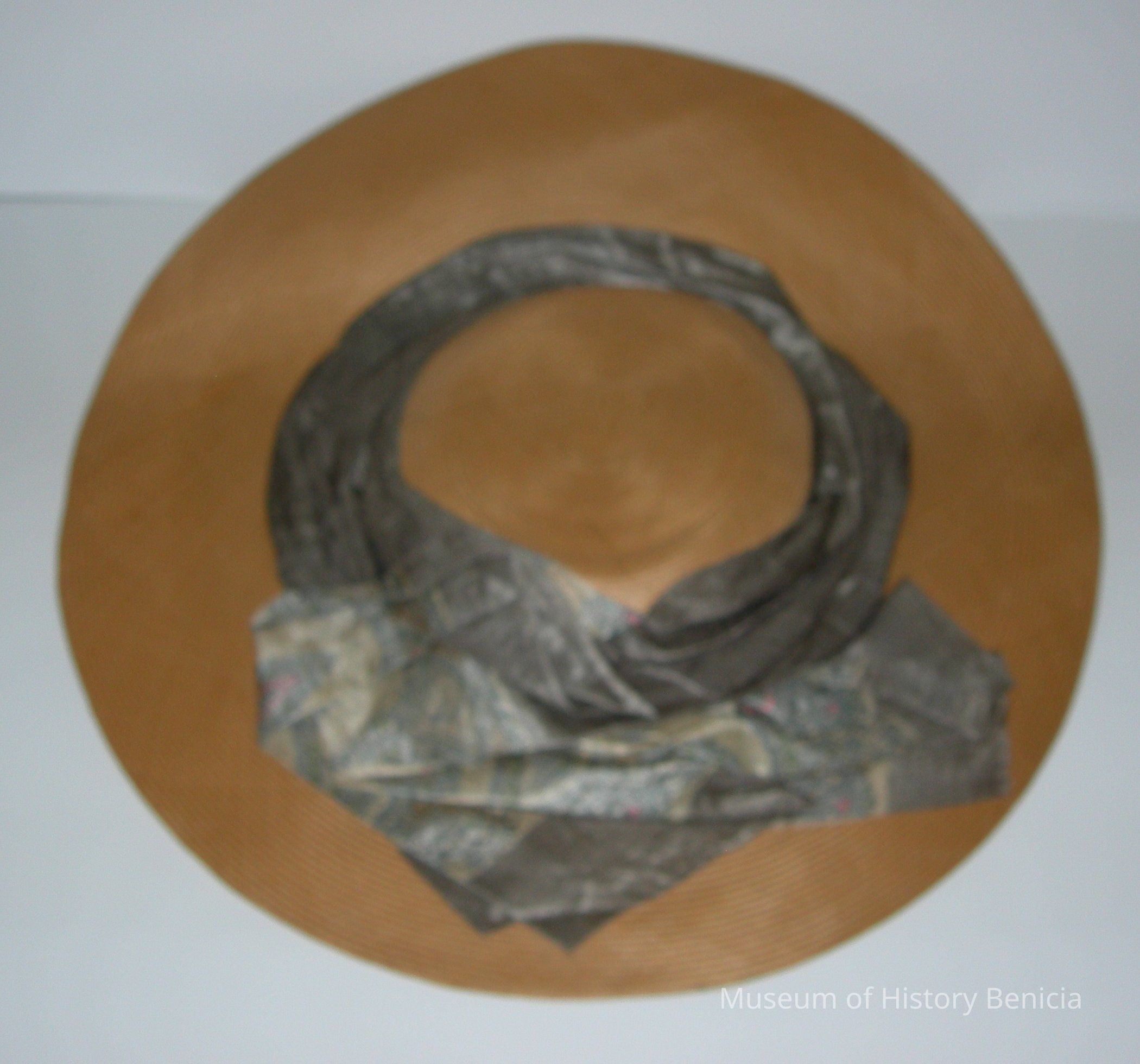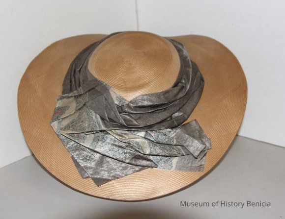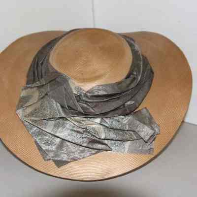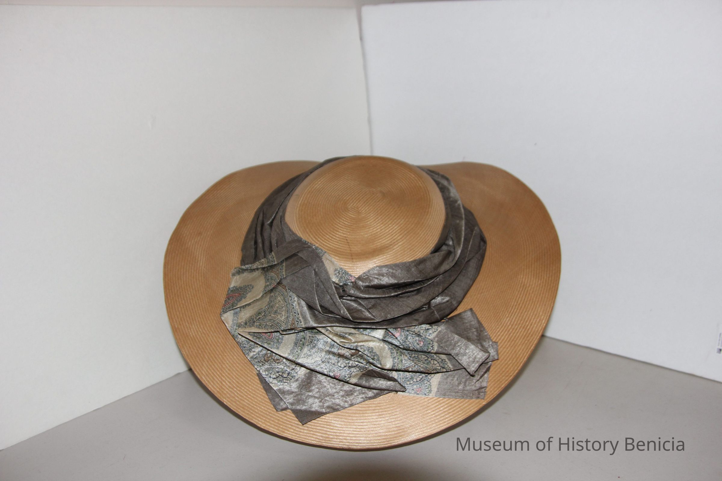 flat, thin, straw hat (dull yellow/gold/beige) with silk scarf stitched and attachd around outer crown, scarf in silk with gray as the main color and a paisly design of beige/blue/pink/black; lining beneath scarf to add support to itCollection