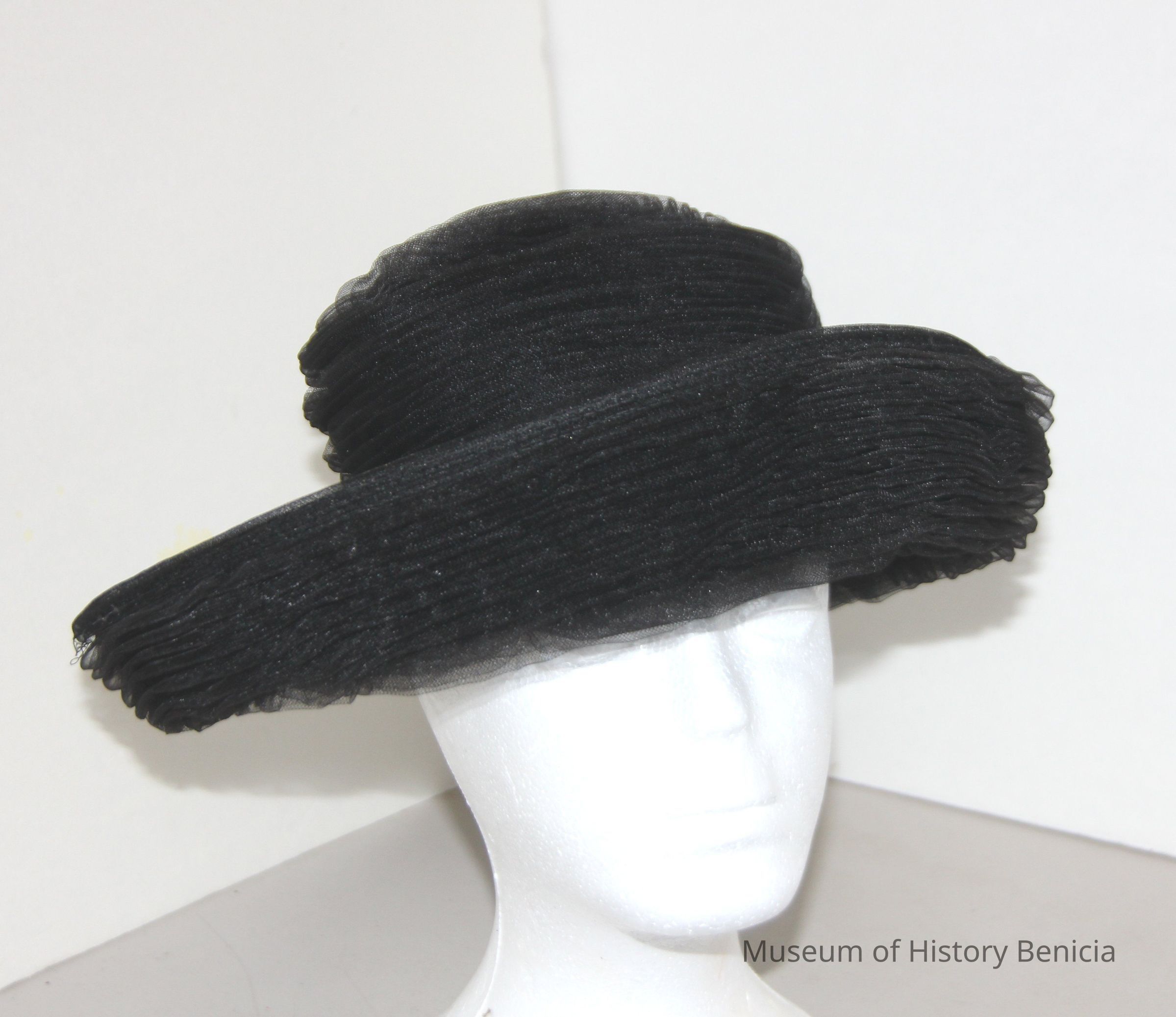 Black large upturned brim covered with black organza narrow pleats, straw base.